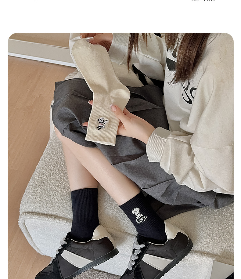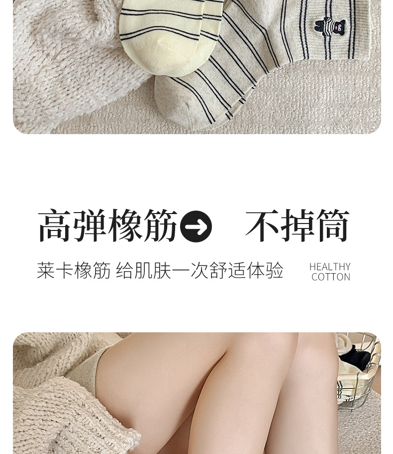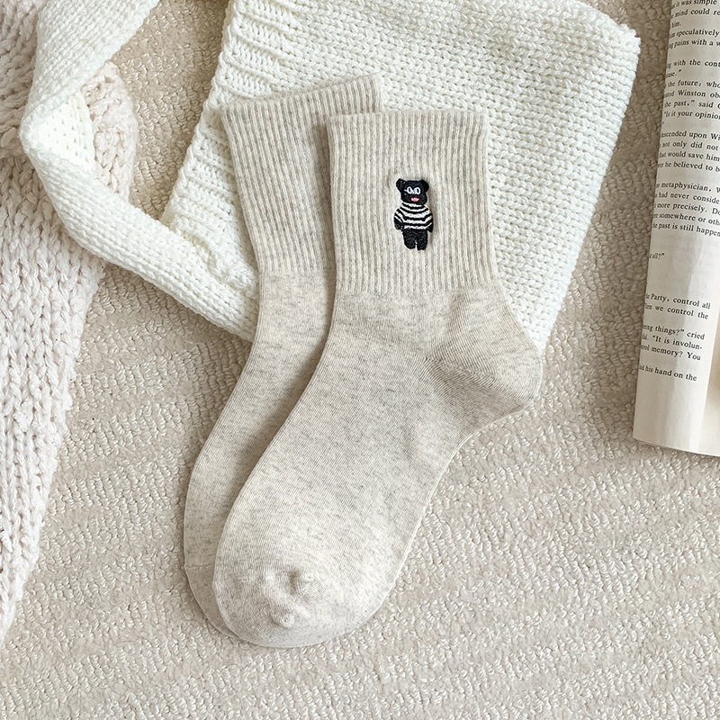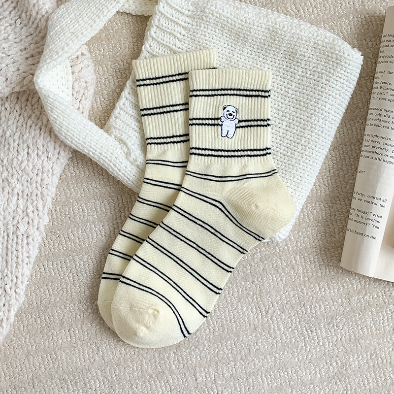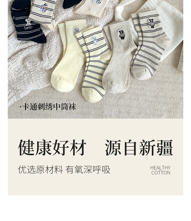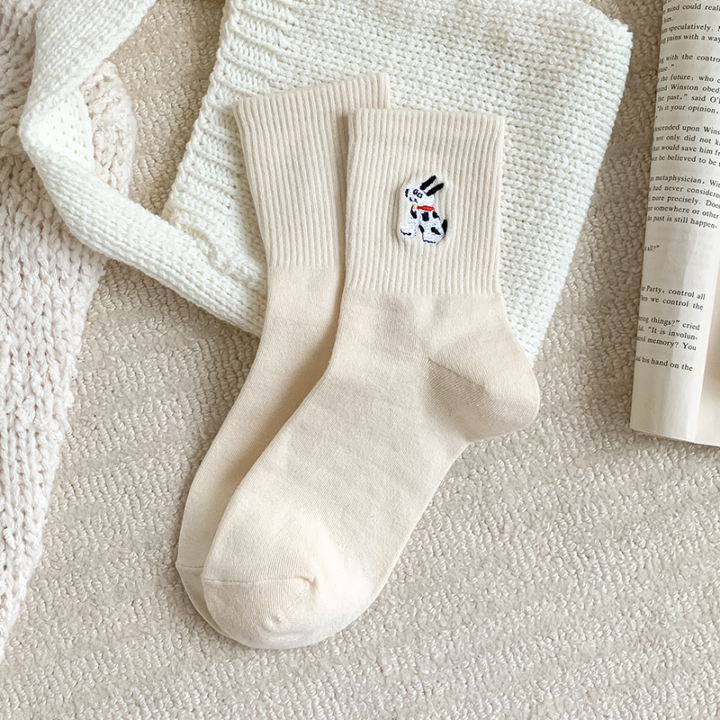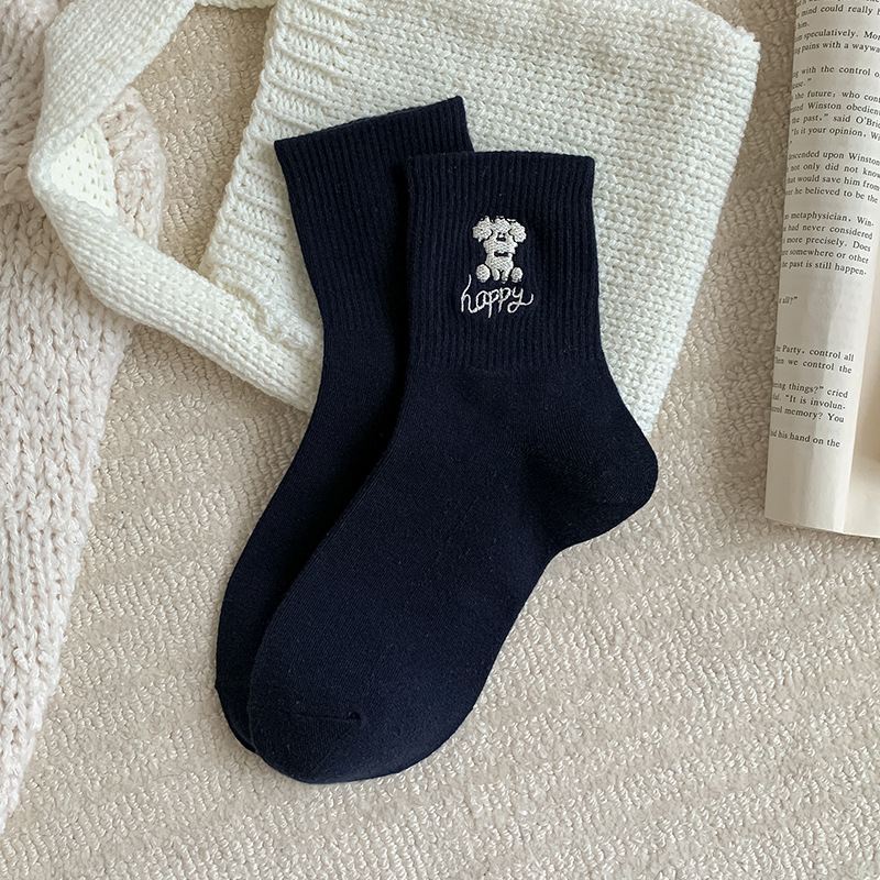 양말 여성용 가을면 양말 귀여운 개 자수 스트라이프 튜브 양말 안티 필링 뼈없는 여성용 양말 도매