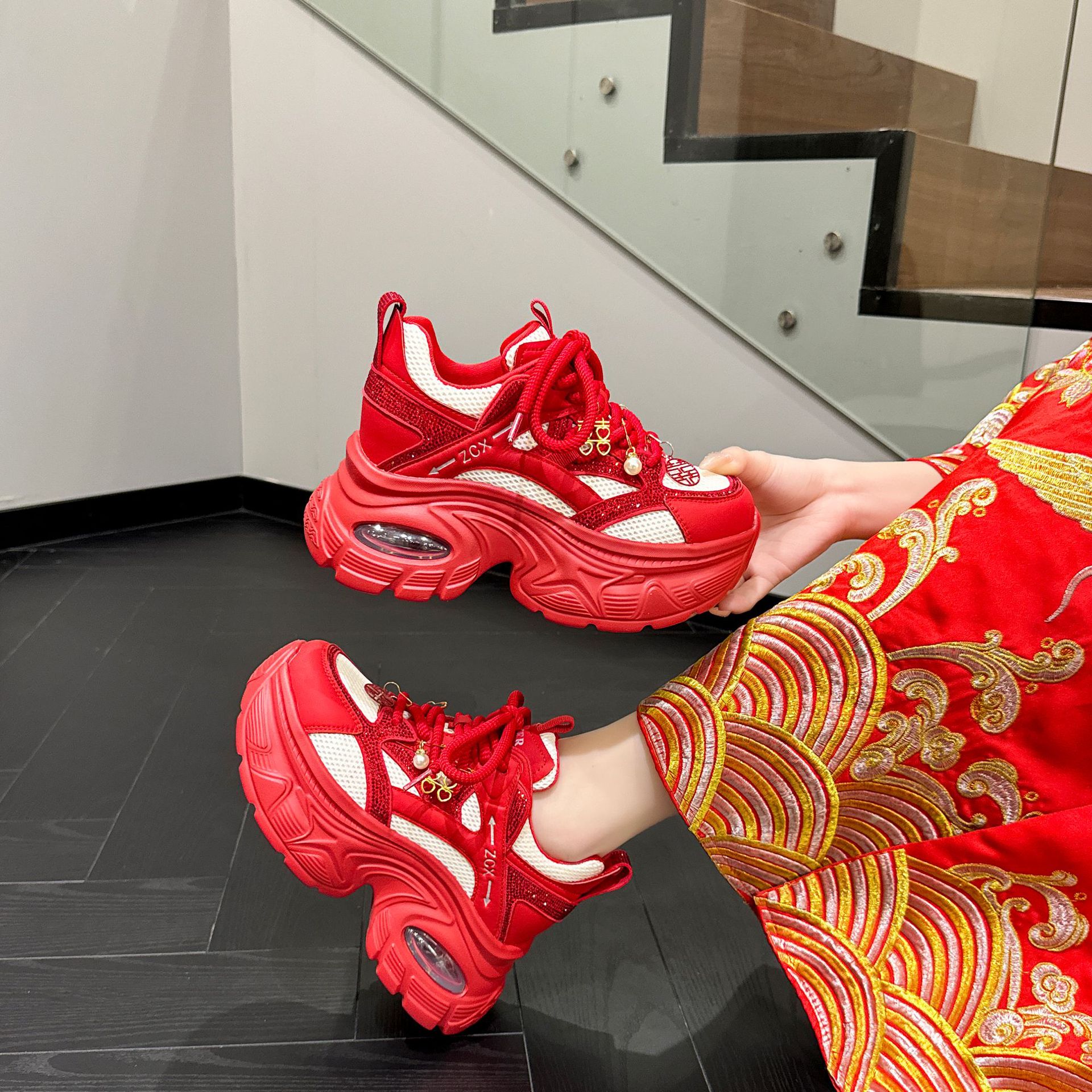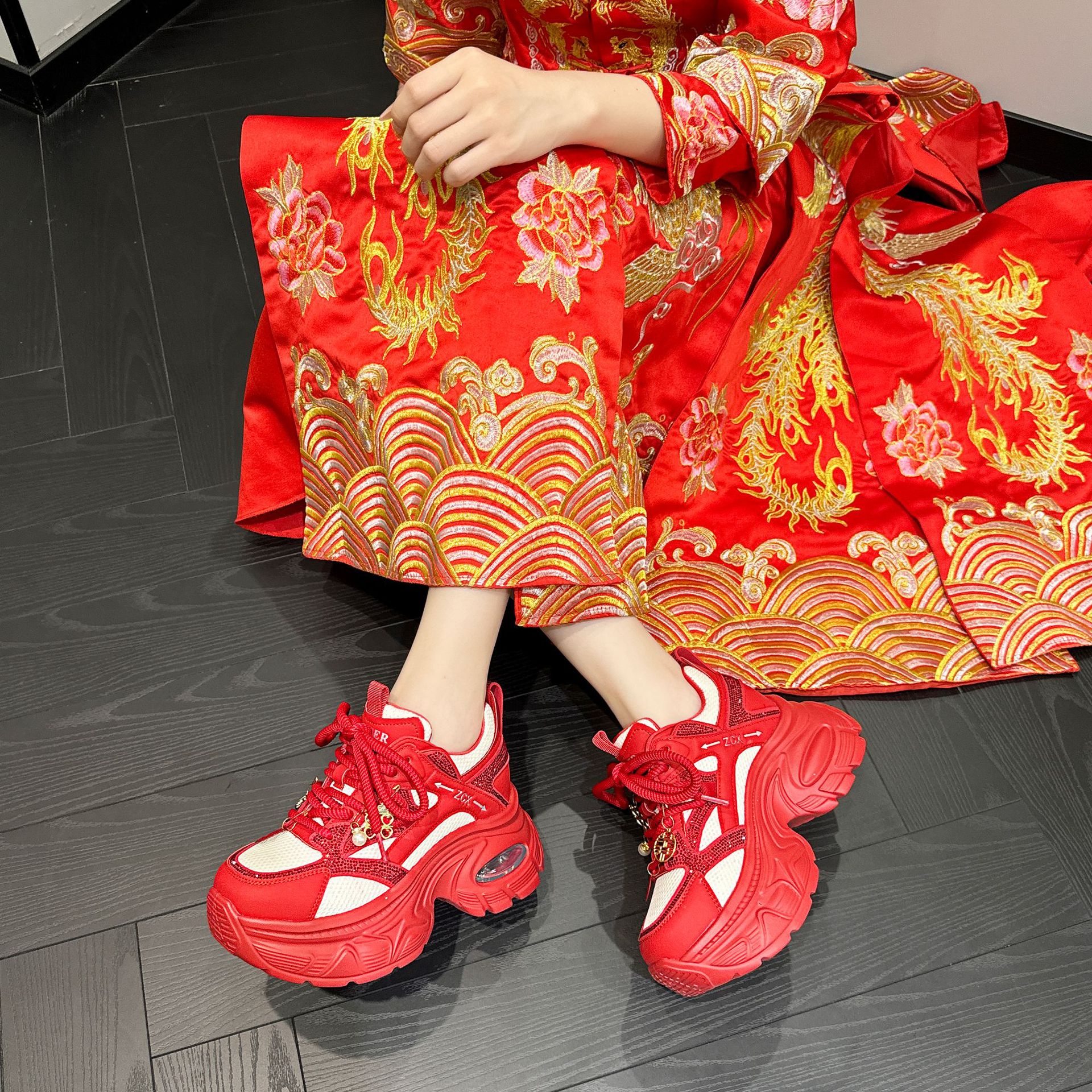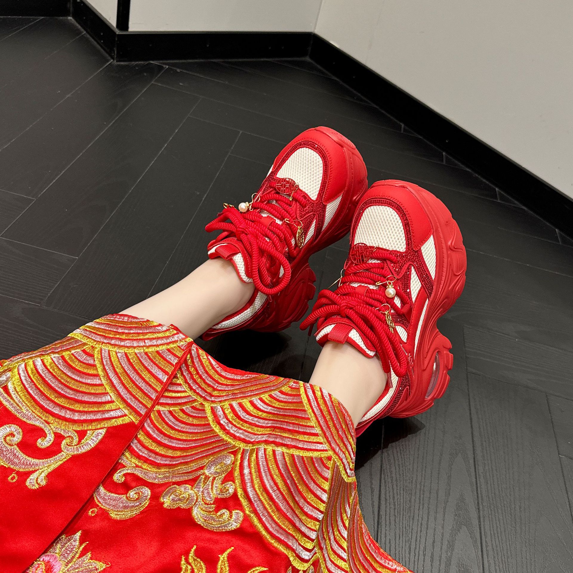2025년 신상 여성용 축혼식 신발, 빨간색 하이힐, 키높이 두꺼운 밑창 운동화, 신부 들러리 신발
