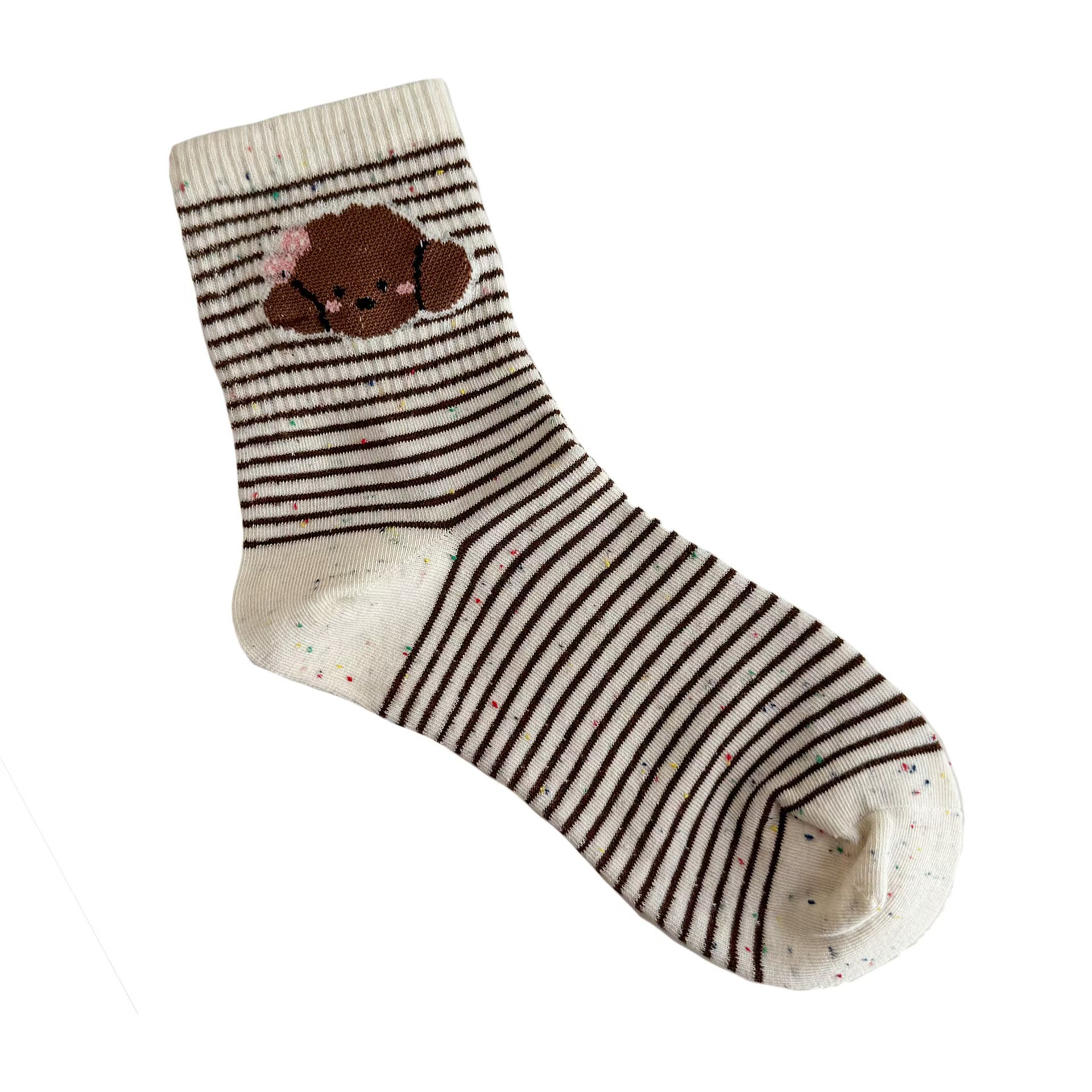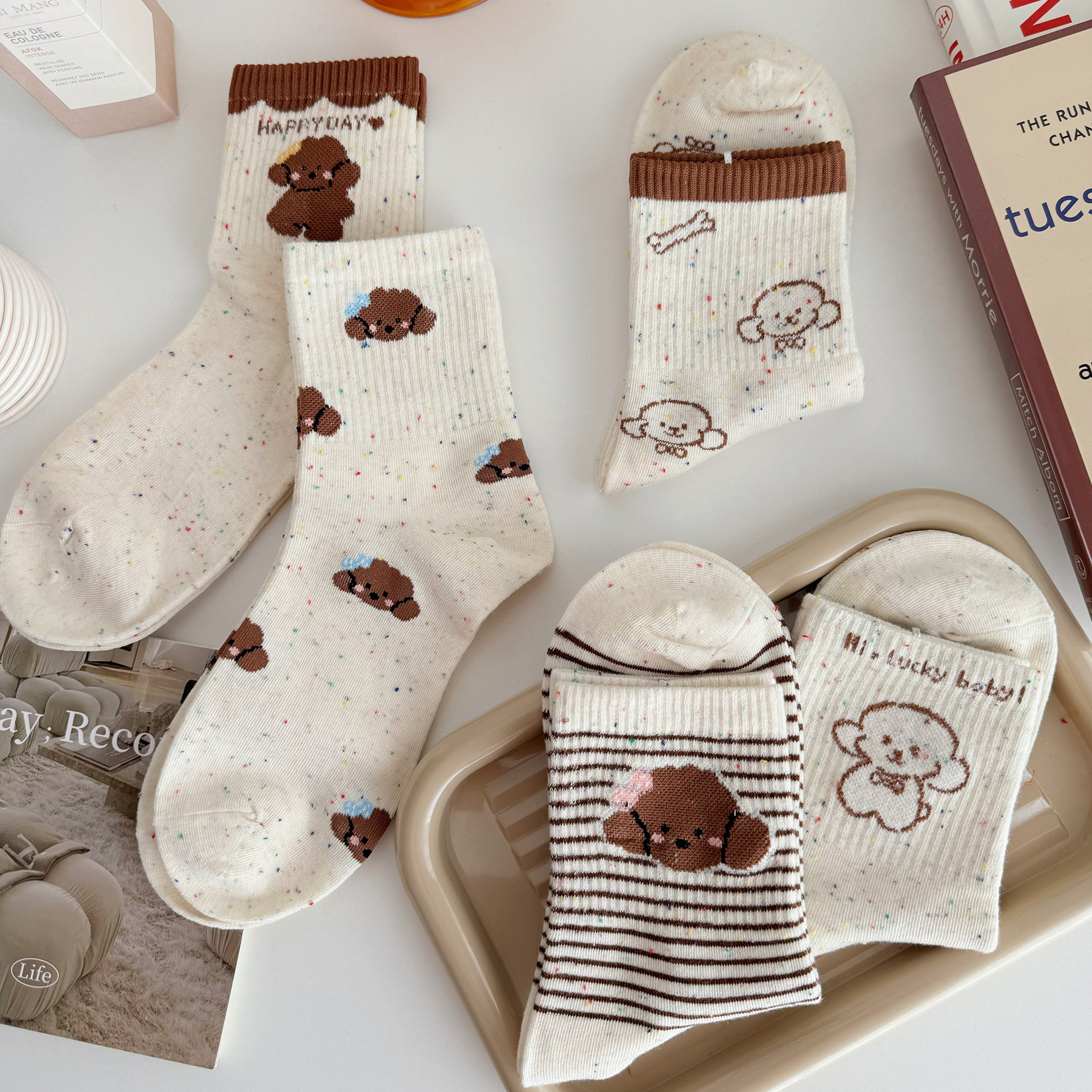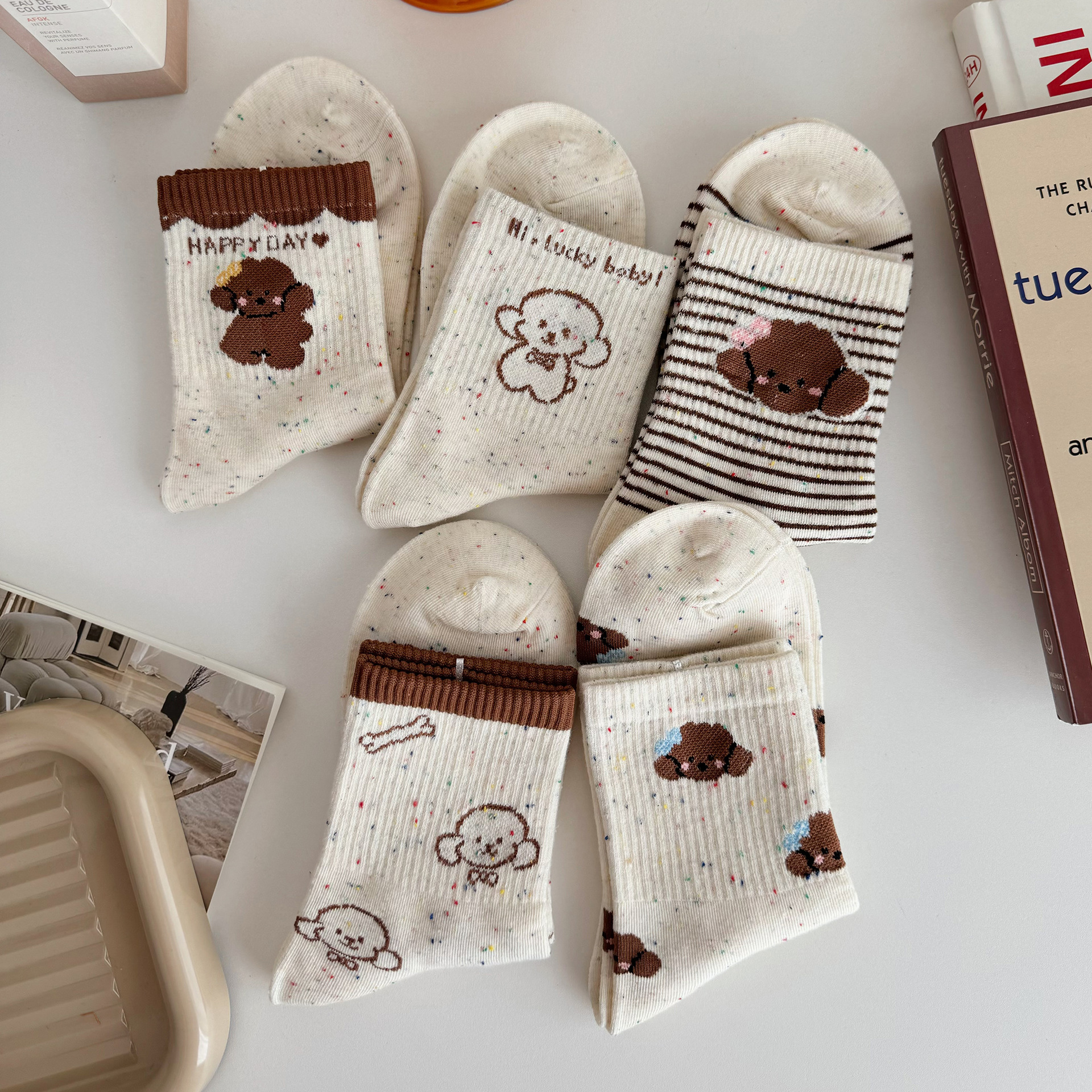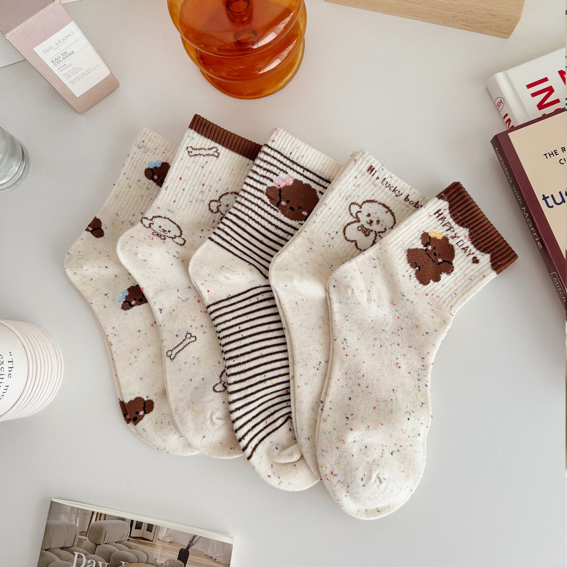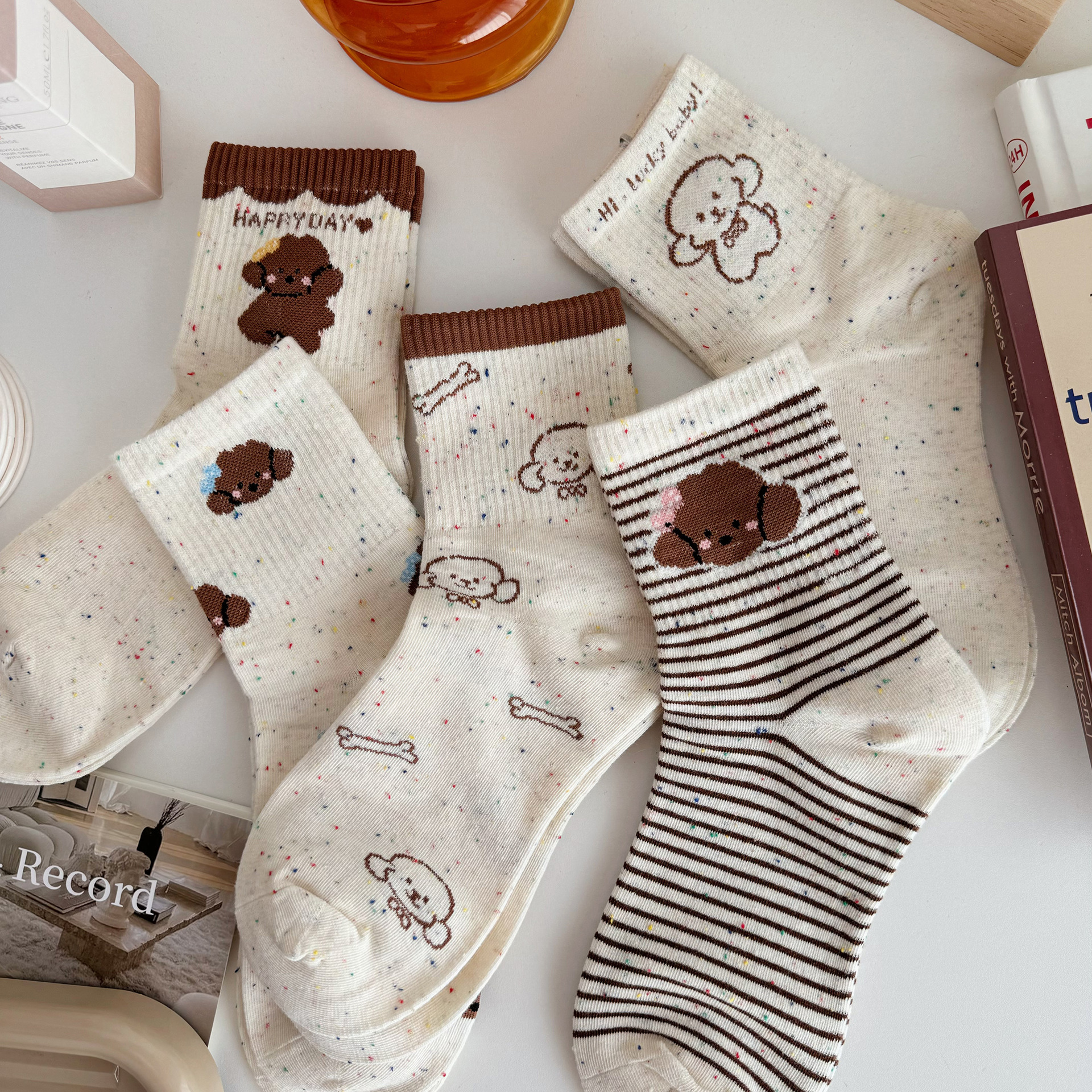 새로운 스타일 양말 여성 만화 귀여운 강아지 중간 길이 양말 다크 브라운 스타일 포인트 원사 스포츠 양말 면 통기성 스택 양말