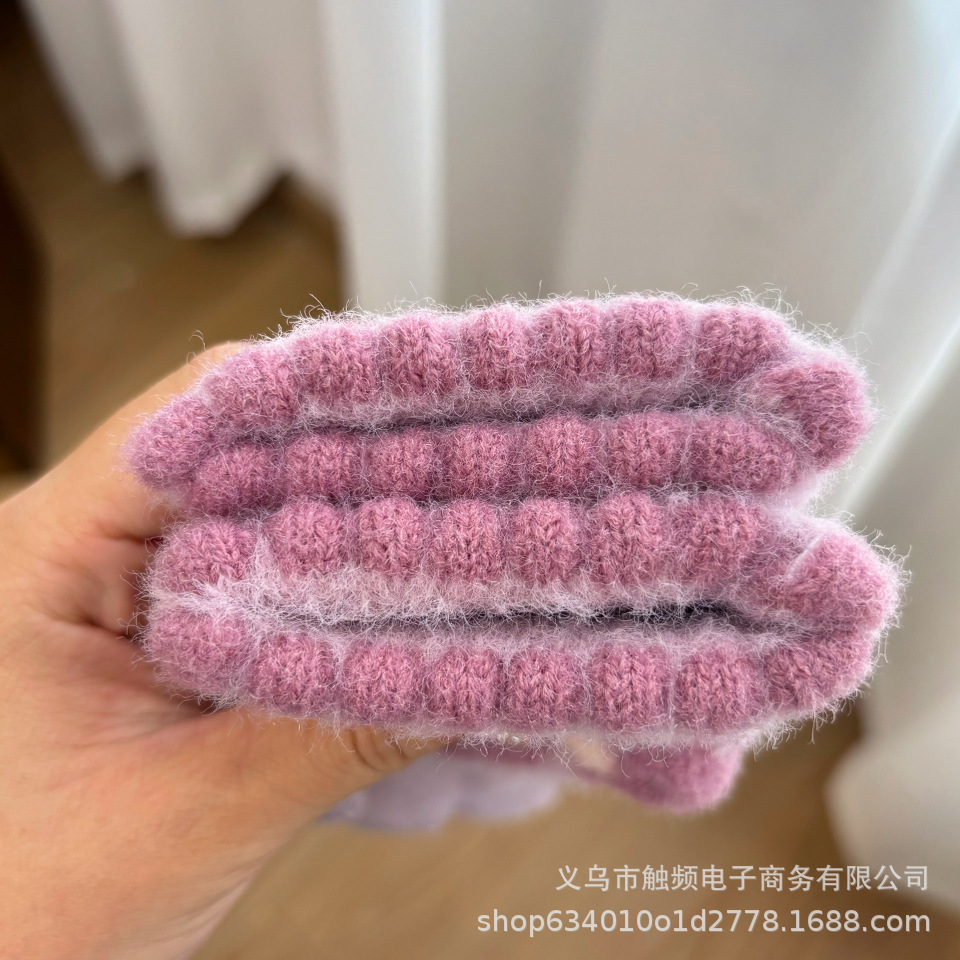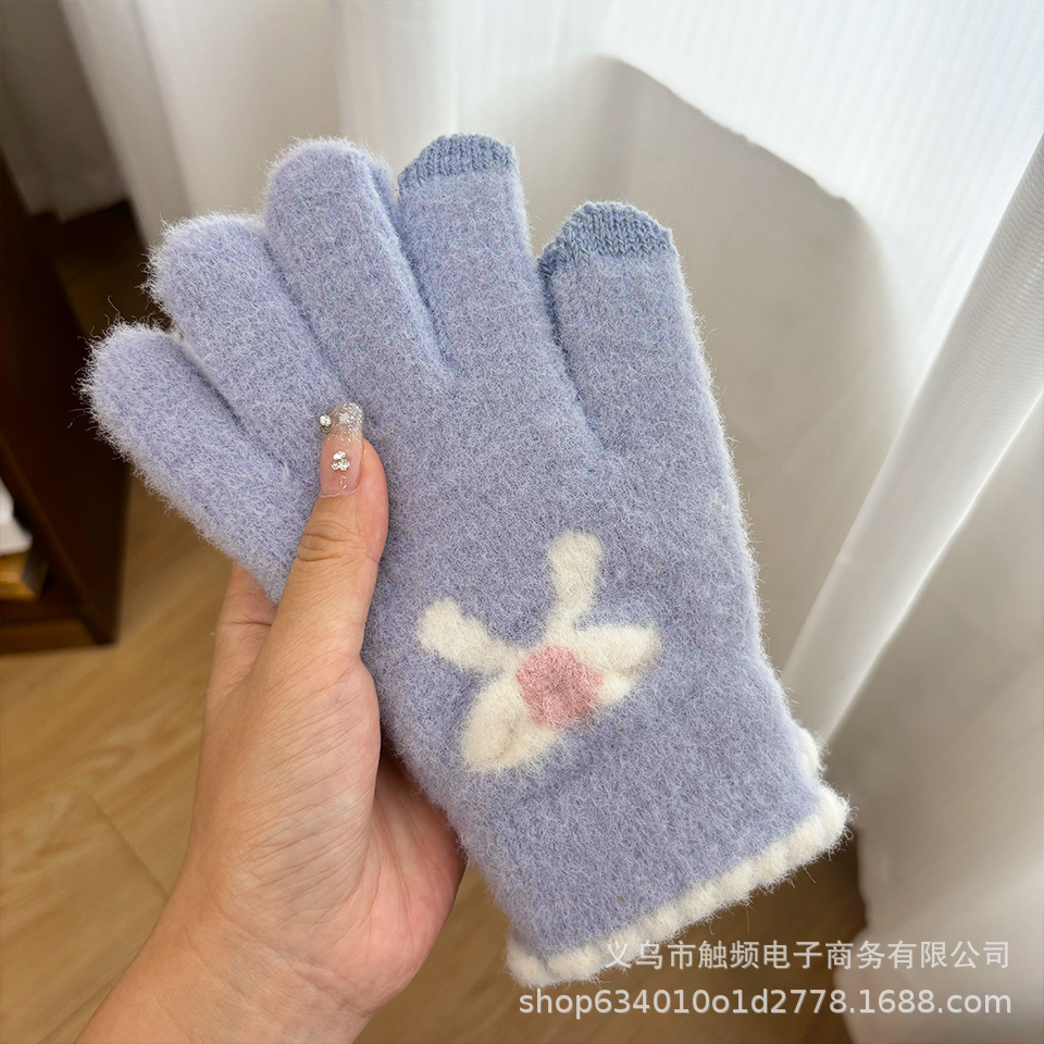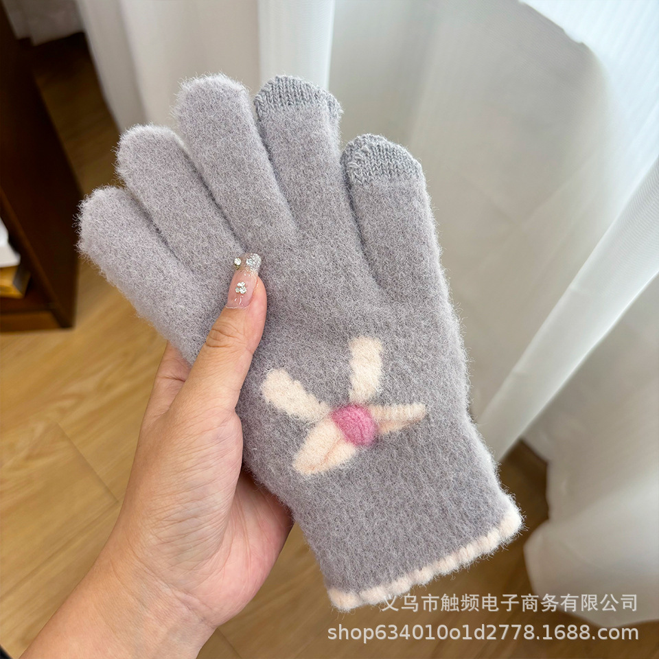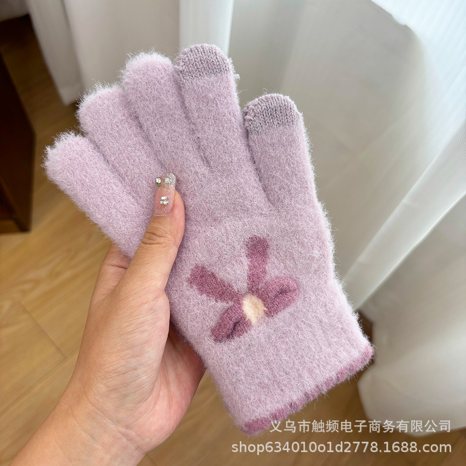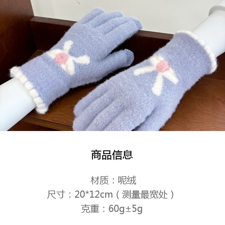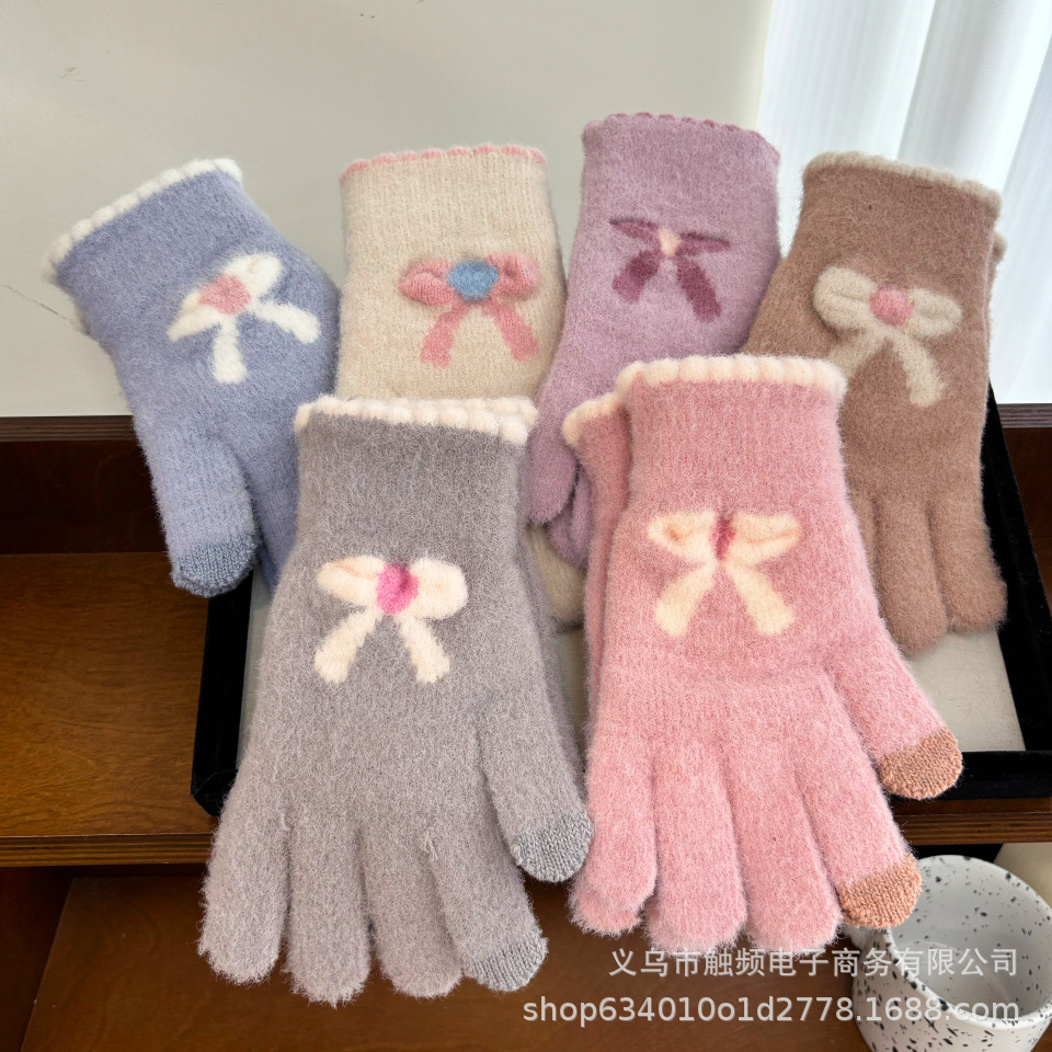한국 스타일 달콤한 니트 따뜻한 장갑 여성의 겨울 방한 두꺼운 Ins 스타일 활 자카드 터치 스크린 풀 핑거스토어 가기