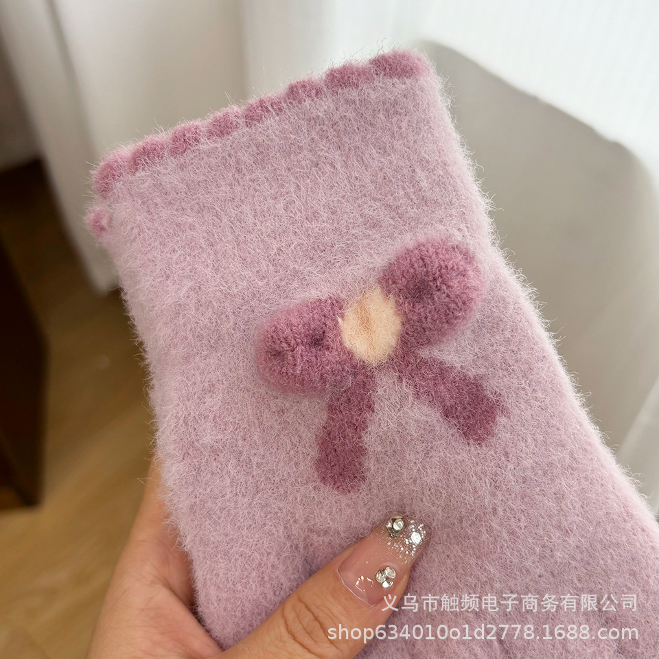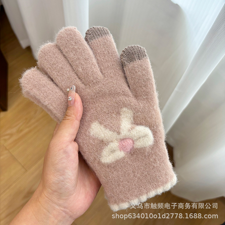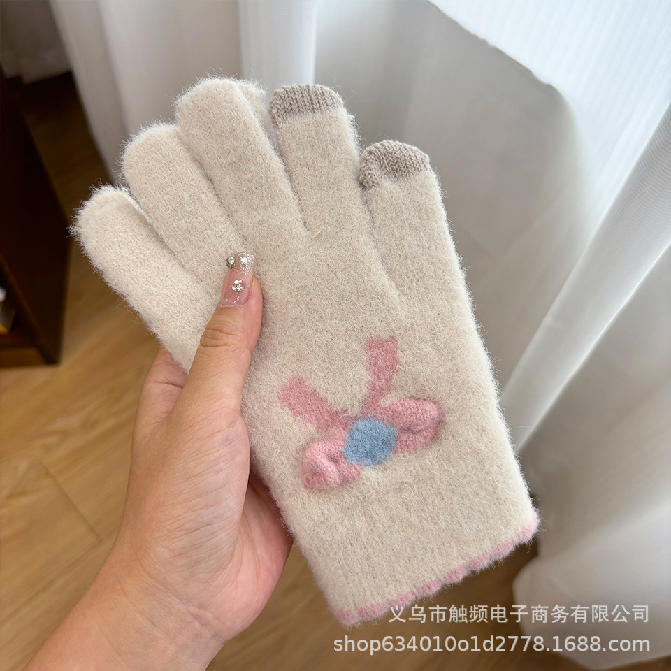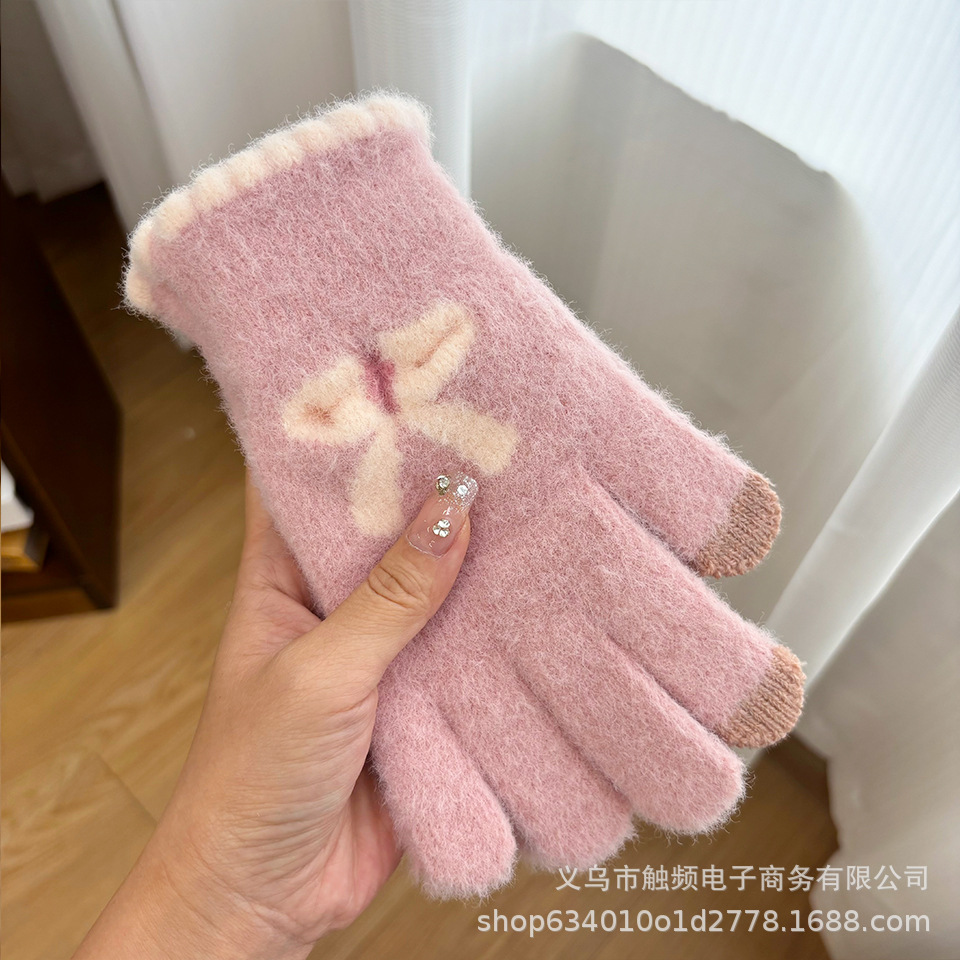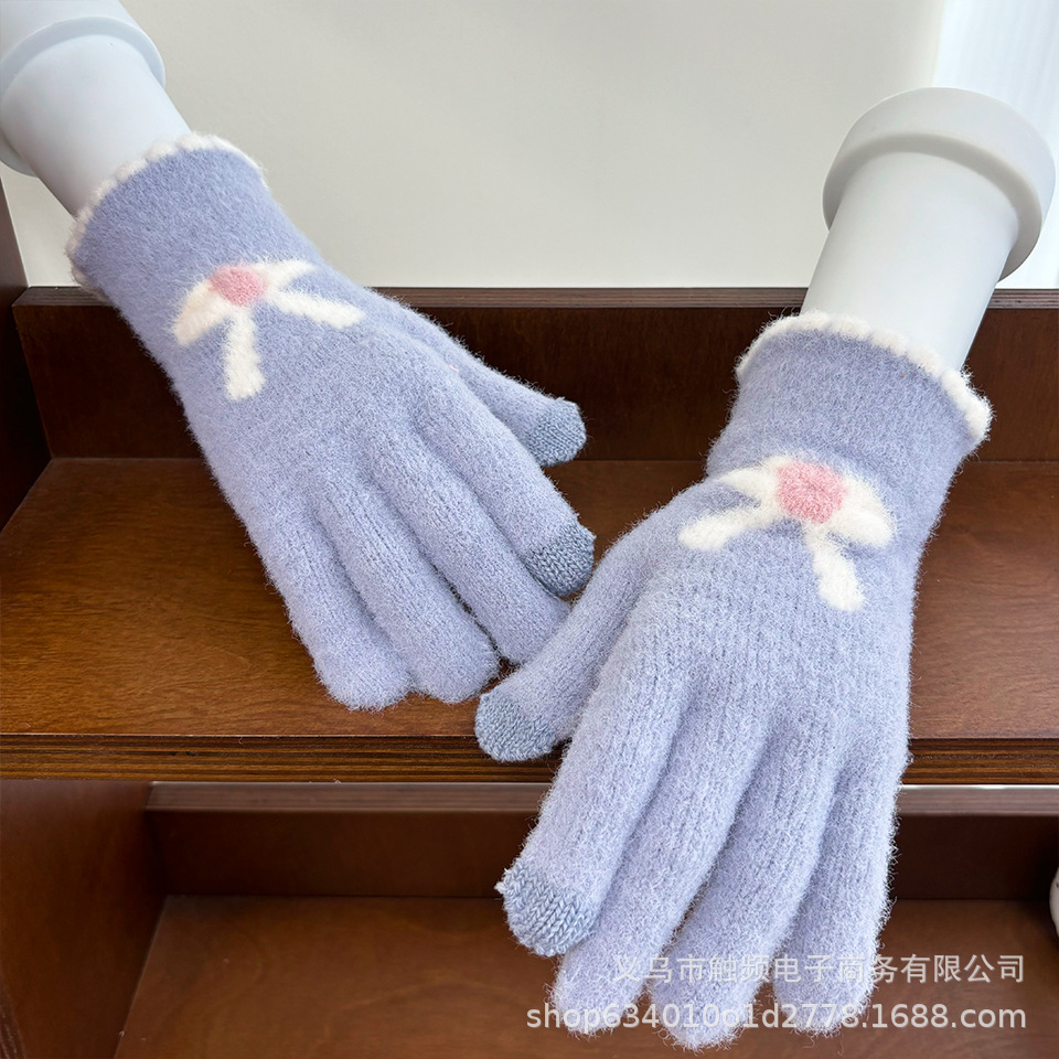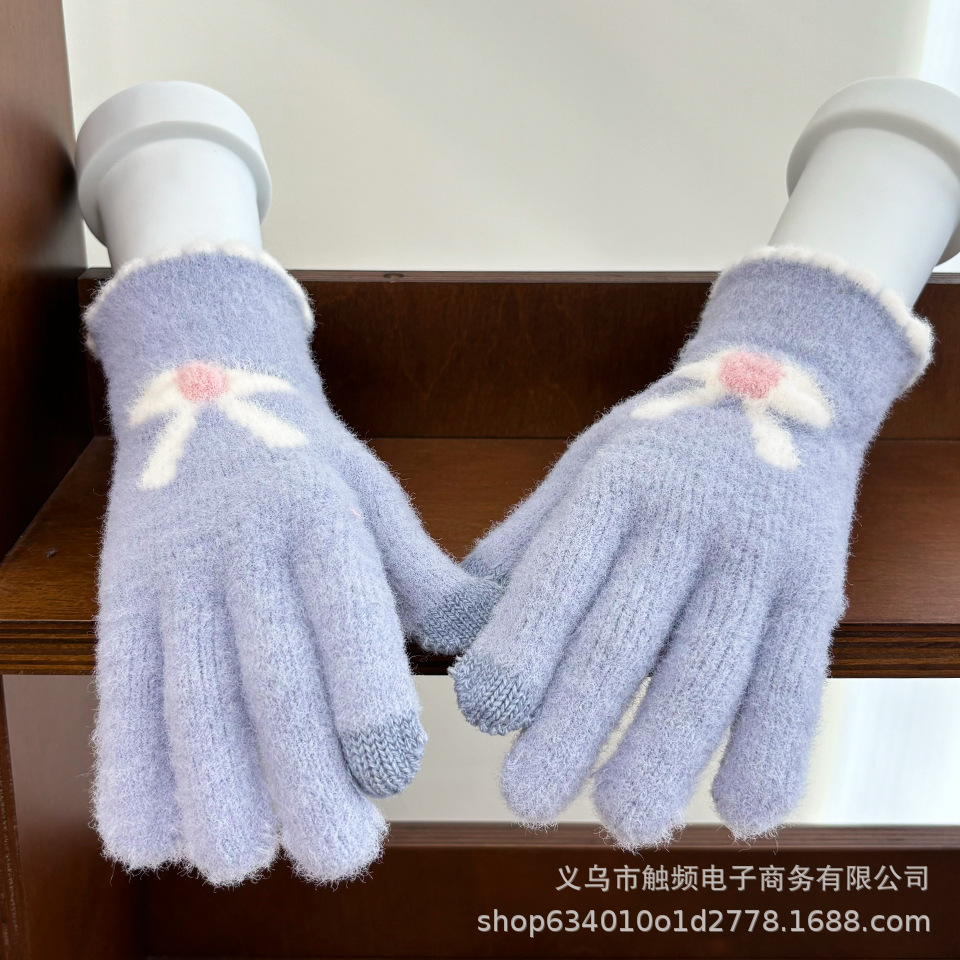 한국 스타일 달콤한 니트 따뜻한 장갑 여성의 겨울 방한 두꺼운 Ins 스타일 활 자카드 터치 스크린 풀 핑거