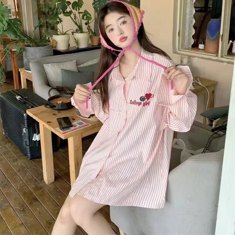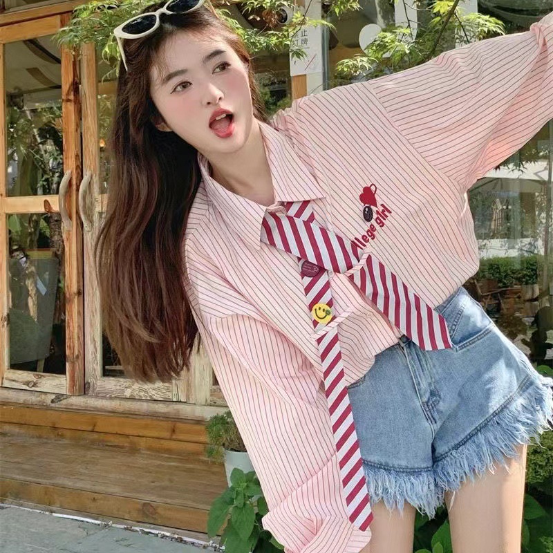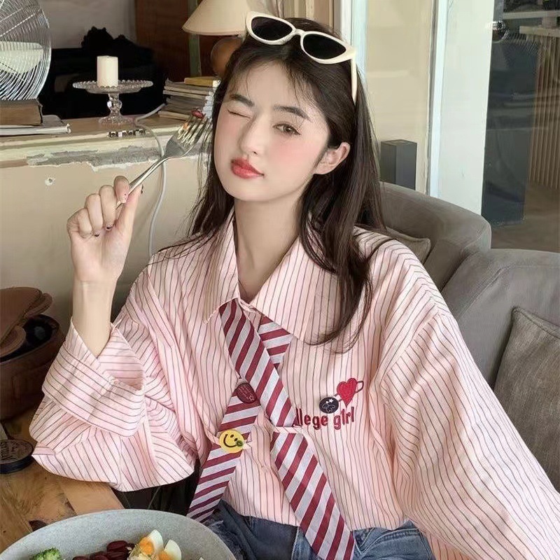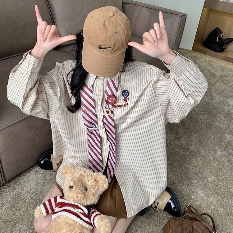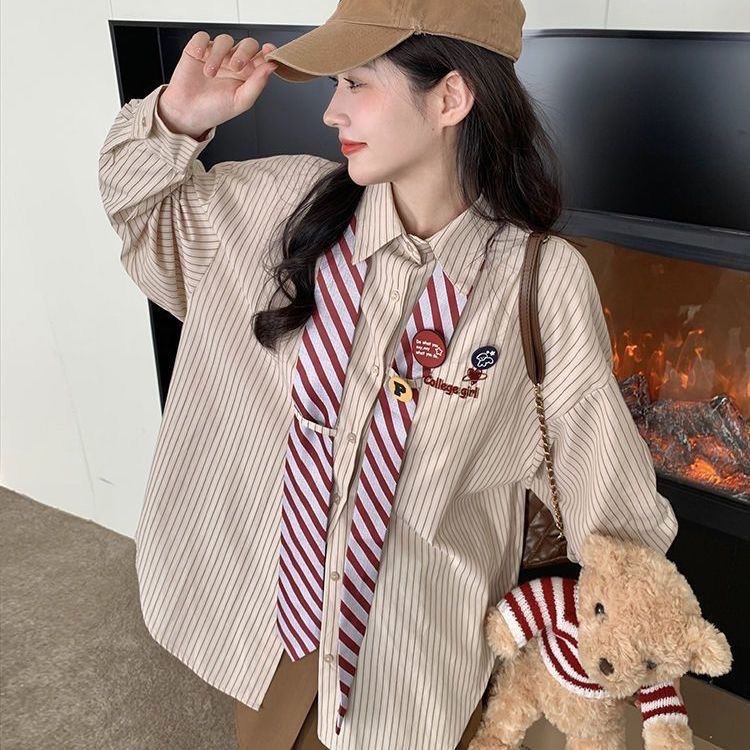 아메리칸 빈티지 프레피 셔츠 긴팔 여성 신작 디자인 타이 스트라이프 셔츠 여성상의스토어 가기