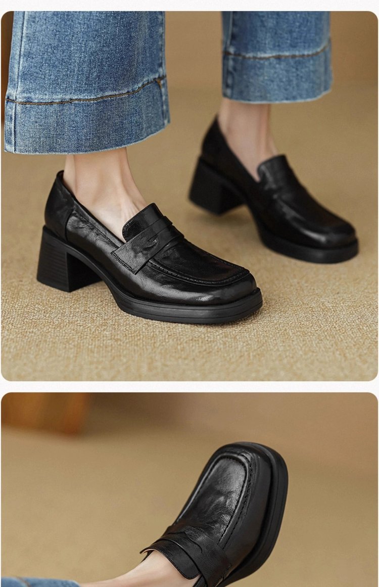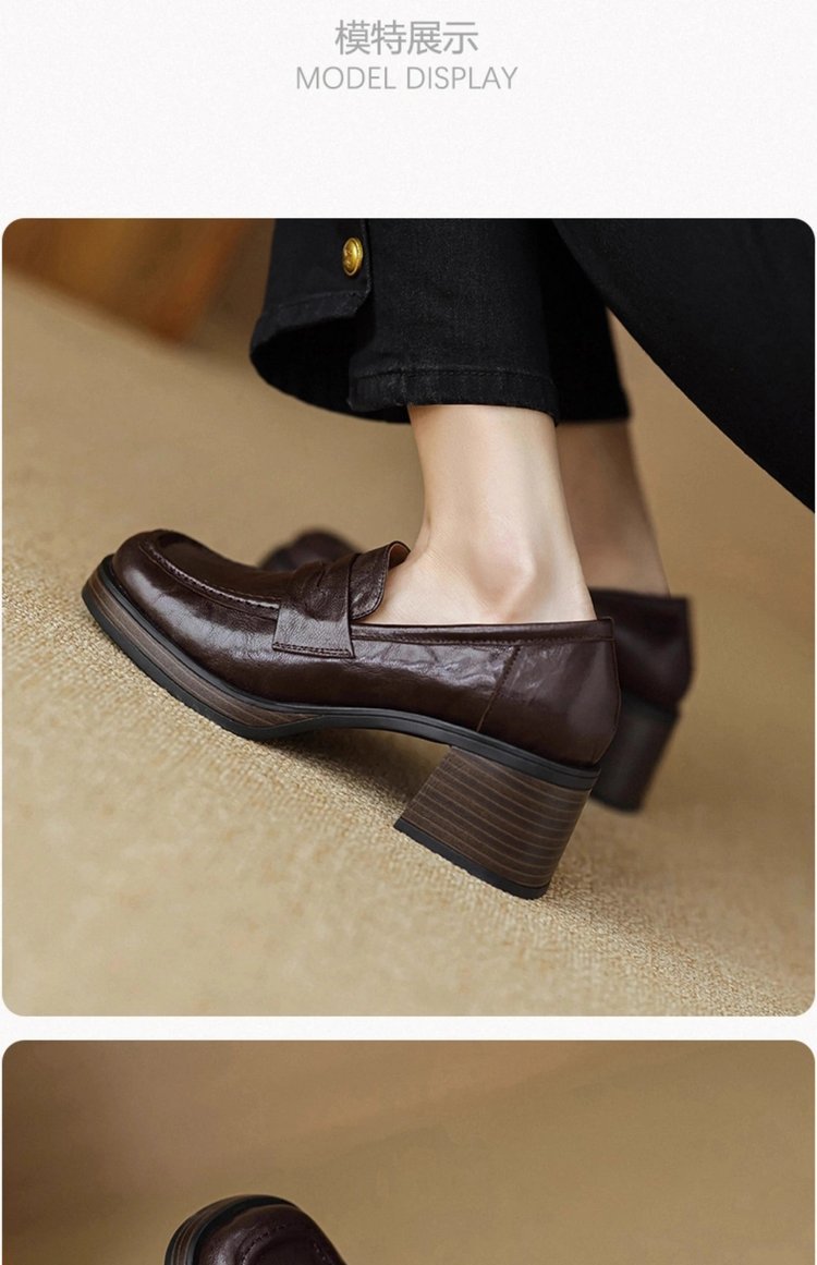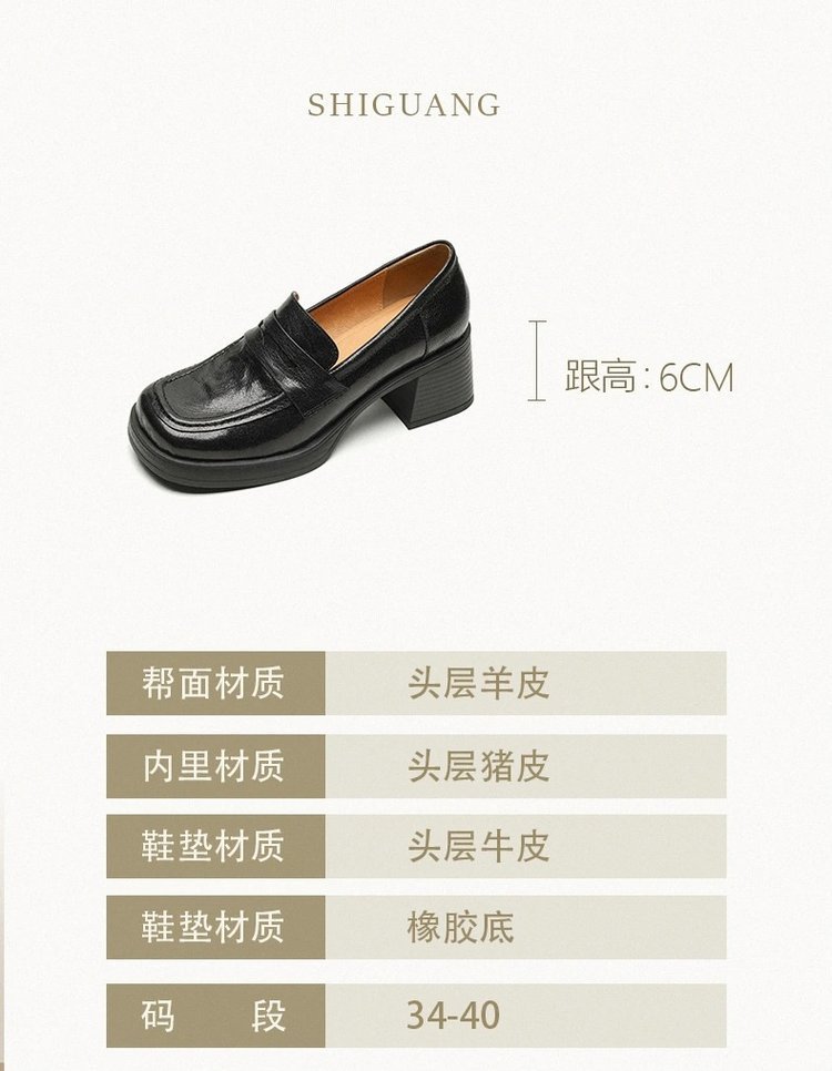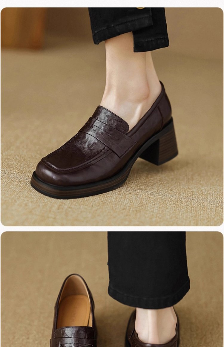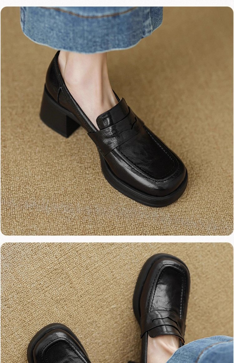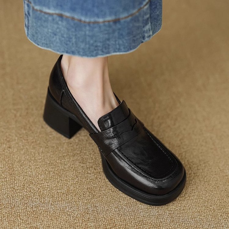 2025년 초봄 신상품 천연가죽 두꺼운 굽 스퀘어토 두꺼운 밑창 슬립온 로퍼 레트로 하이힐 여성용 가죽 슈즈스토어 가기