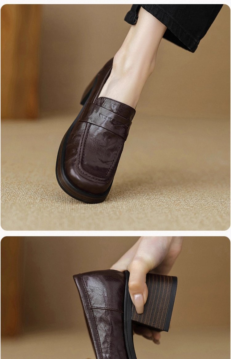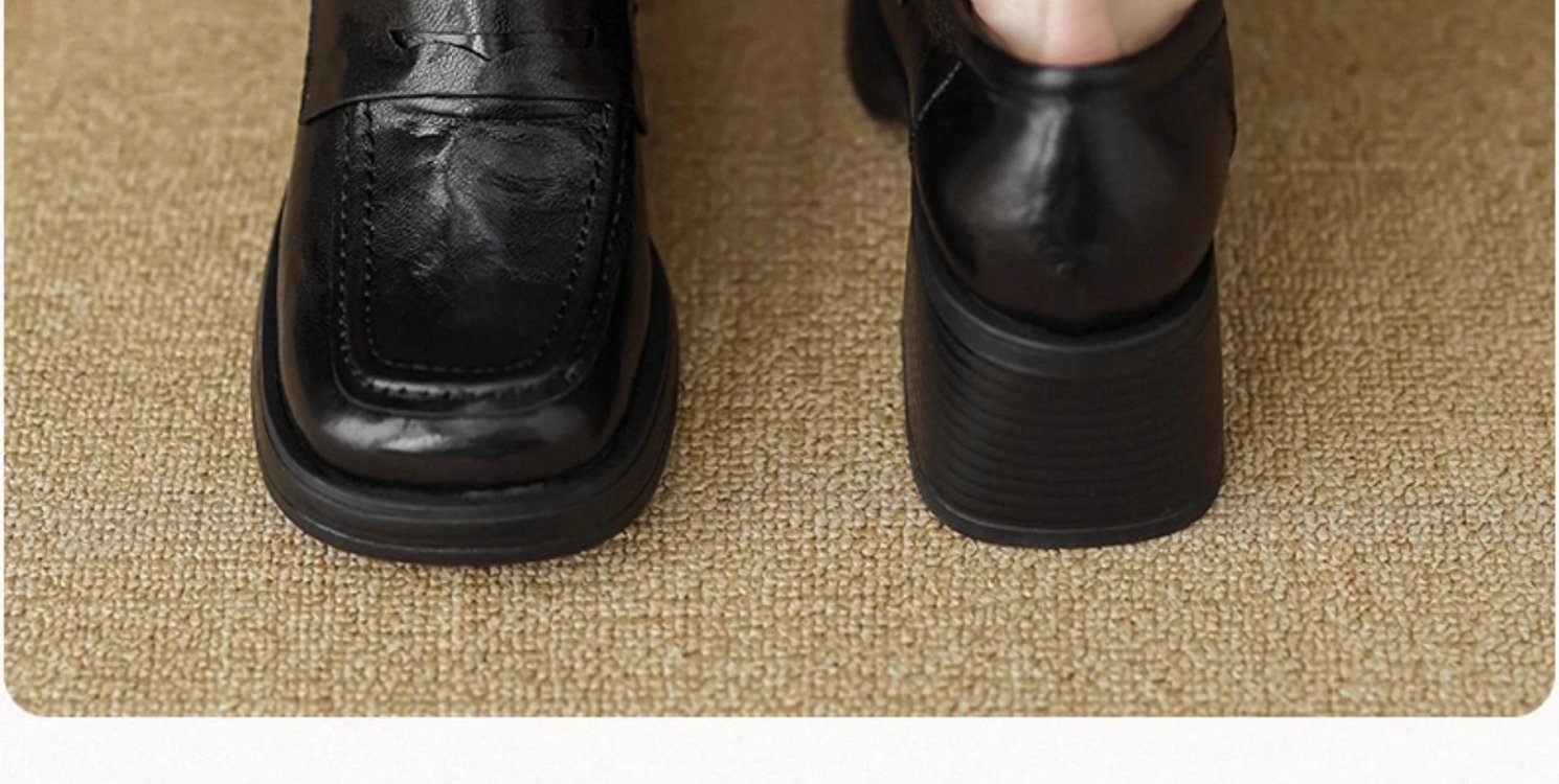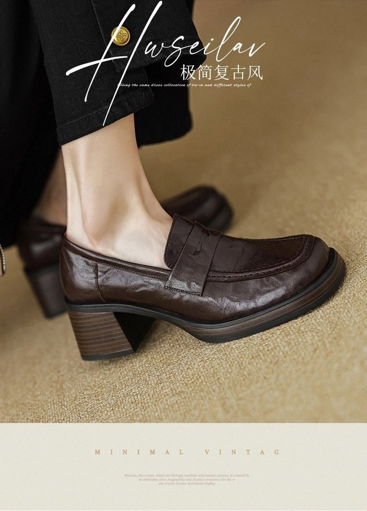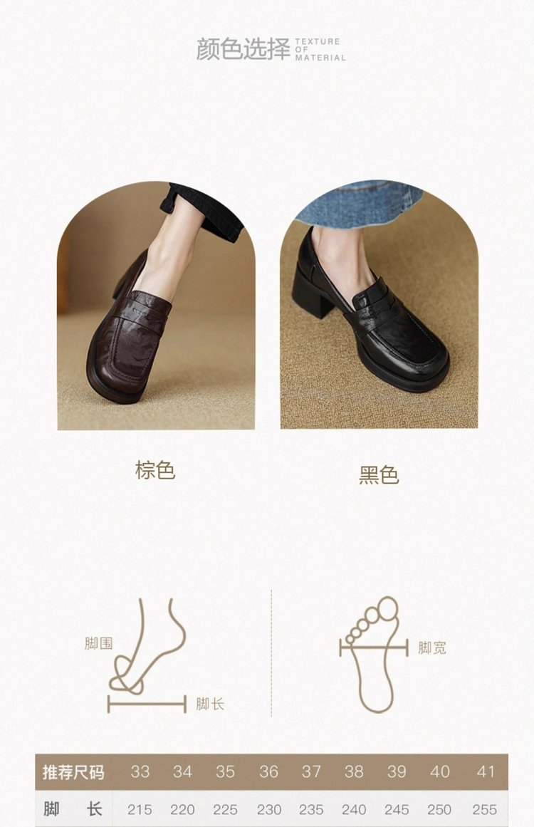 2025년 초봄 신상품 천연가죽 두꺼운 굽 스퀘어토 두꺼운 밑창 슬립온 로퍼 레트로 하이힐 여성용 가죽 슈즈스토어 가기