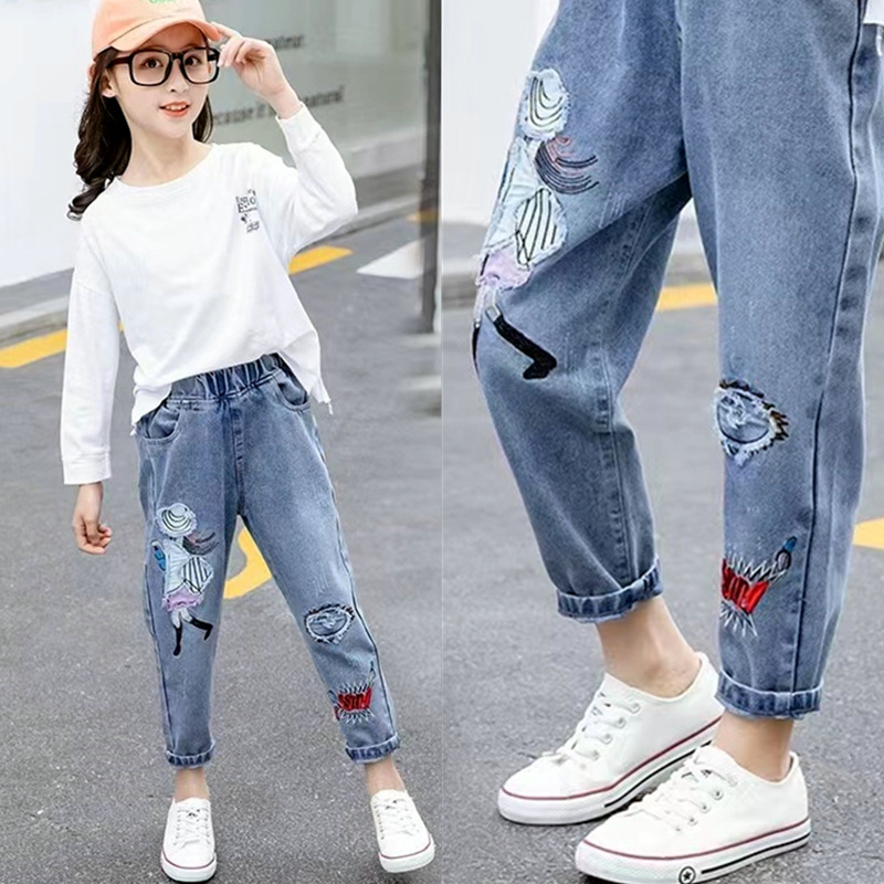 남학생과 여학생을 위한 봄, 가을 청바지, 중대형 아동 및 여아용 루즈한 베이비 캐주얼 스타일 스트레이트 팬츠, 공장 도매