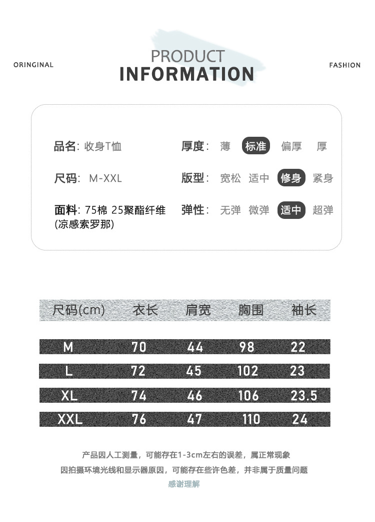 미국 250g 작은 목선 닫힌 몸 Solona 시원한 느낌 티셔츠 닫힌 커프스 캐주얼 탄성 통기성 피트니스 반팔 남성