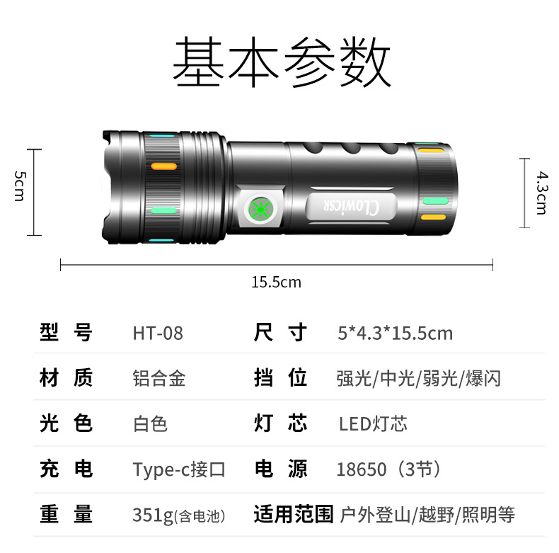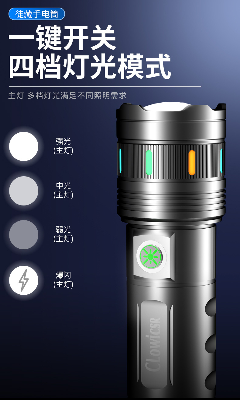 档位 :强光、中光、弱光、爆闪、(长按开关打开关闭)