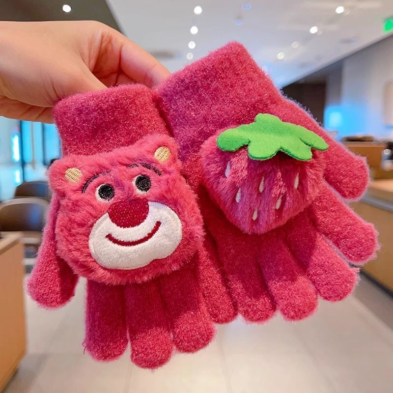 어린이용 만화풍 귀여운 딸기곰 장갑, 여아용 두꺼운 다섯 손가락 겨울용 장갑, 중년아동용 따뜻한 손가락 분리형 장갑, 추위를 예방하는 강화 기능