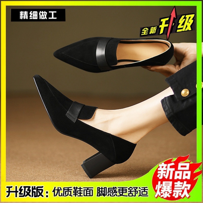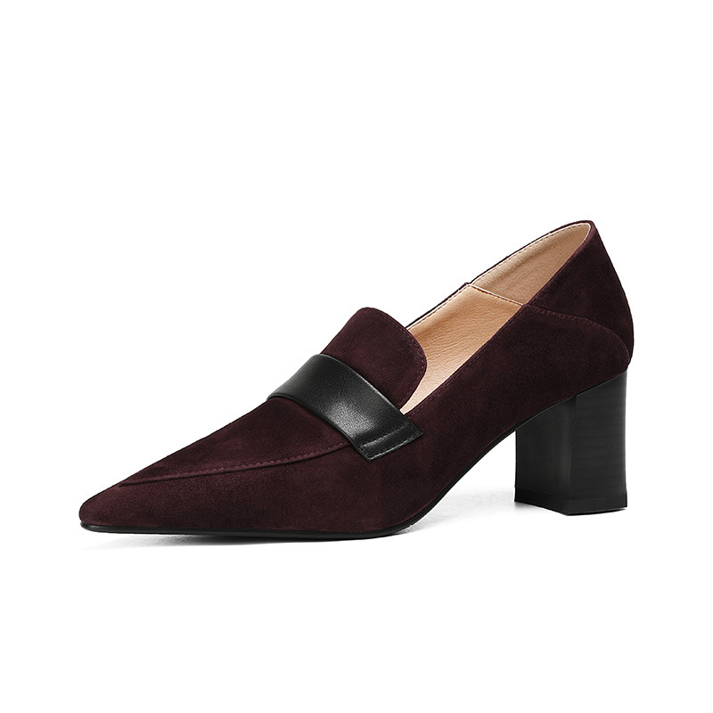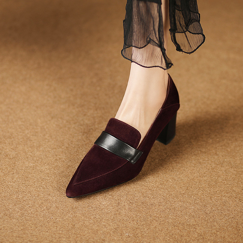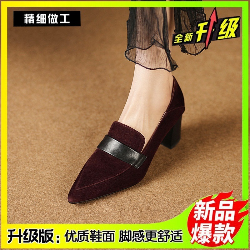유럽 프랑스 복고풍 뾰족한 깊은 입 싱글 신발 여성의 2024 봄과 가을 새로운 올 매치 소프트 가죽 버건디 청키 힐 하이힐 신발스토어 가기