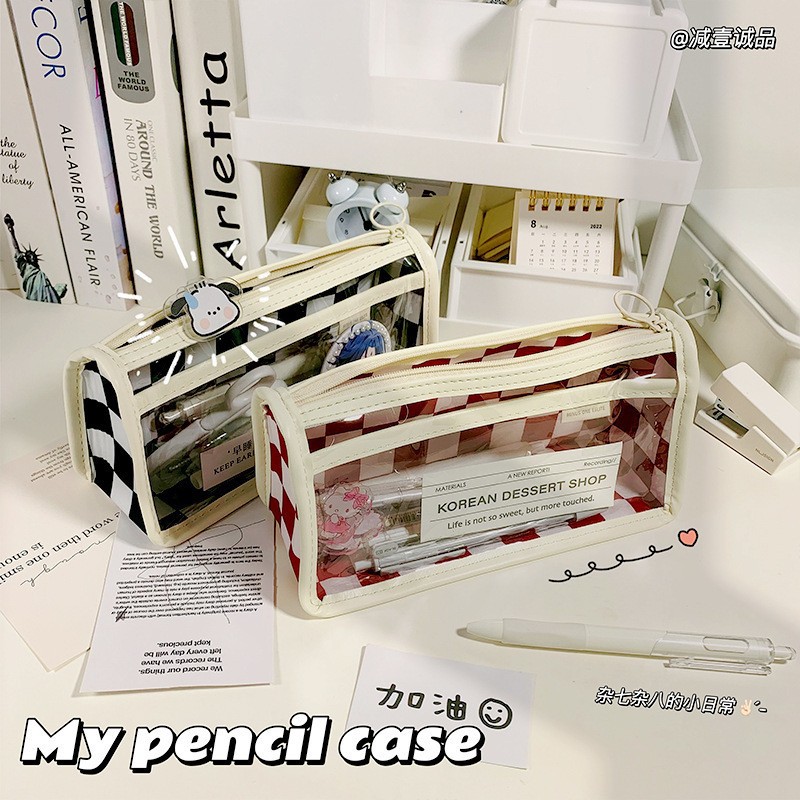 투명 바둑판 연필 케이스 문구 가방 높은 가치 대용량 간단한 학생 문구 가방 흑백 더블 레이어 연필 가방 한국어스토어 가기