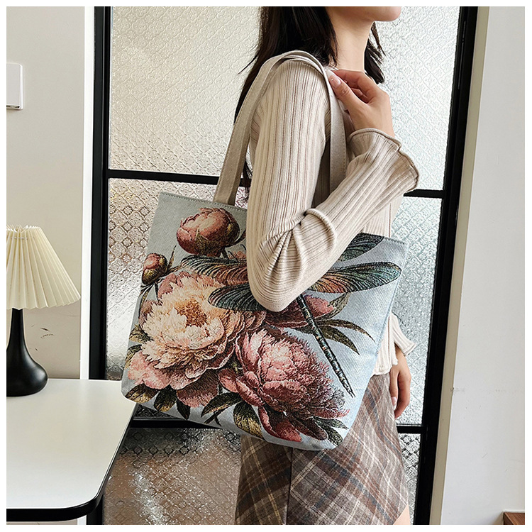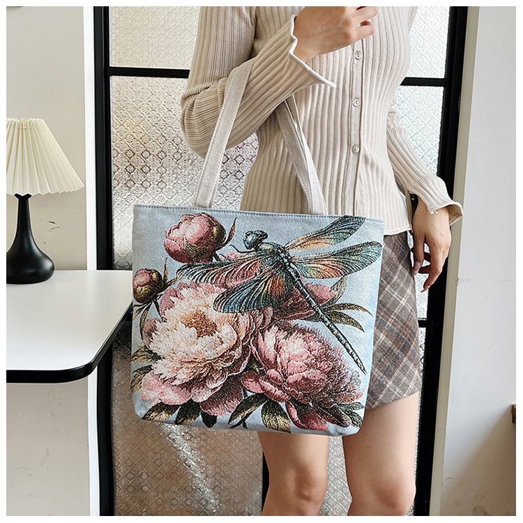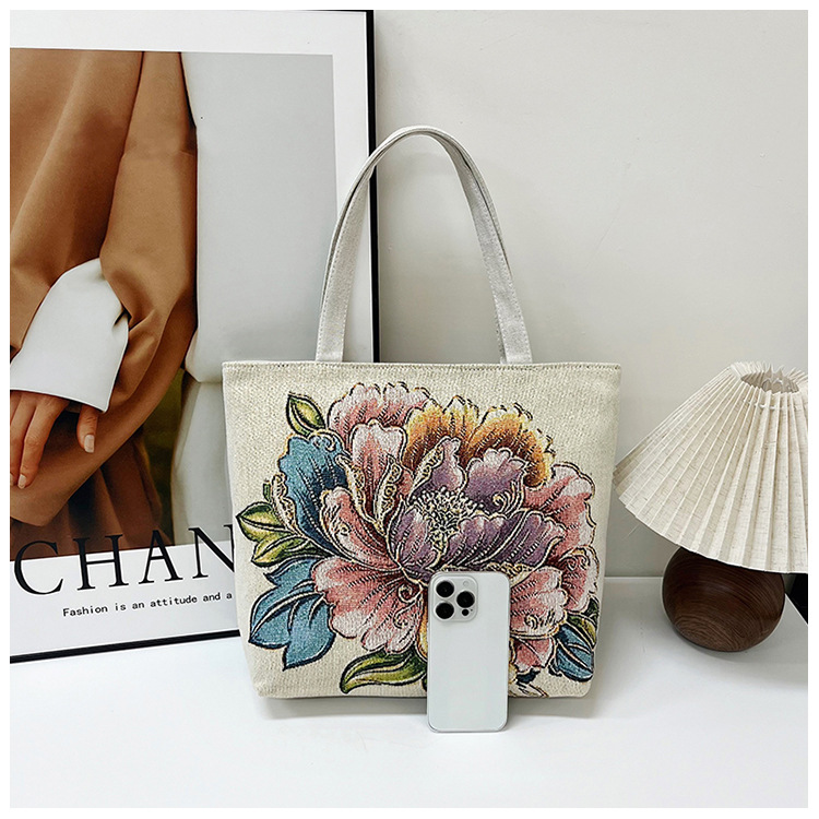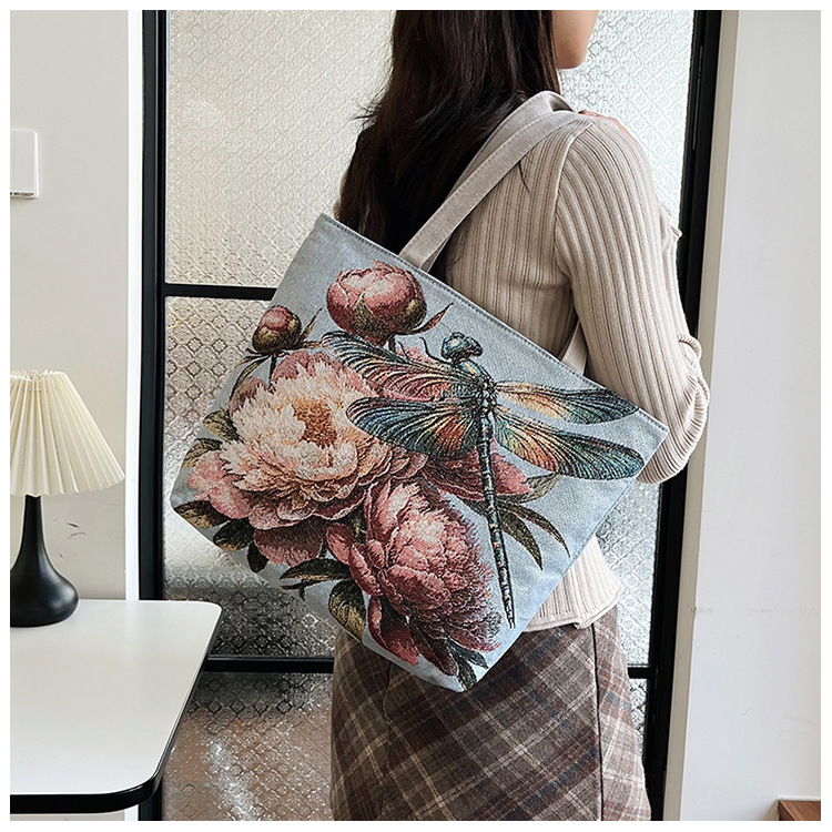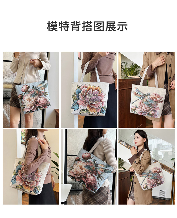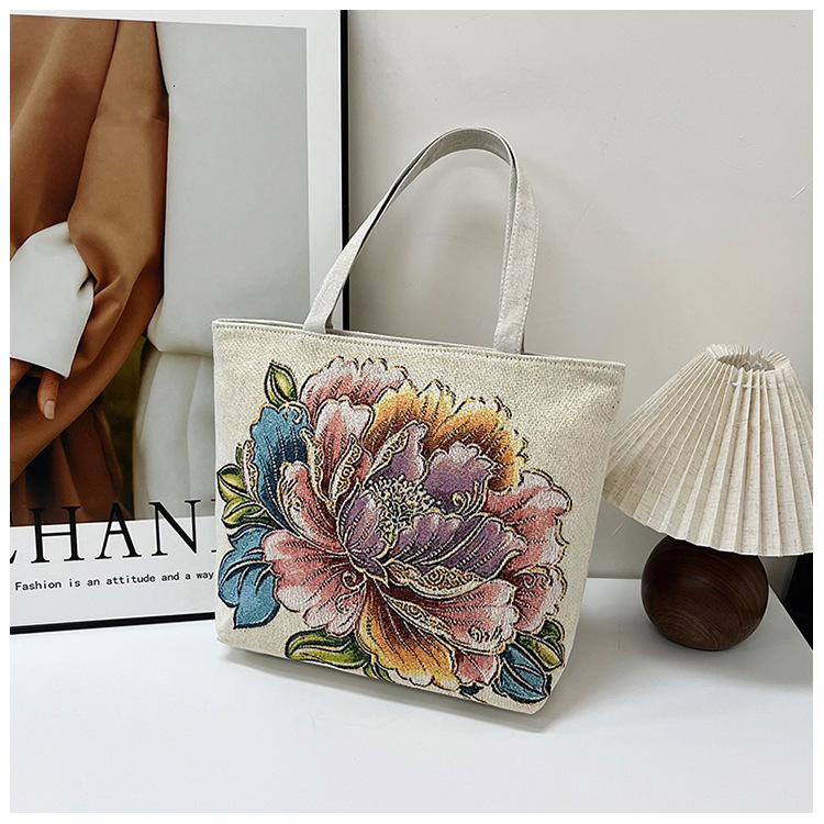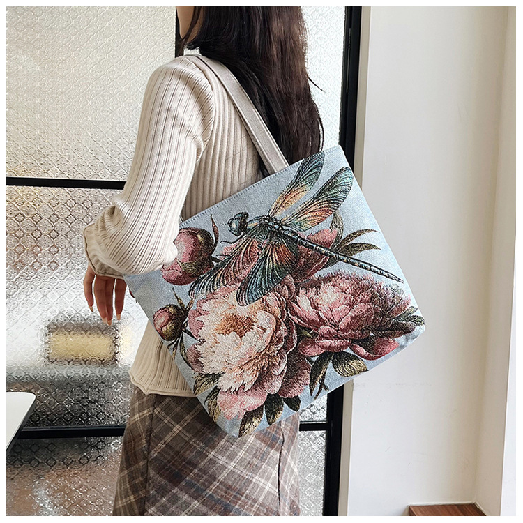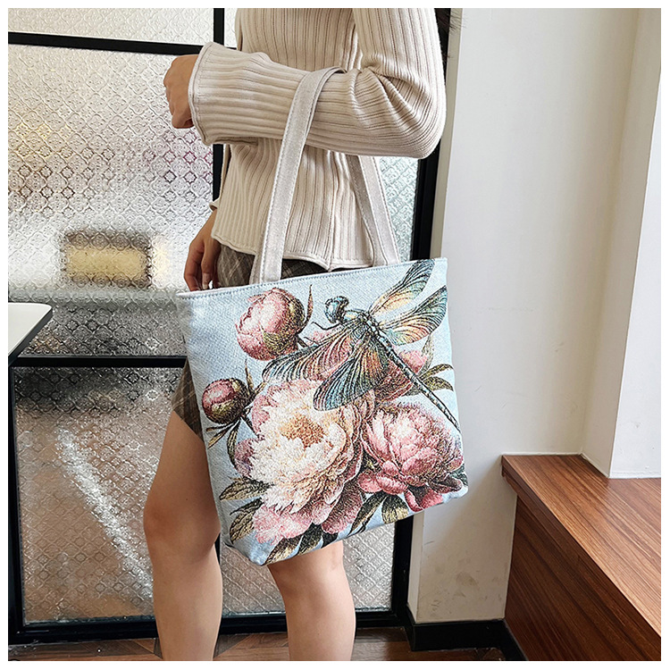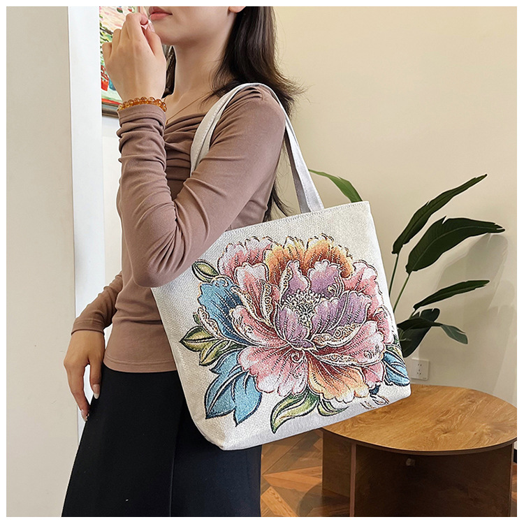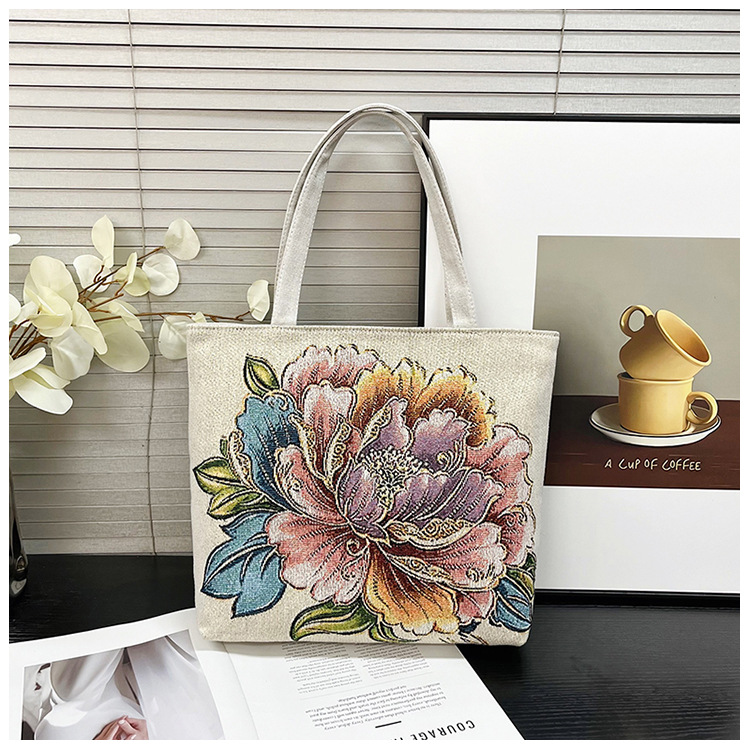 양면 골드 자수 자카드 캔버스 가방 대용량 미라 가방 간단한 예술적 어깨 가방 민족 스타일 토트 백
