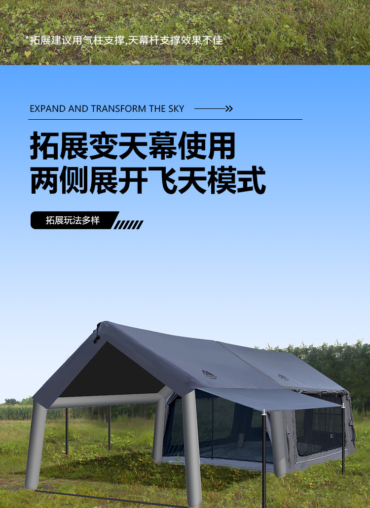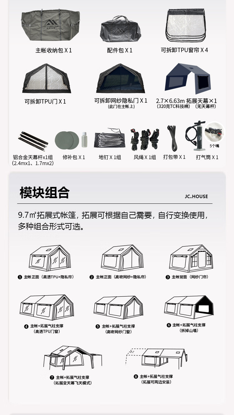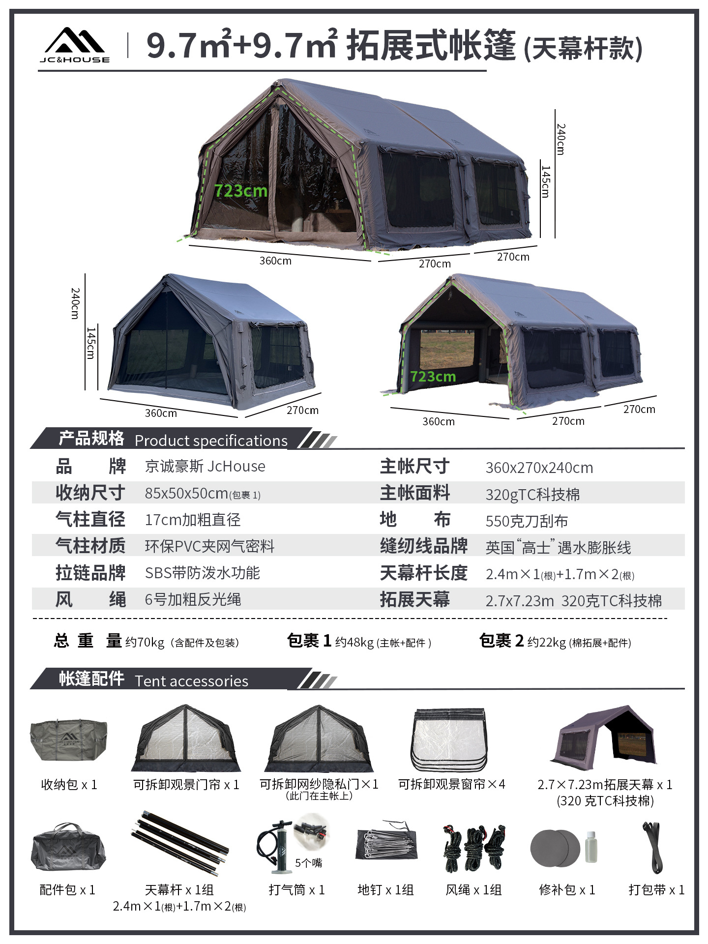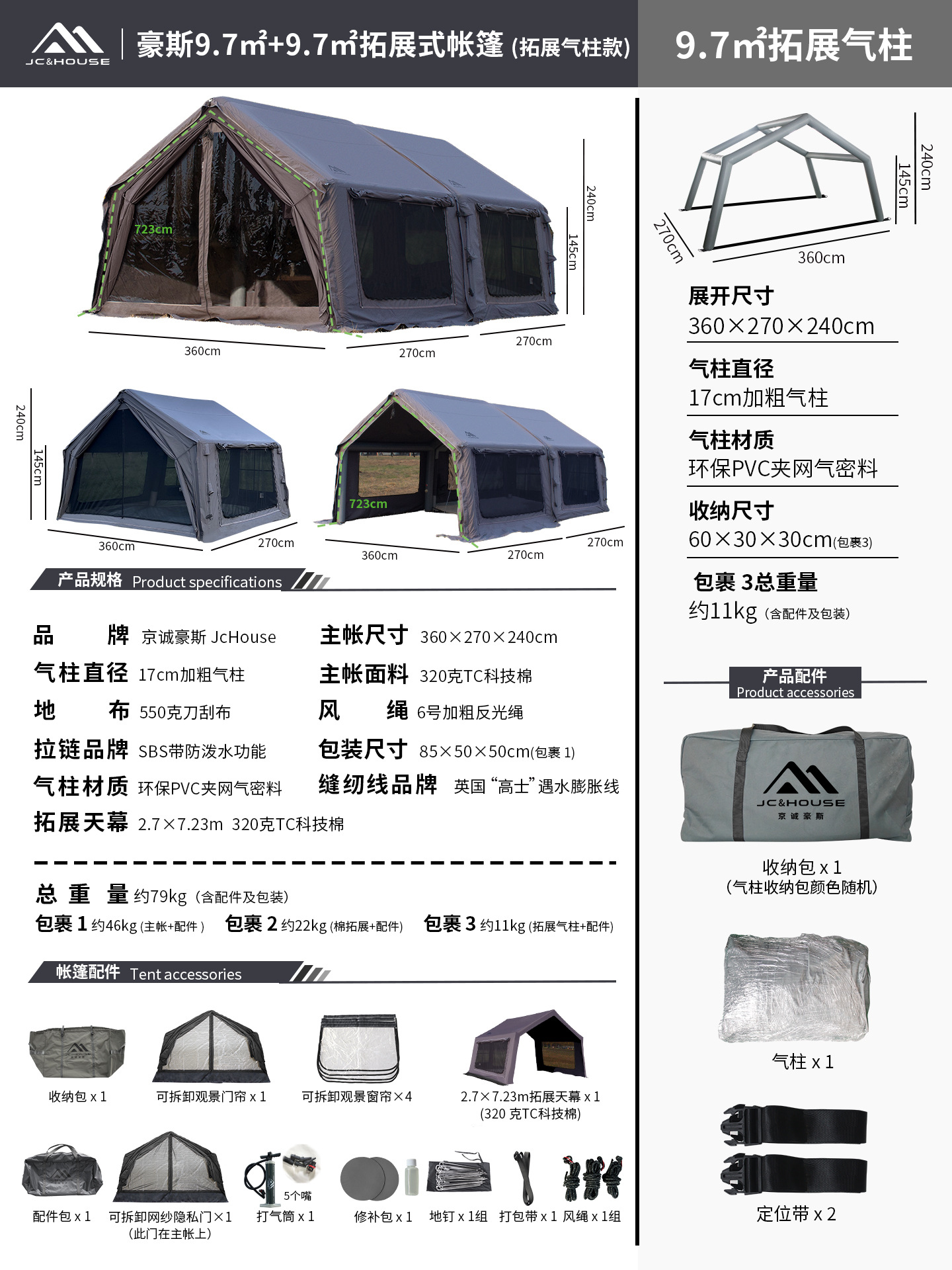 • 하우스 9.7+9.7 ㎡ (확장 공기 기둥 + 메인 텐트 + 확장 + 탈착식 전망 커튼) (캐노피 폴 제외)