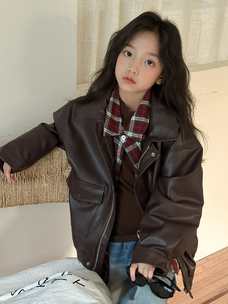 TCkids 봄 컬렉션 빈티지 메일라드 컬러 레트로 니치 커피 컬러 가죽 자켓