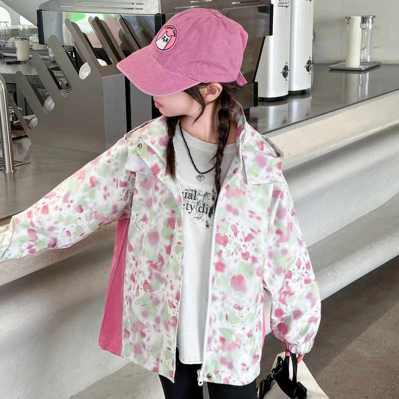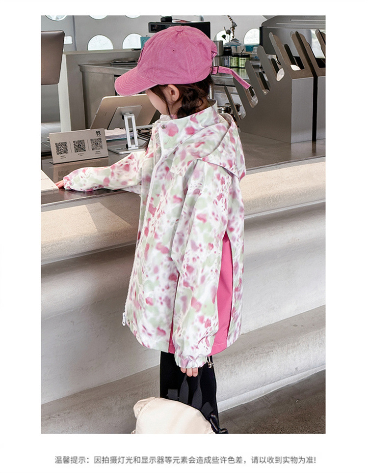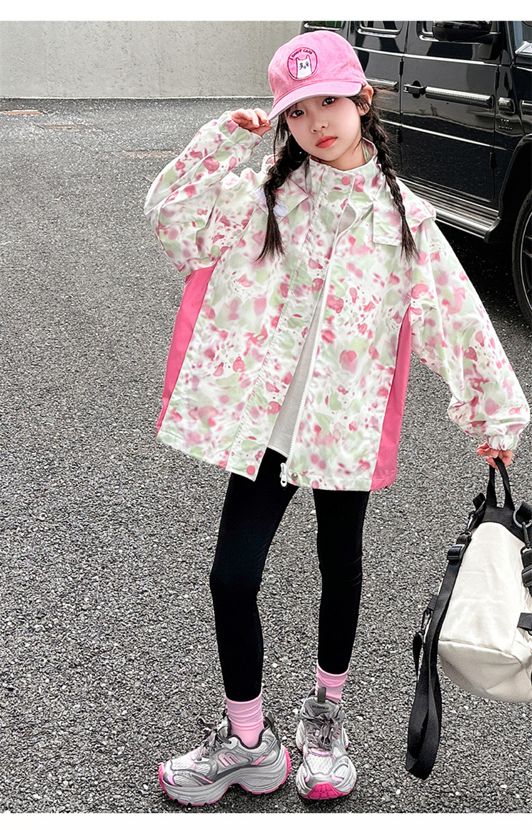 여아 재킷, 봄, 가을 새로운 스타일, 중대형 아동 패션 낙서 후드 재킷, 야외 방수 등산복