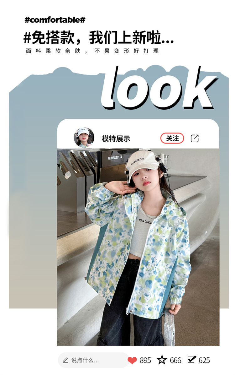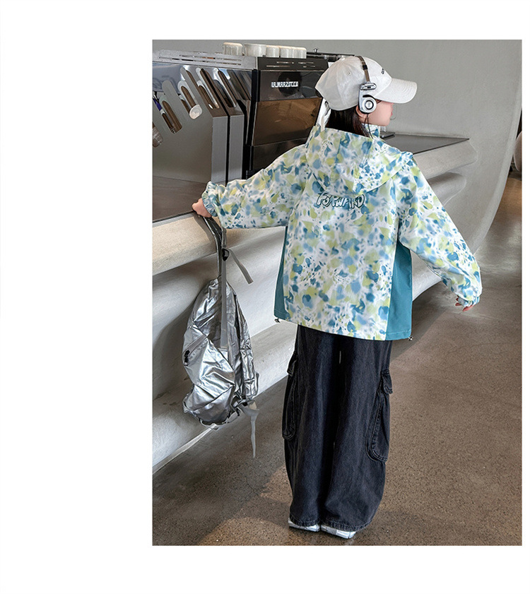 여아 재킷, 봄, 가을 새로운 스타일, 중대형 아동 패션 낙서 후드 재킷, 야외 방수 등산복스토어 가기
