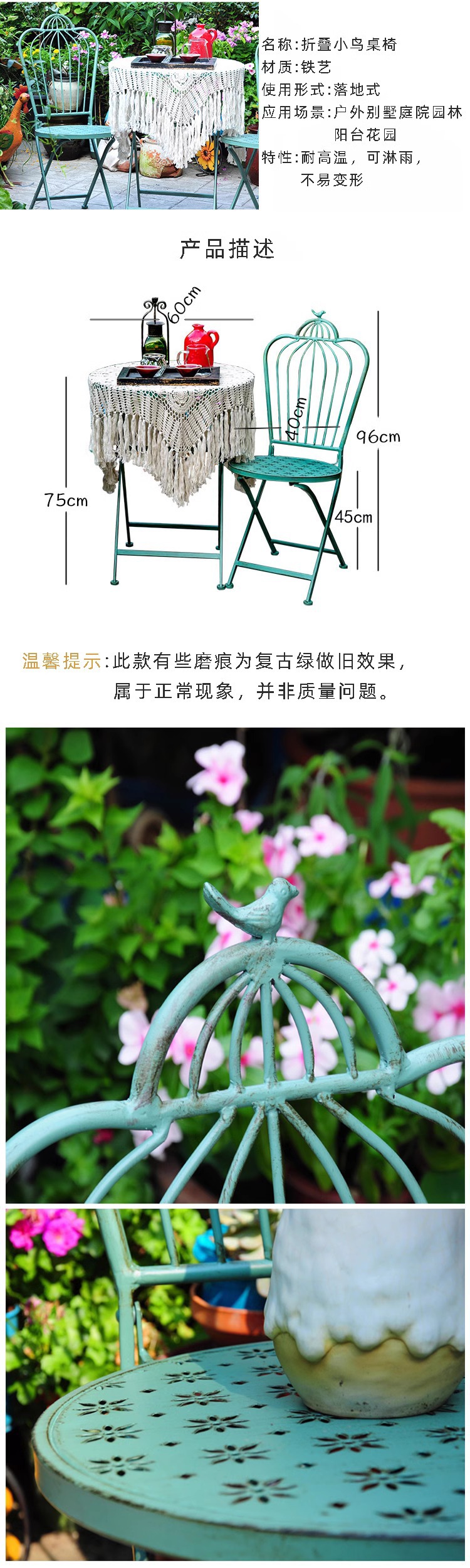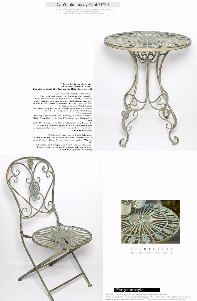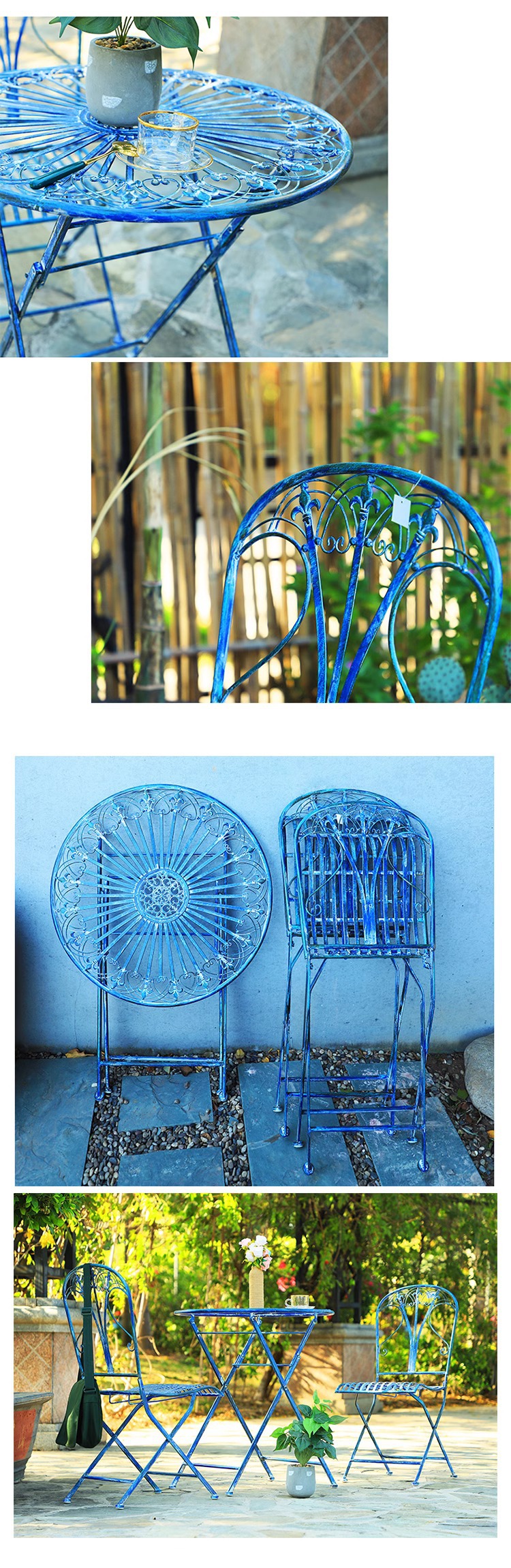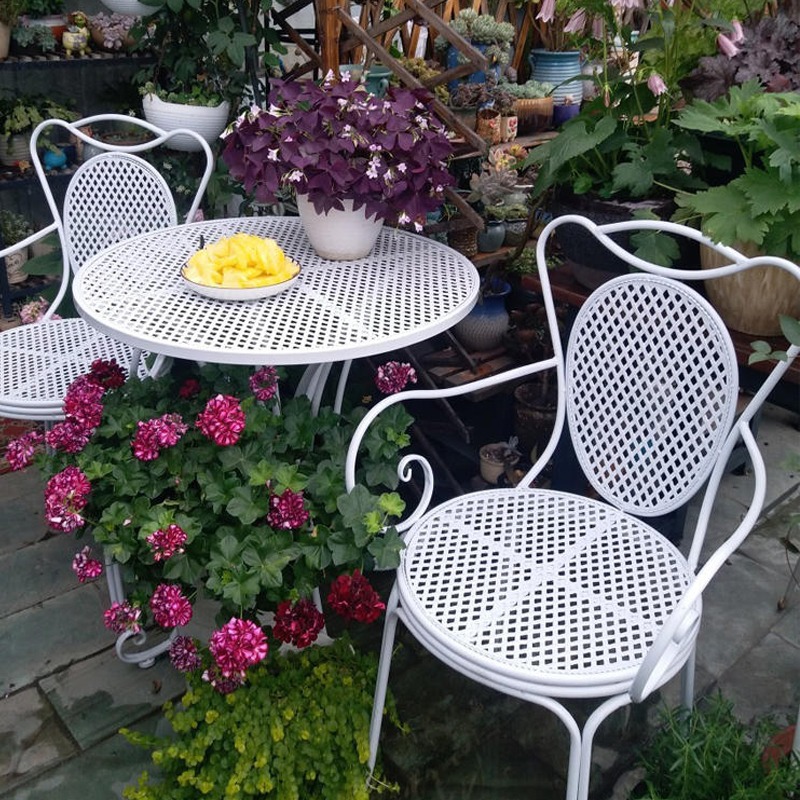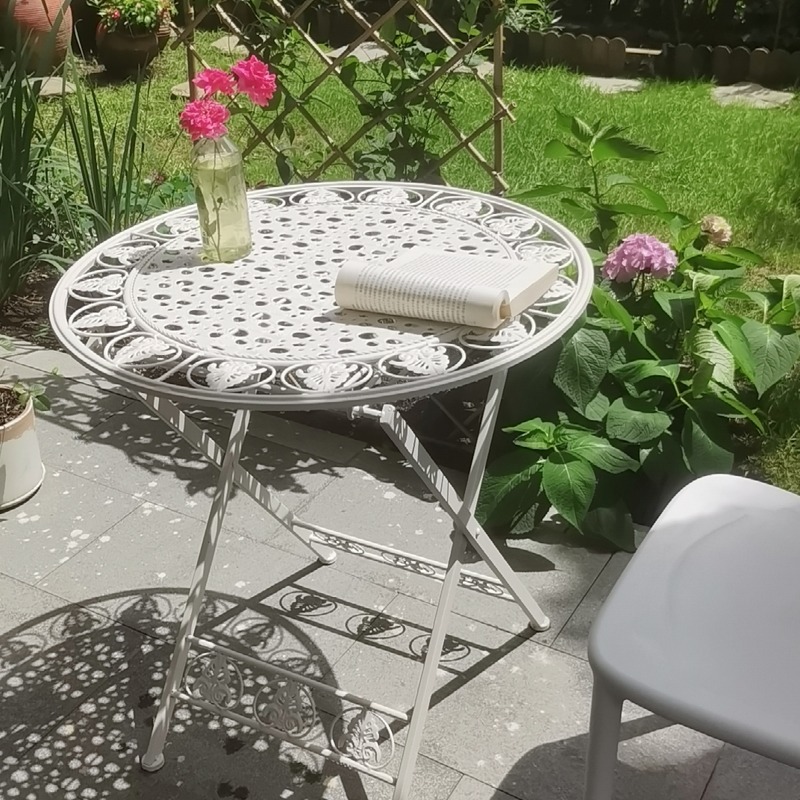 빈티지 목가적 인 녹색 프랑스 정원 테이블과 의자 안뜰 발코니 스카이 데크 접이식 철 의자 캐주얼 야외 라운드 테이블