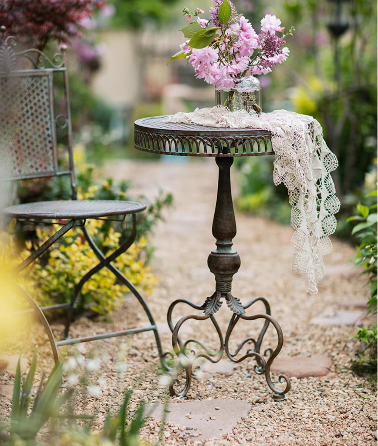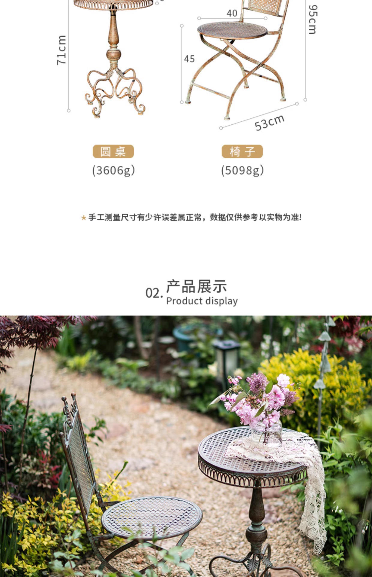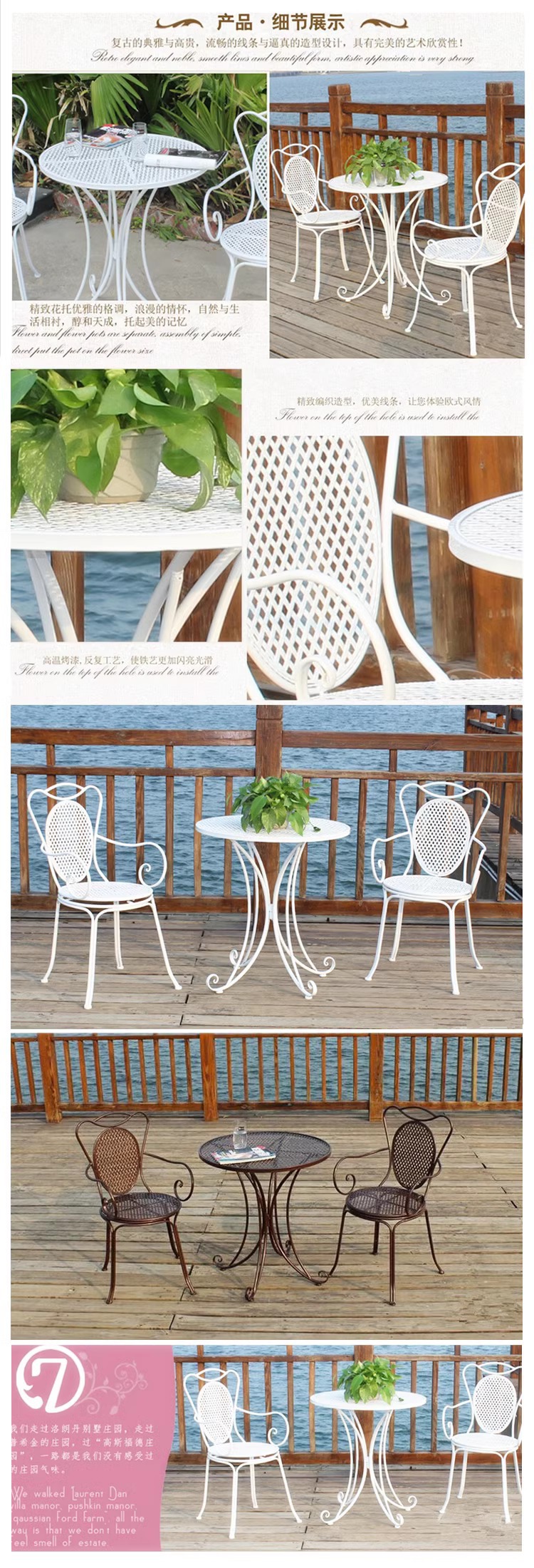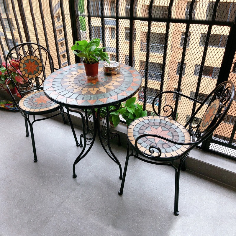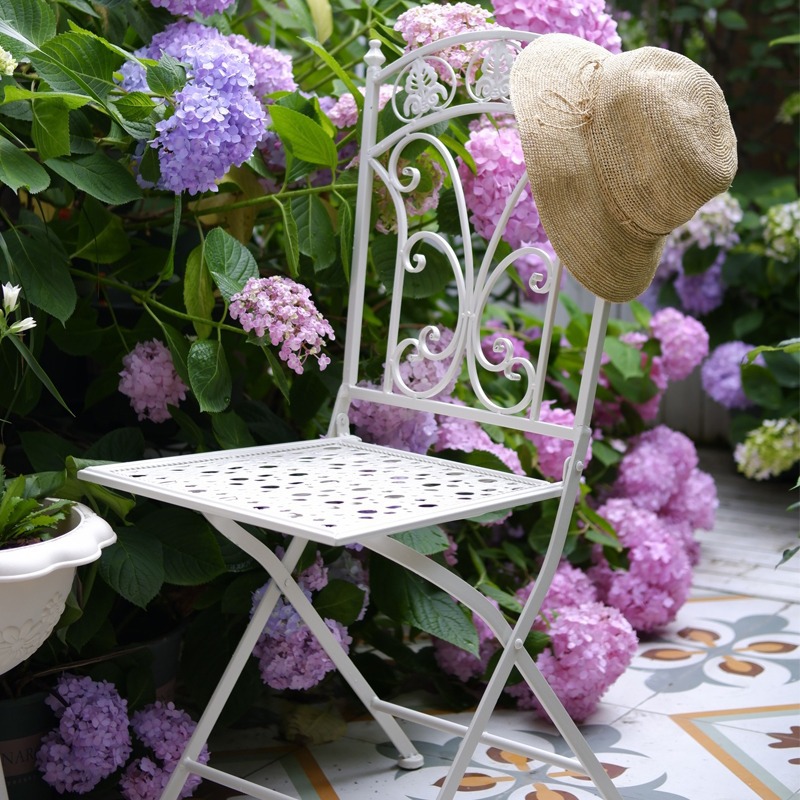 빈티지 목가적 인 녹색 프랑스 정원 테이블과 의자 안뜰 발코니 스카이 데크 접이식 철 의자 캐주얼 야외 라운드 테이블