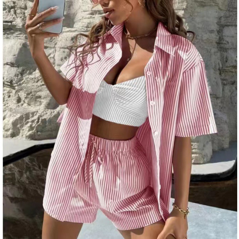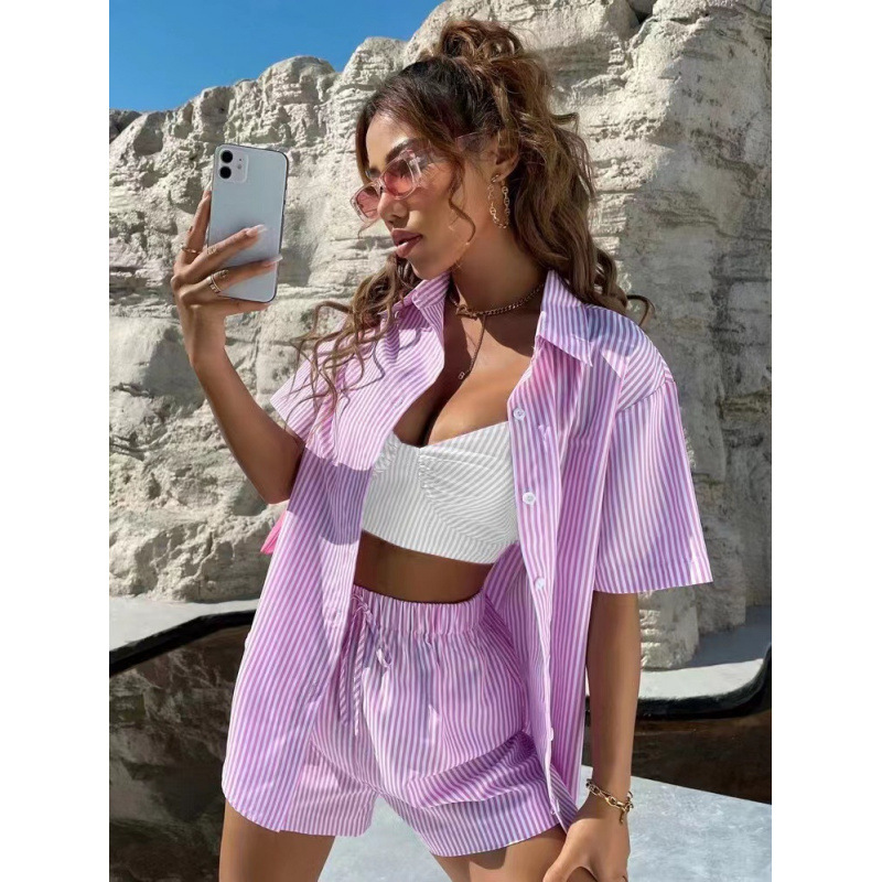 새로운 2024 봄과 여름 캐주얼 우아한 여성 줄무늬 투피스 반팔 셔츠 세트스토어 가기