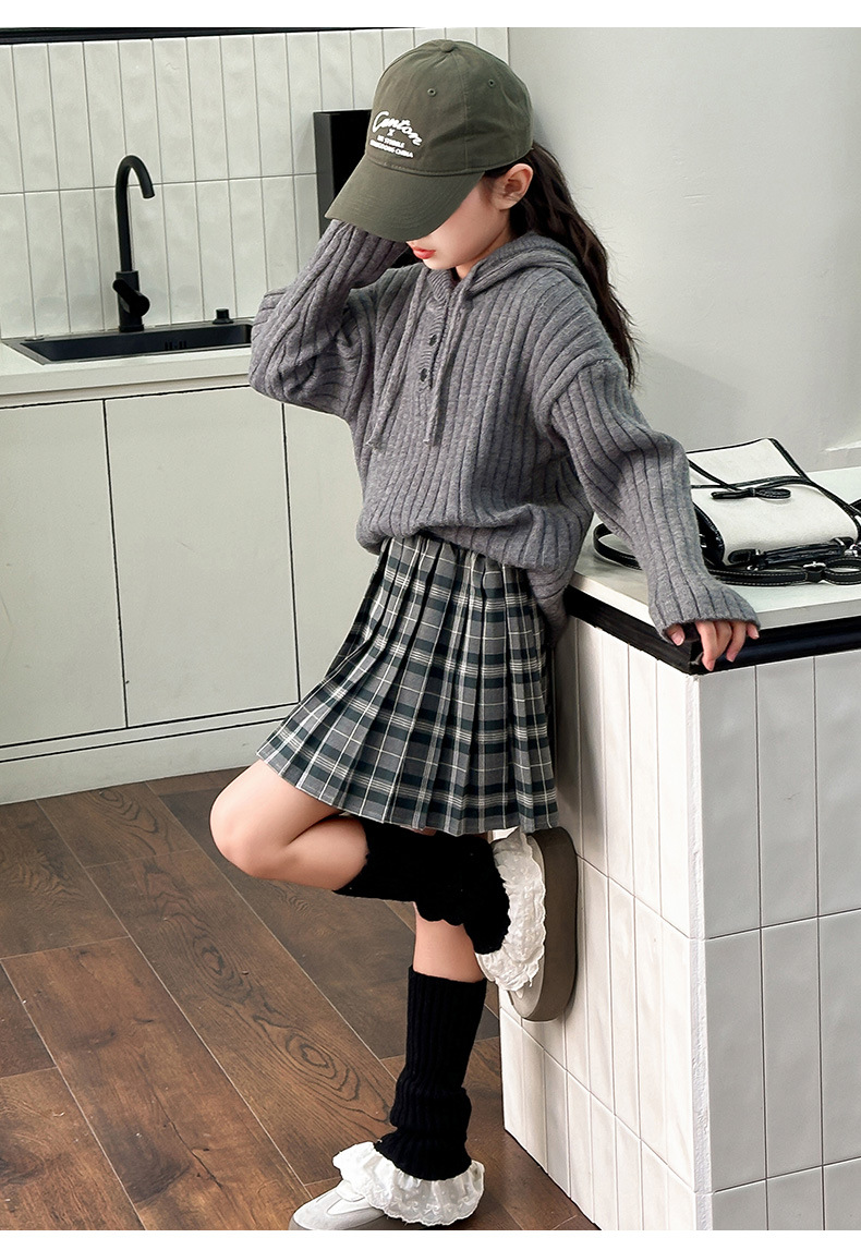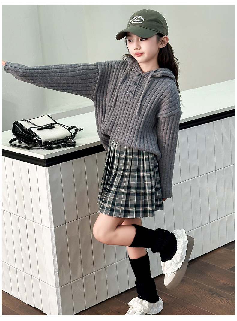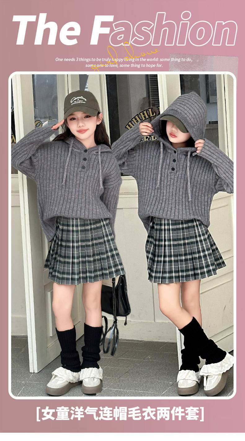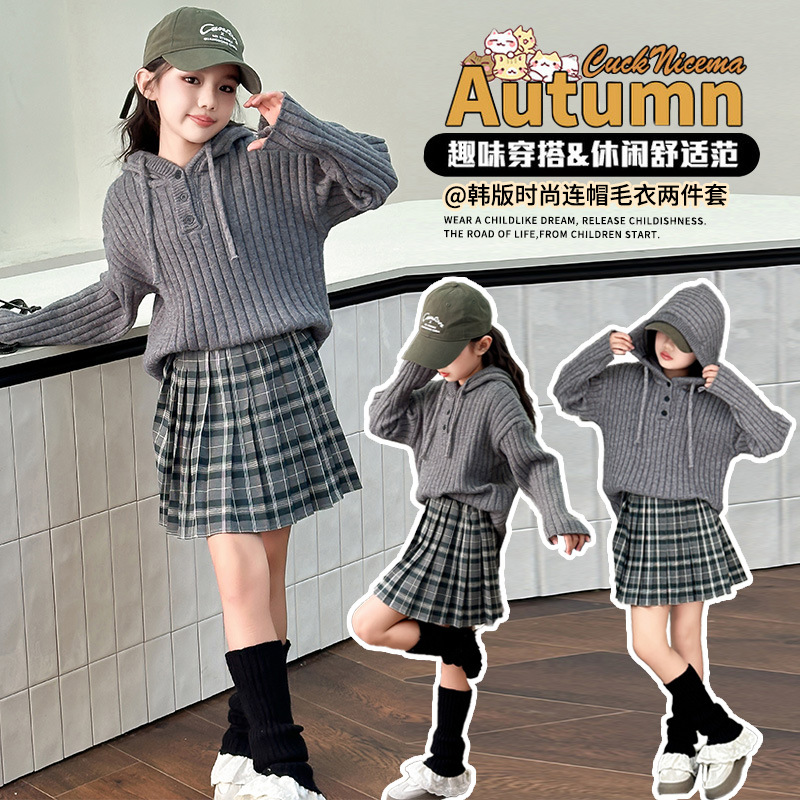2026 봄/가을 신상 한국 스타일 아동용 후드 스웨터 여아용 루즈핏 부드러운 후드티 체크무늬 스커트 세트스토어 가기