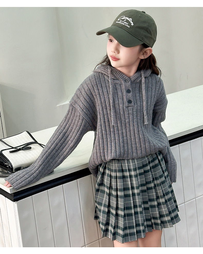 2026 봄/가을 신상 한국 스타일 아동용 후드 스웨터 여아용 루즈핏 부드러운 후드티 체크무늬 스커트 세트