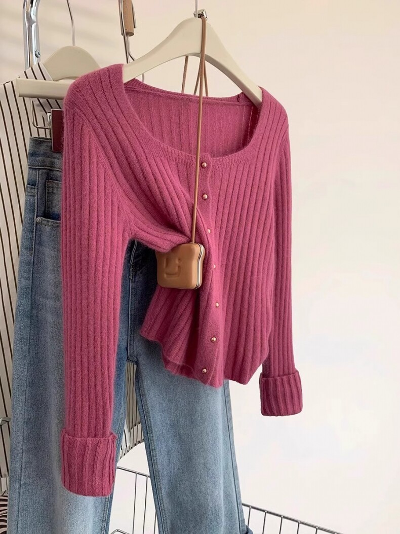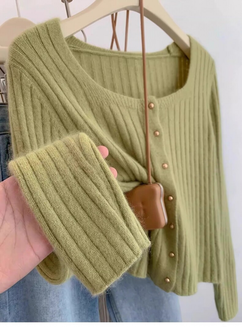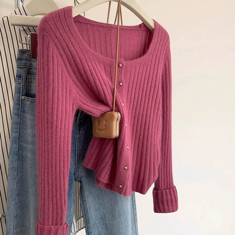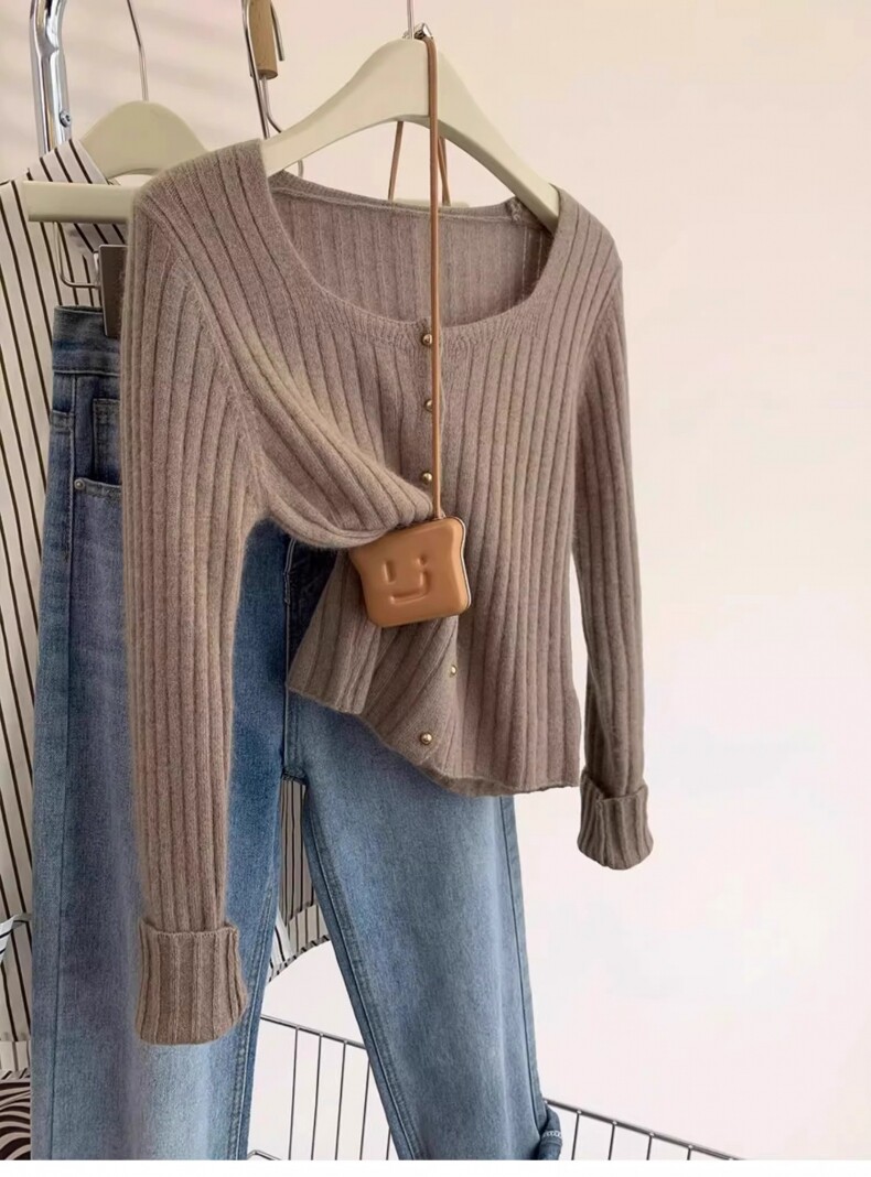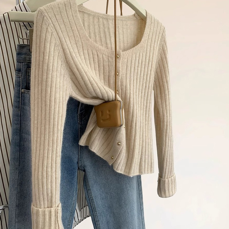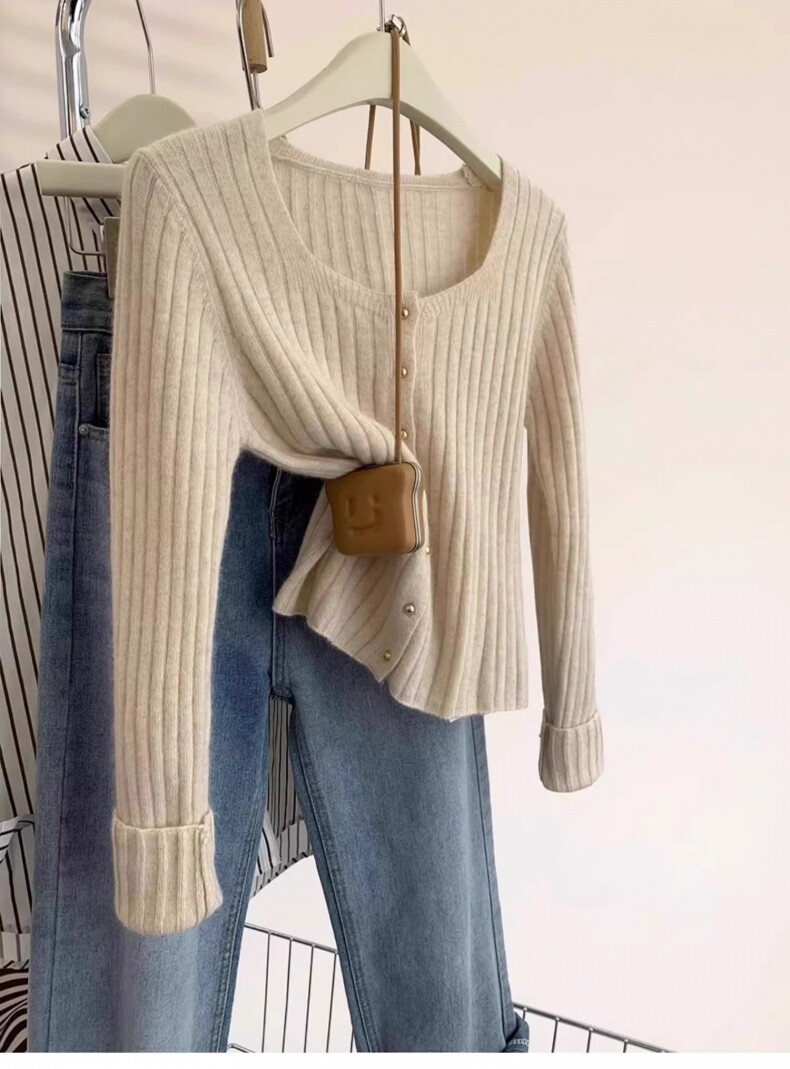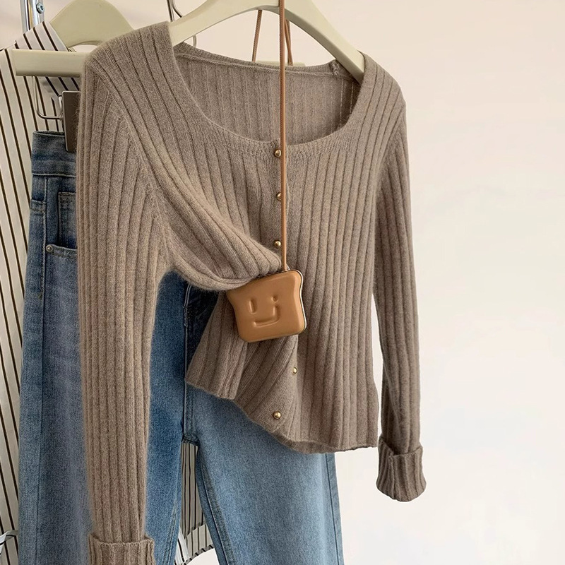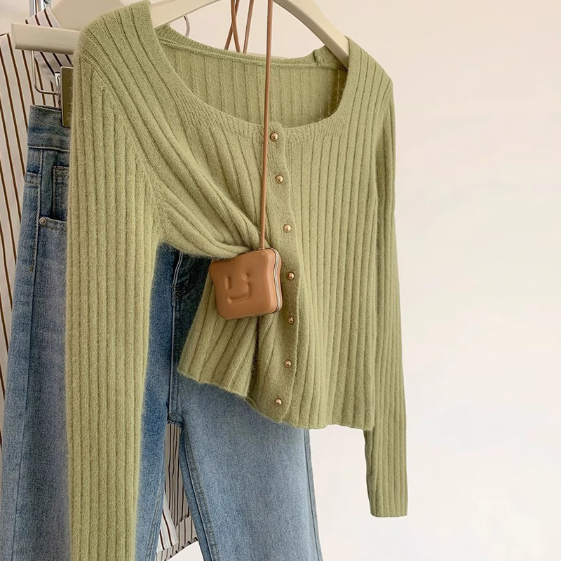 유럽 가을 2024 새로운 서양 스타일 짧은 광장 칼라 탑 여성 스웨터 디자인 세련된 니트 베이스 셔츠스토어 가기