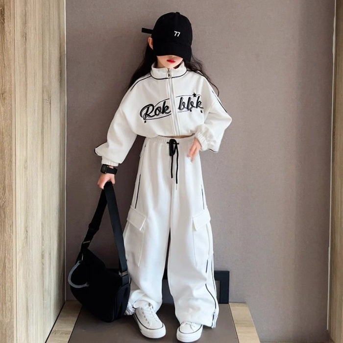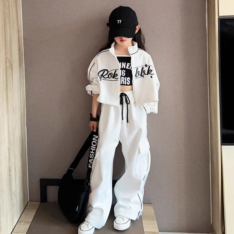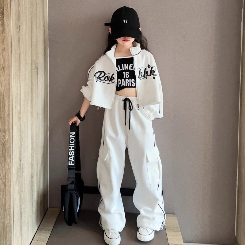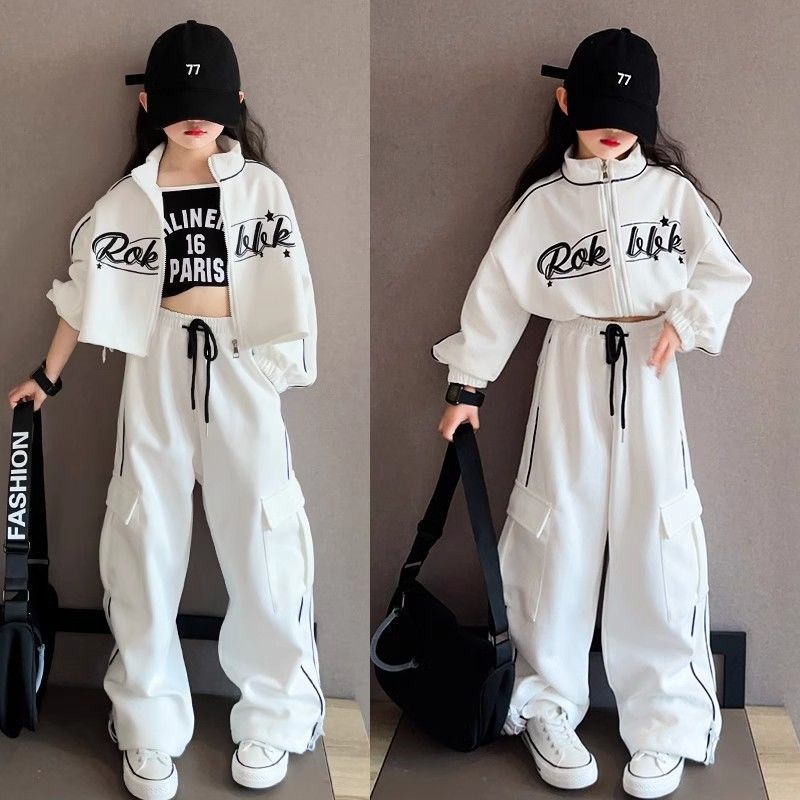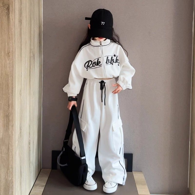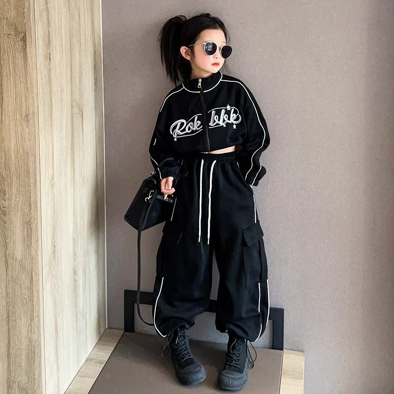 인터넷 Celebrant Girls 한국 스타일 세트 중대형 키즈 봄 및 가을 새로운 서양식 편지 수직 칼라 자켓 바지 스트라이프 투피스 세트스토어 가기