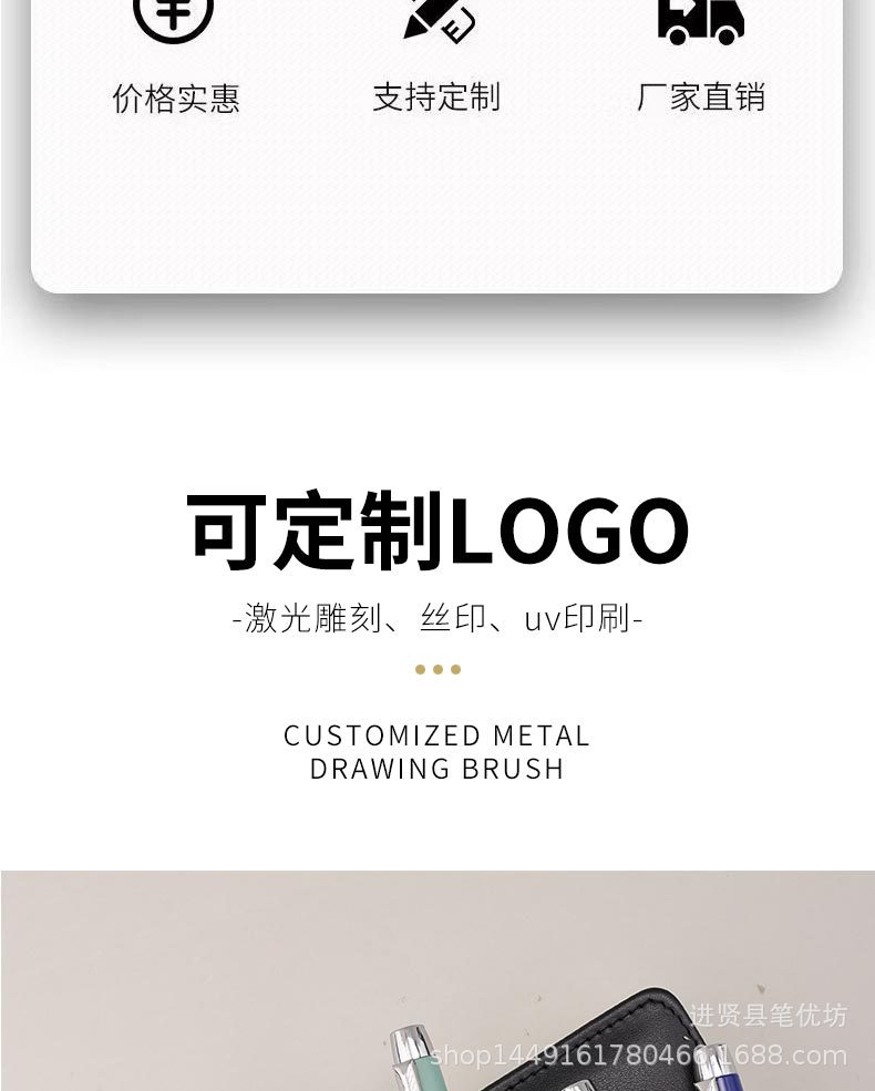 1.当前产品支持定制,需要可以联系客服这边给您效果,一般笔上定制分激光雕刻定制和丝网印刷定制,还有uv定制(此工艺比较贵不推荐)。(1).激光定制收费标准是100支以内收15元,定制费200支收25元定制费,300支收30元定制费 600支以上定制收0.05元一支的定制费收取。