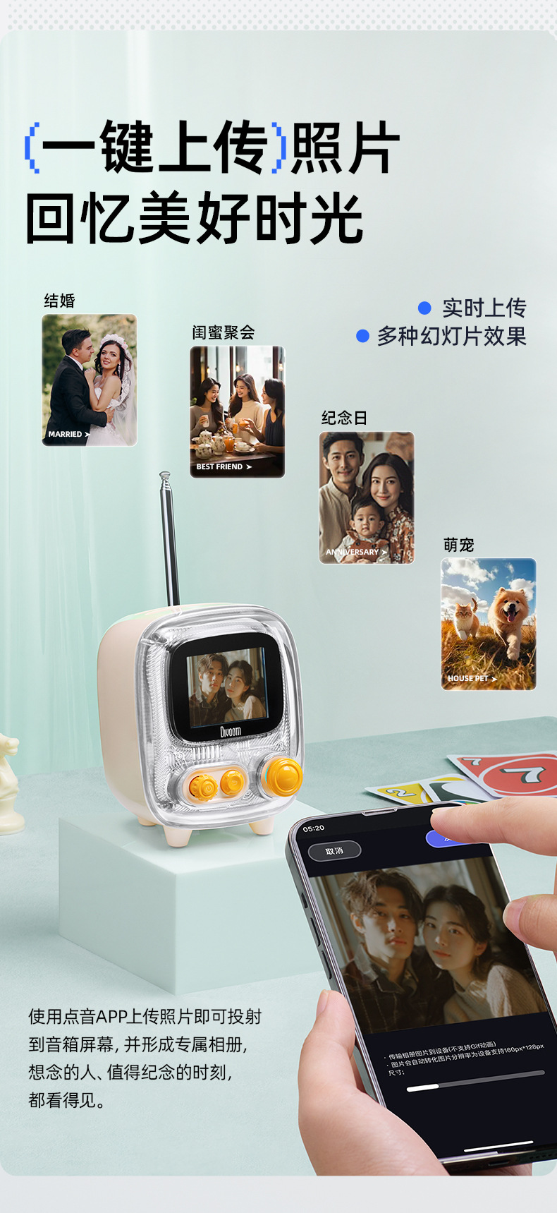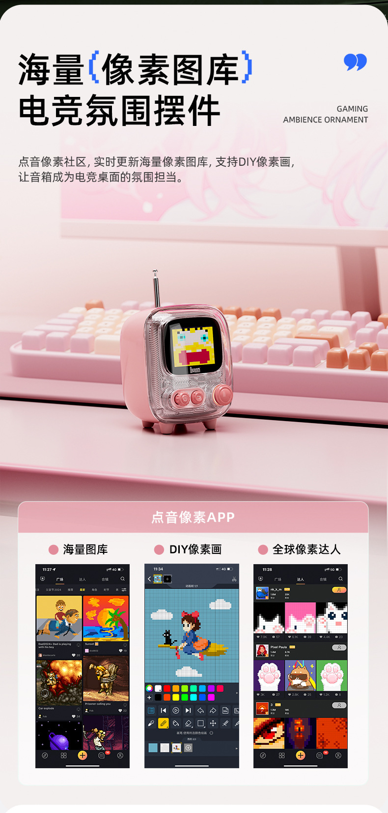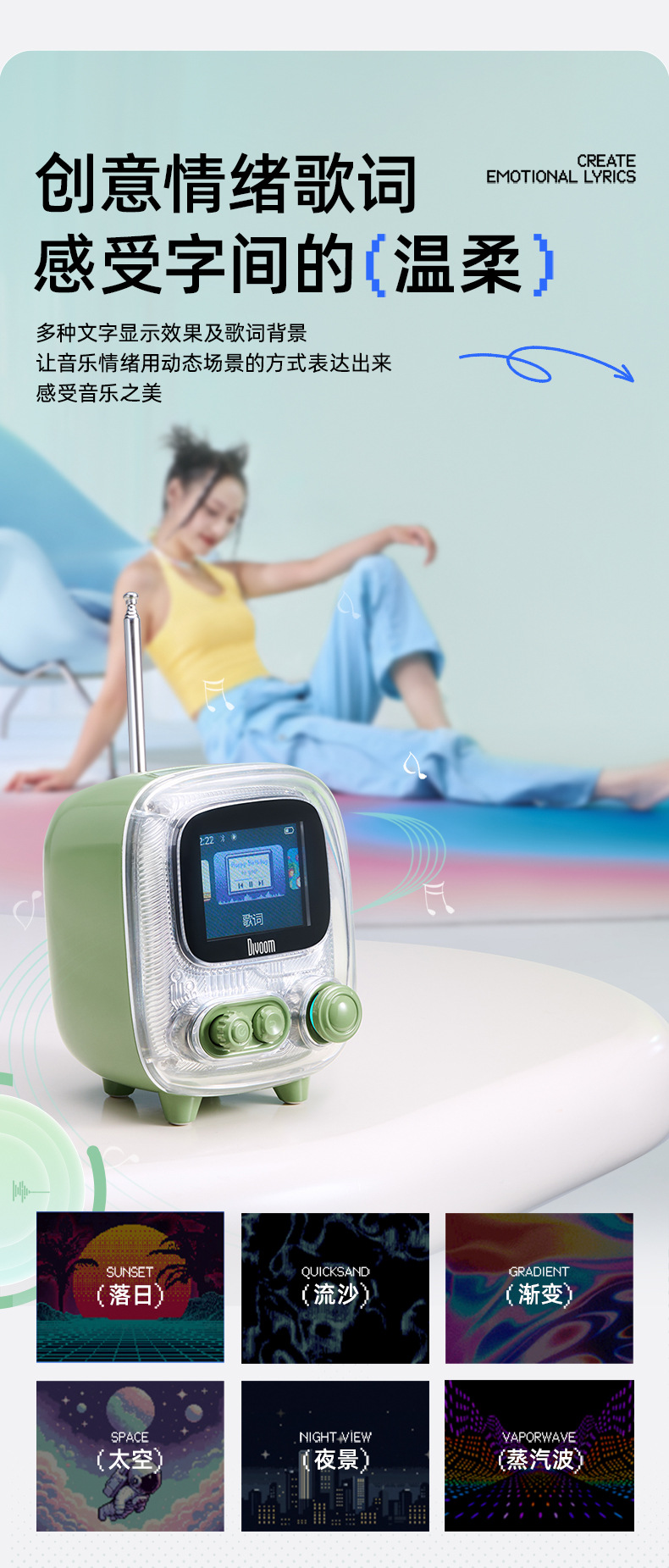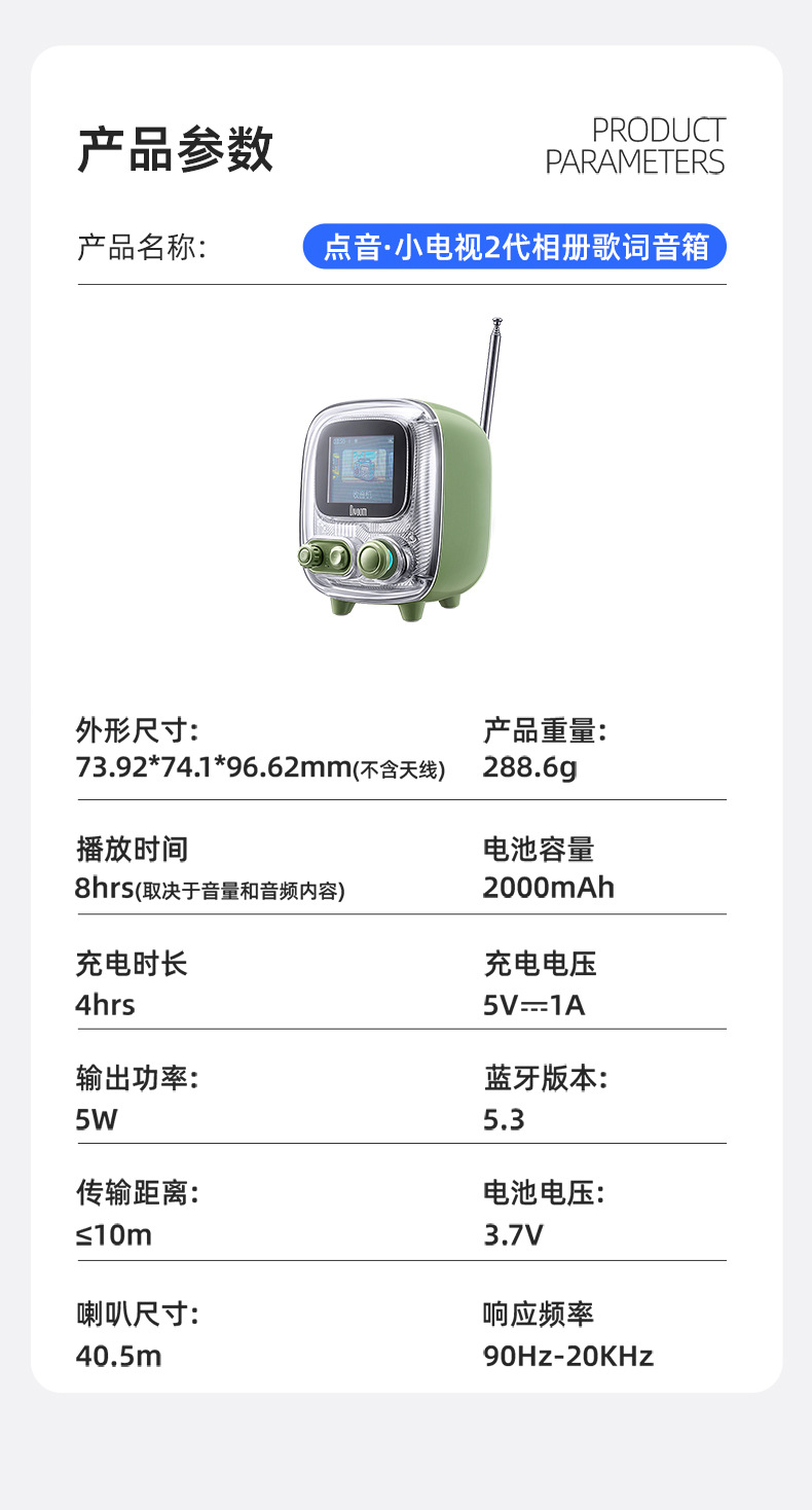 点音音箱(英文DIVOOM),自2006年创立于中国深圳,一直坚持"品牌出海战略",专注高品质制造和声光科技研发。2015年DIVOOM出品全球第一款像素音箱,并诞生围绕像素创作和社区营运的APP点音。到2019年,APP注册用户已经超过200万,集结了日本,德国,法国的一大批像素艺术家,我们正全力用创意智能硬件,工具型软件,高粘度社区打造一个有强烈中国互联网特征的新一代国际品牌。