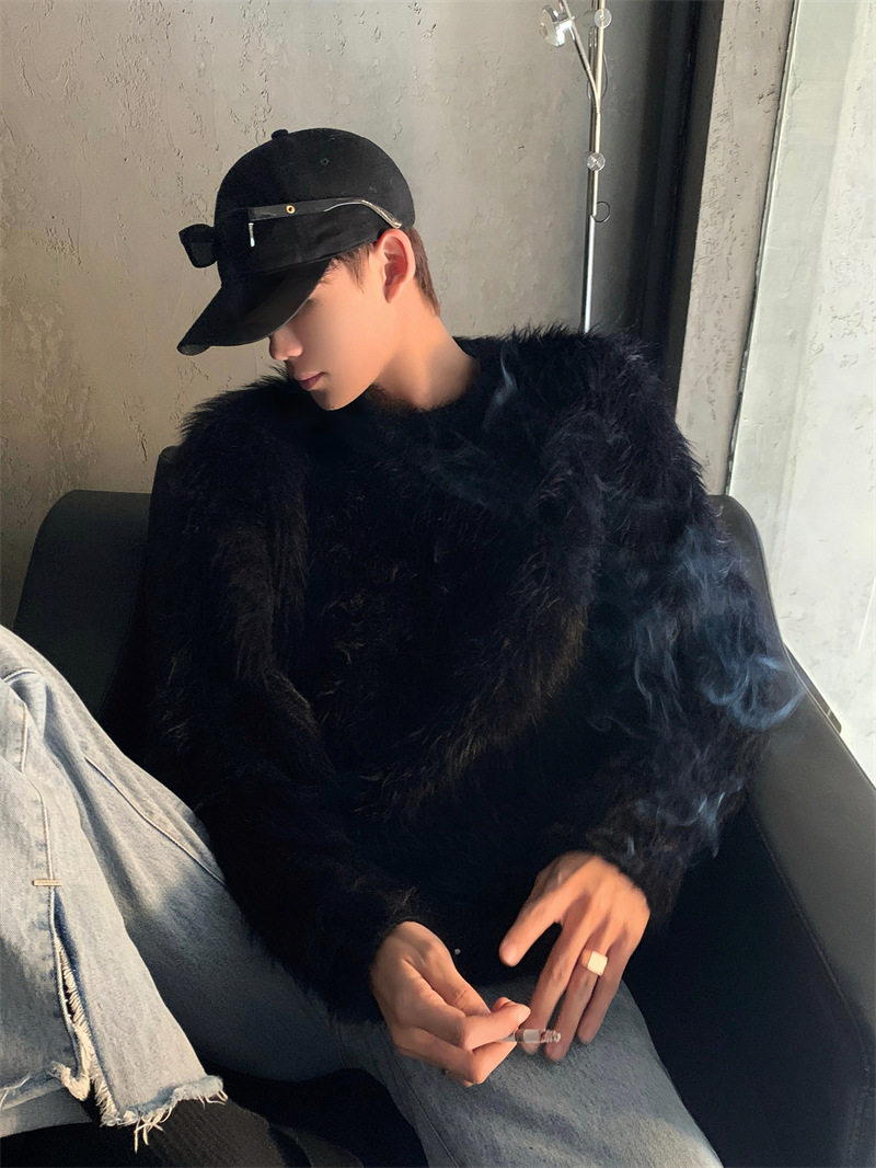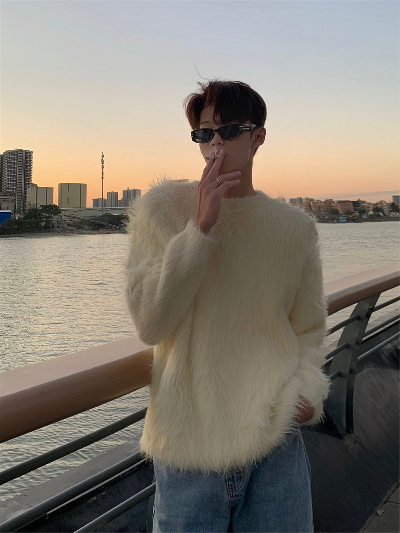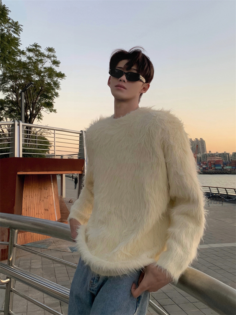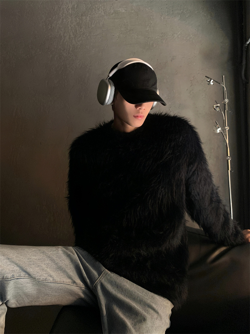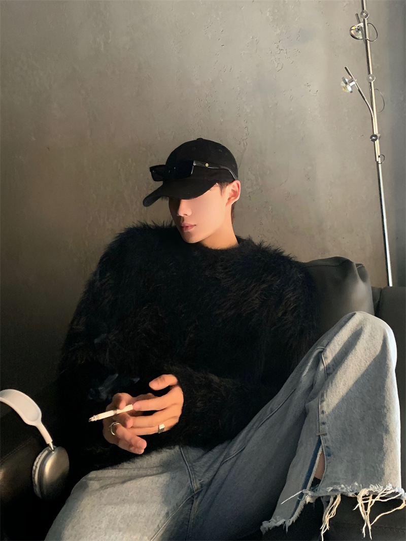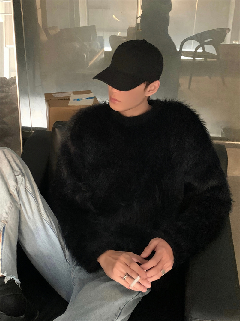 고급스러운 분위기의 남성용 밍크 스웨터, 트렌디한 브랜드, 가을 겨울 따뜻한 니트웨어, 루즈핏 라운드넥스토어 가기