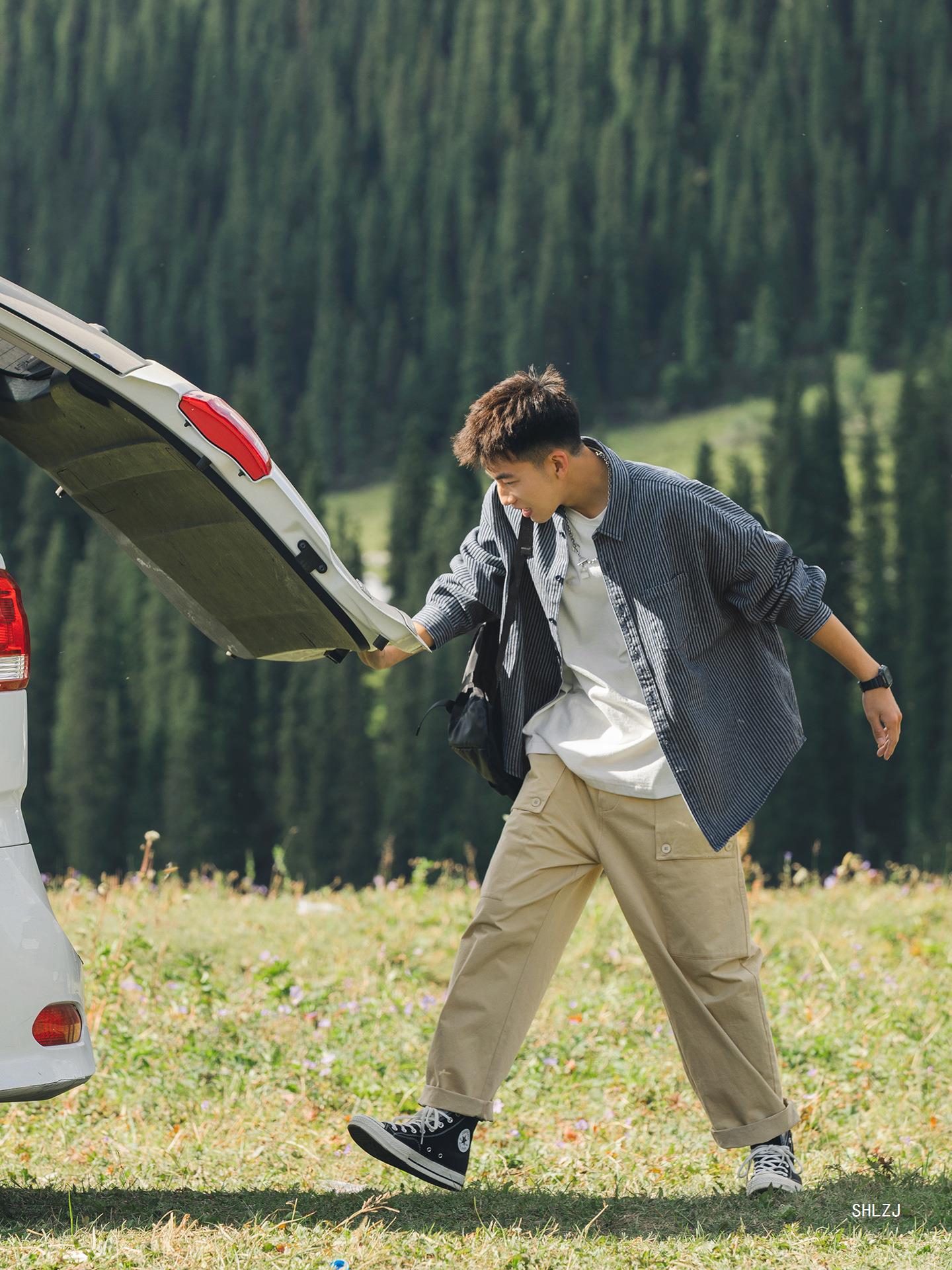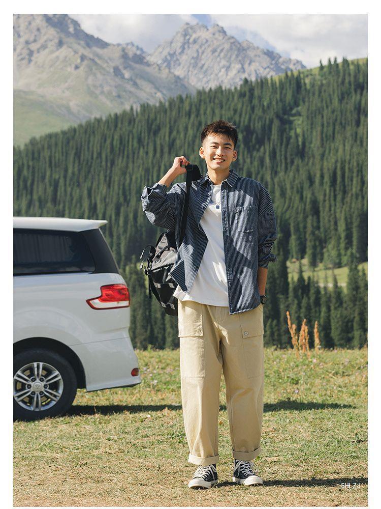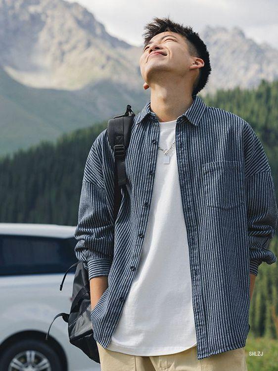 Lu Xiaohu 트렌디 브랜드 워싱 스트라이프 데님 긴팔 셔츠 남성 일본 캐주얼 cityboy 블루 셔츠 재킷
