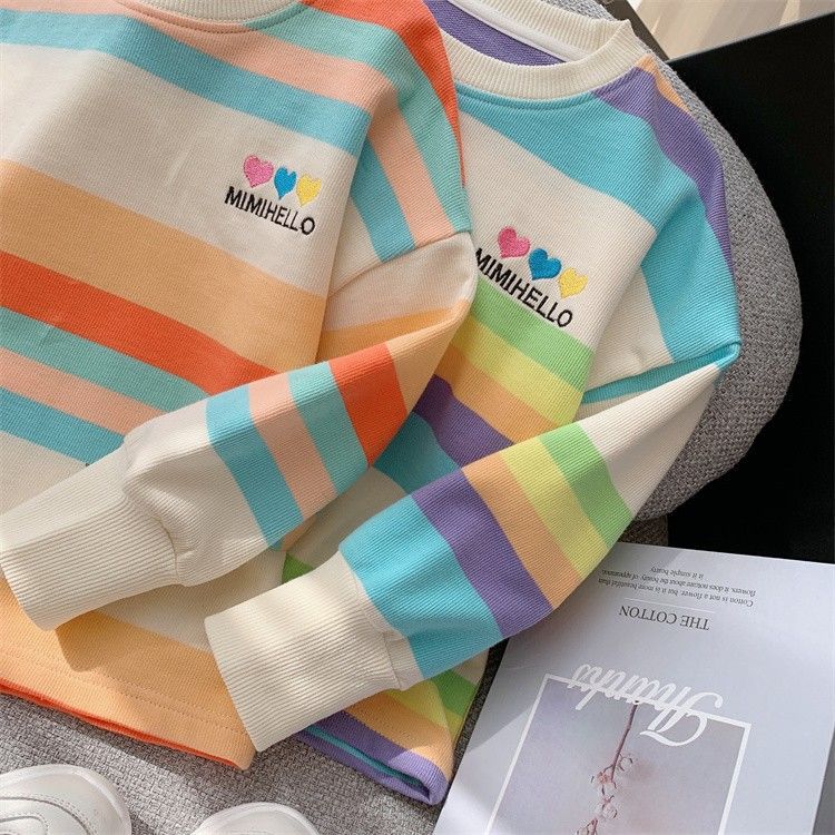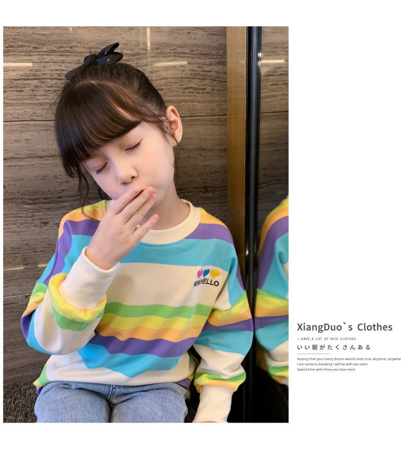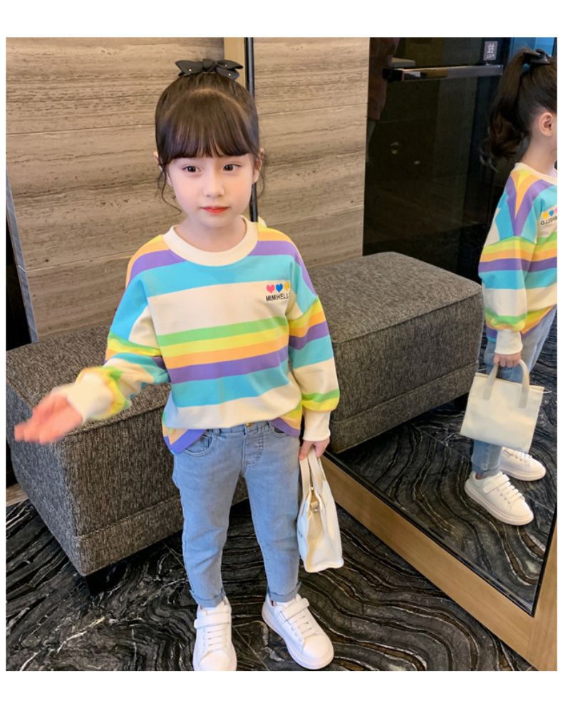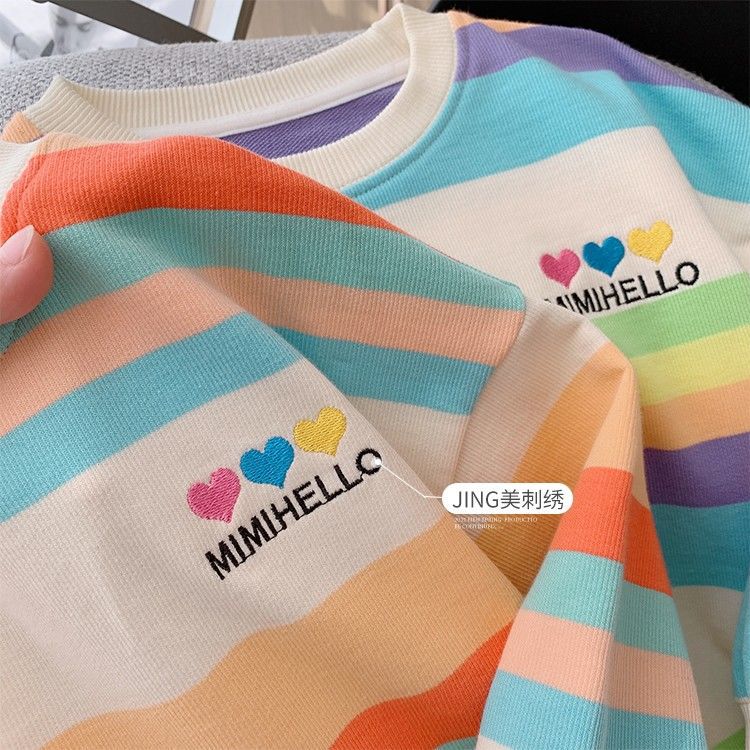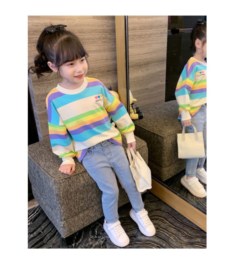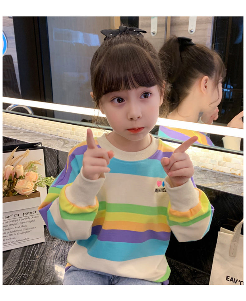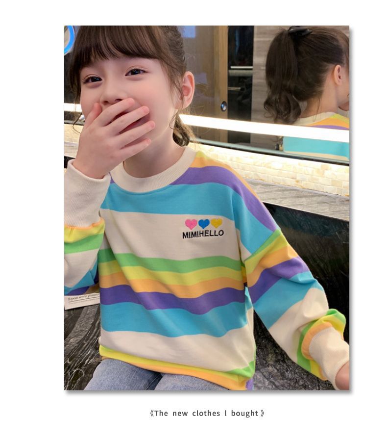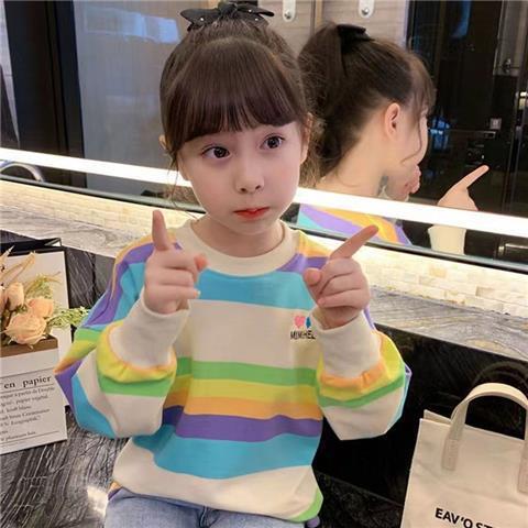 여아 레인보우 티셔츠, 스타일리쉬한 아동용 긴팔 스트라이프 스웨트셔츠, 2026년 봄 가을 신상 여아 한국 스타일 인터넷 인기 상의