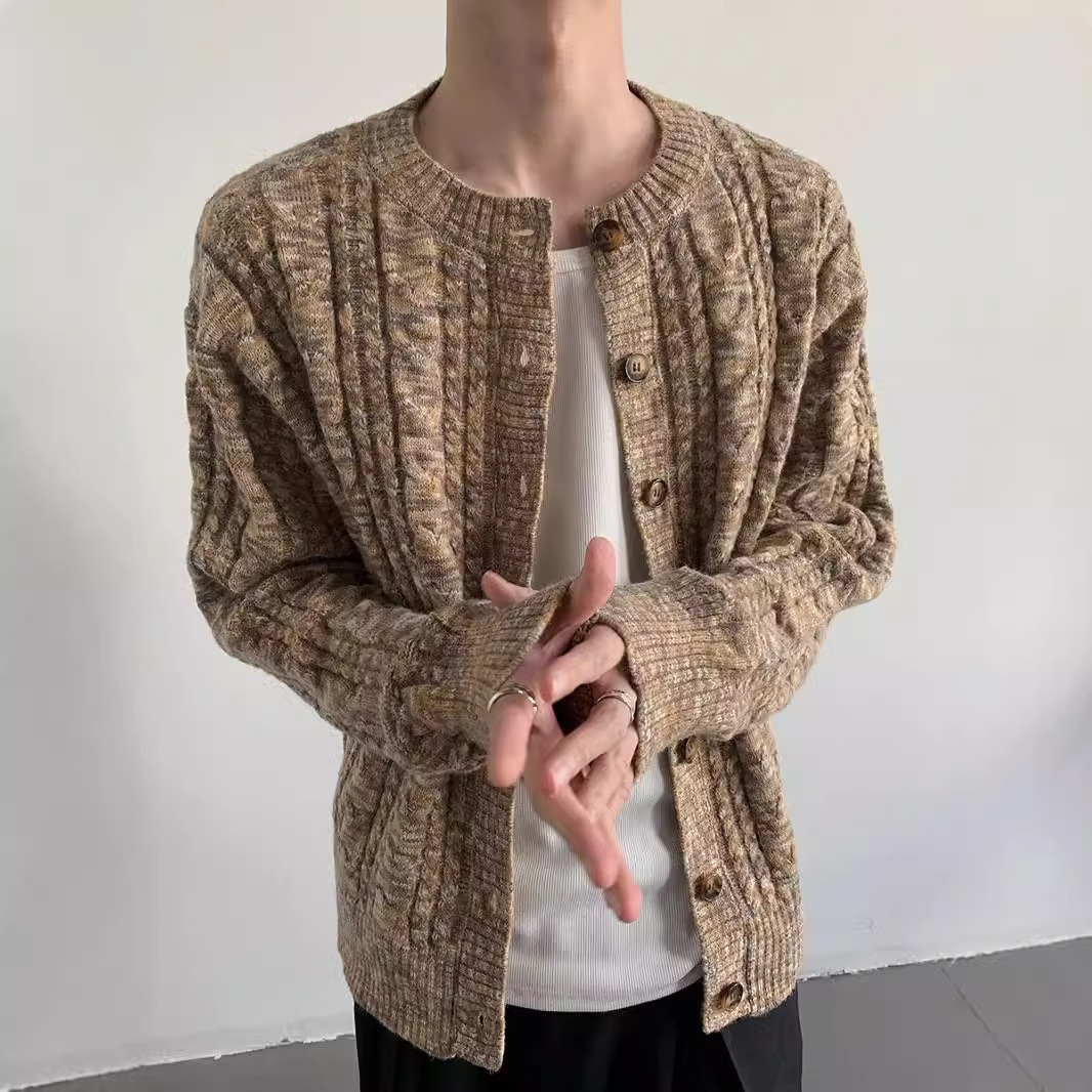 대조적 인 트위스트 긴 소매 니트 카디건 남자 가을 새로운 올드 머니 스타일 느슨한 캐주얼 게으른 스타일 스웨터 재킷