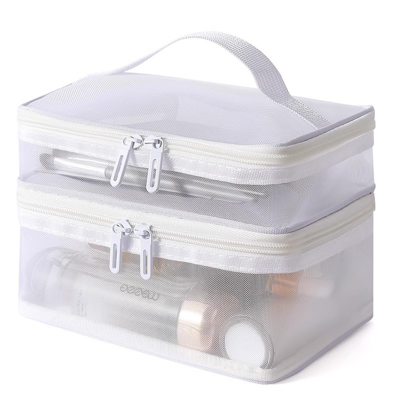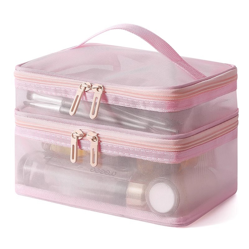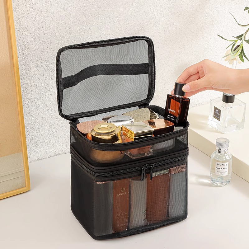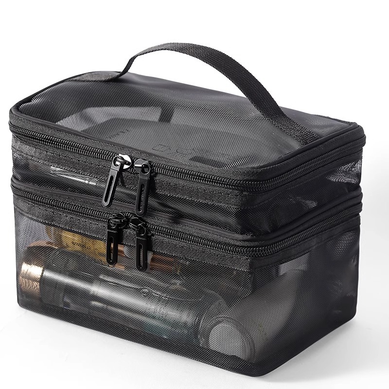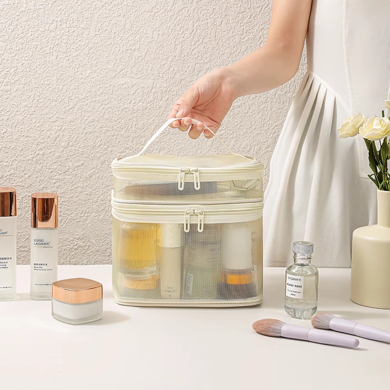 나일론 메쉬 더블 레이어 화장품 가방 여성의 대용량 휴대용 여행 화장품 세척 저장 가방 도매 인쇄 로고스토어 가기