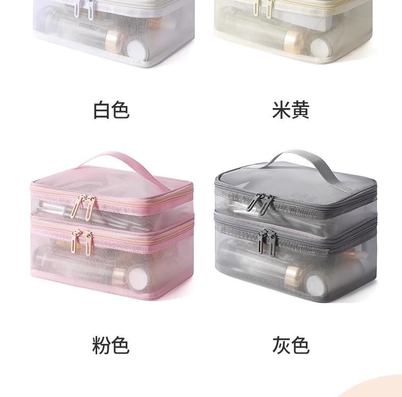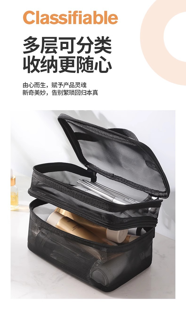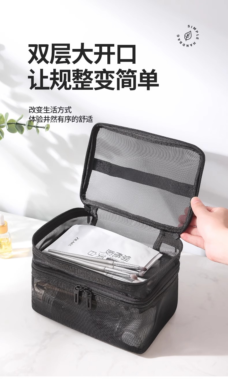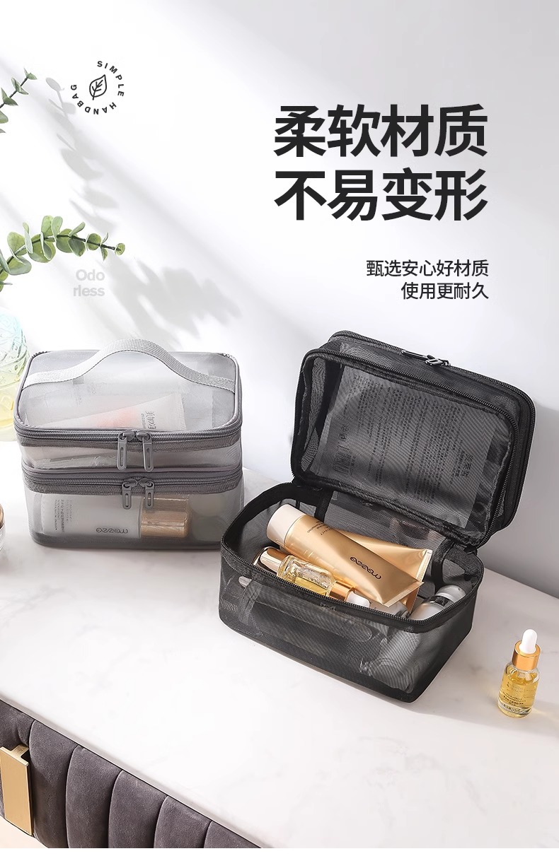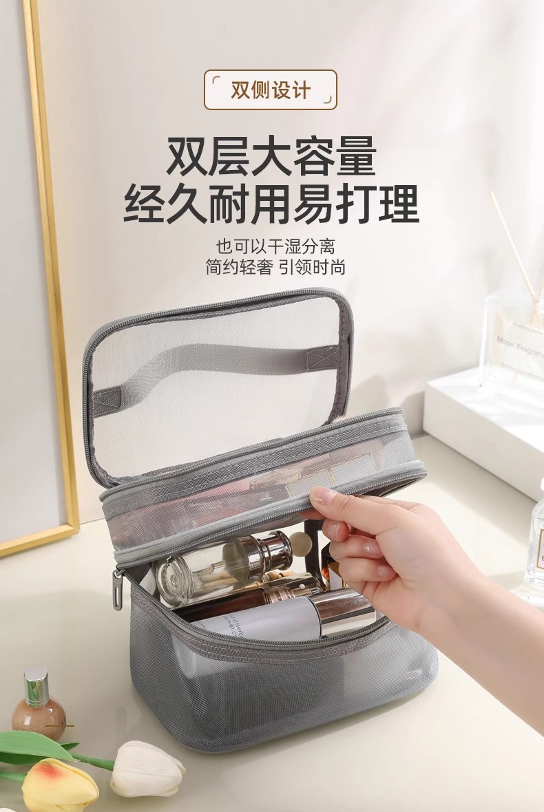 나일론 메쉬 더블 레이어 화장품 가방 여성의 대용량 휴대용 여행 화장품 세척 저장 가방 도매 인쇄 로고