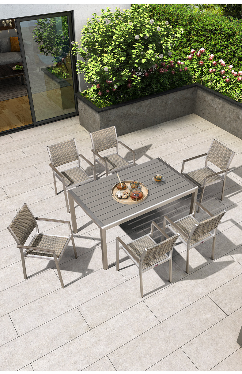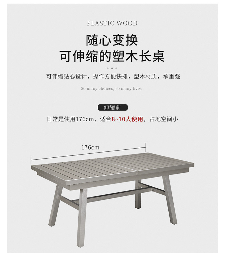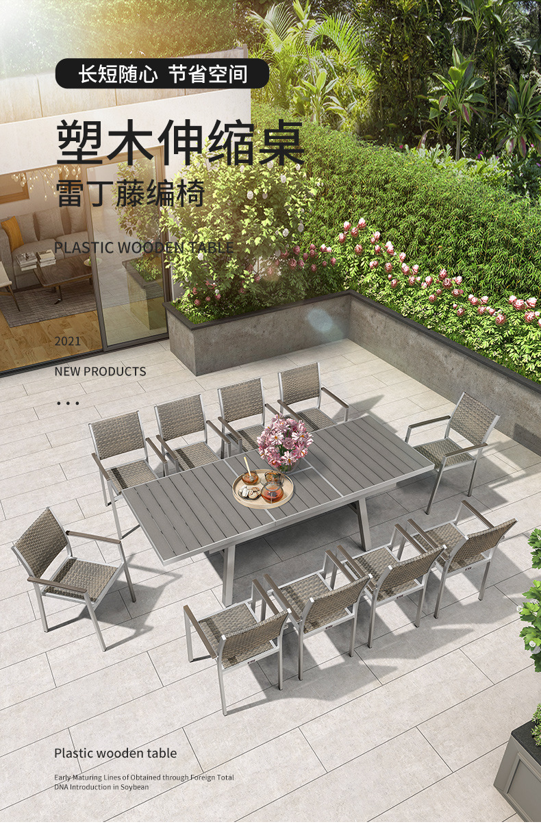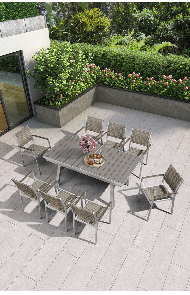 빌라 정원 플라스틱 목재 식탁 및 의자 야외 테라스 야외 식탁 발코니 레저 테이블 및 의자 정원 확장형 테이블