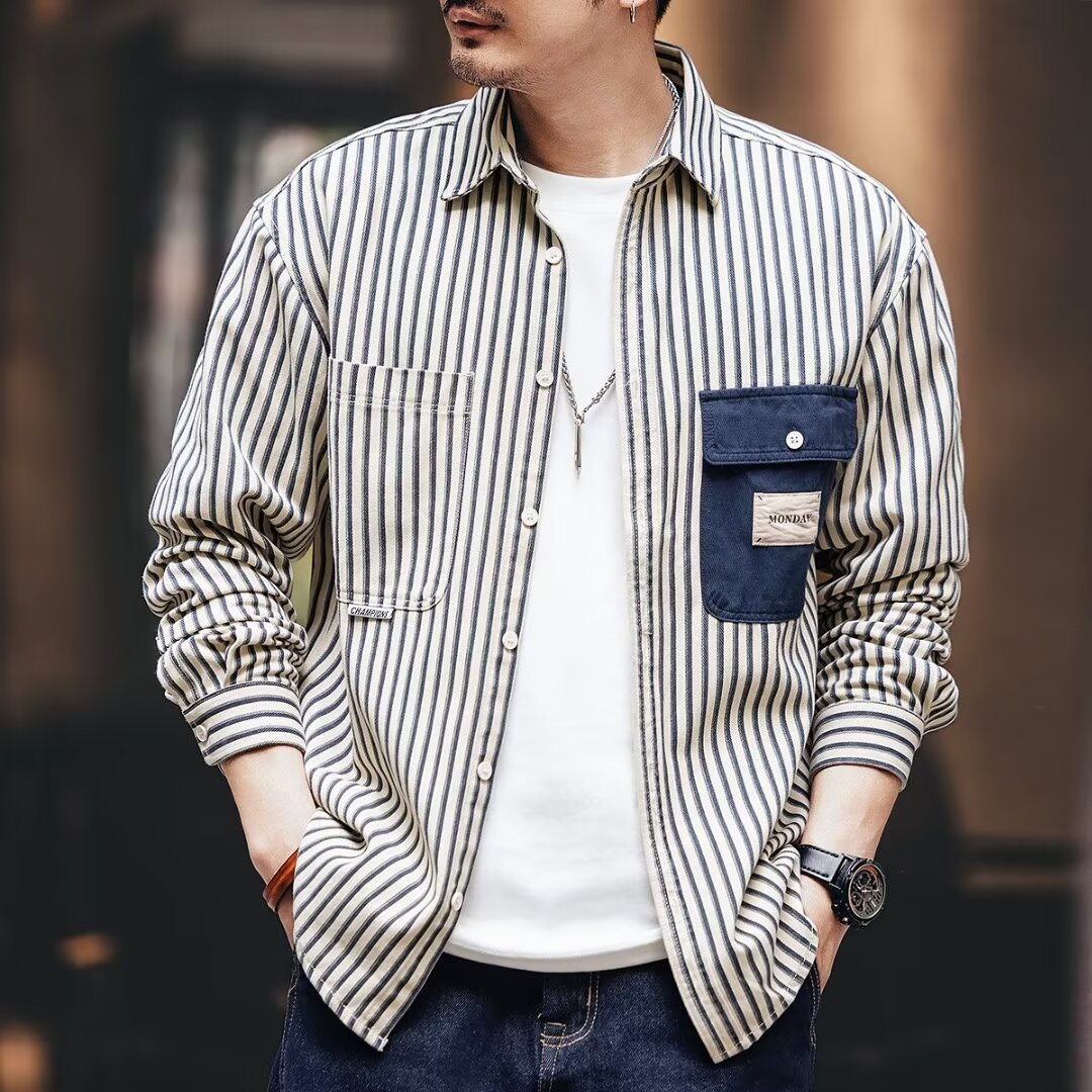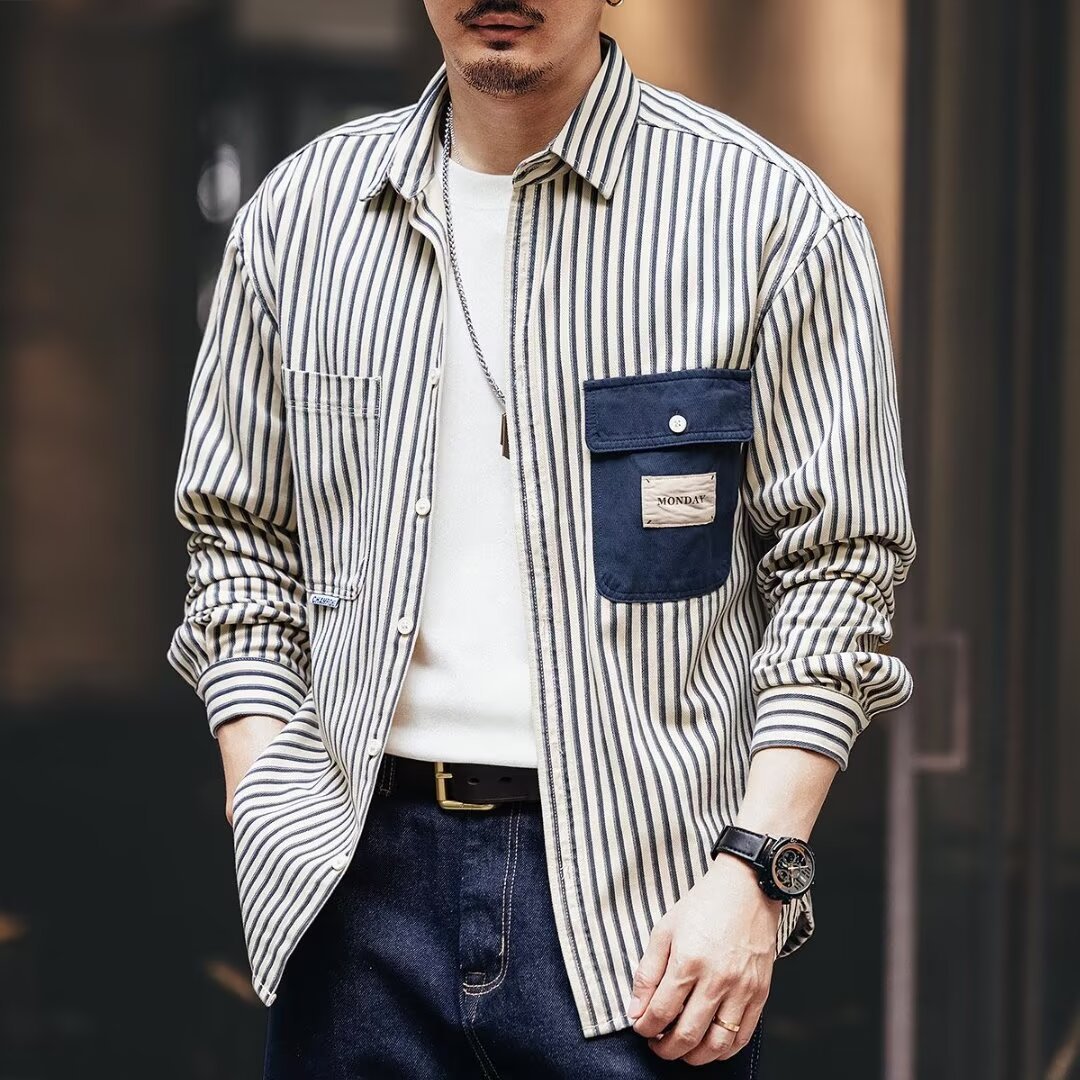 가을 하이 엔드 센스 캐주얼 스트라이프 셔츠 남자 한국식 하이 스트리트 트렌디 브랜드 패셔너블 아웃 탑 재킷 라이트 성숙한 스타일