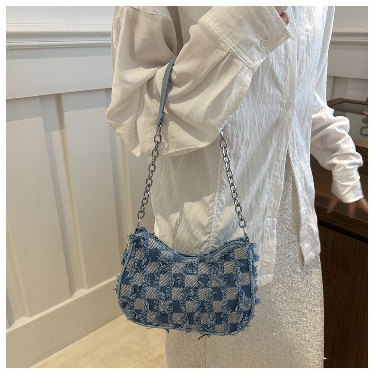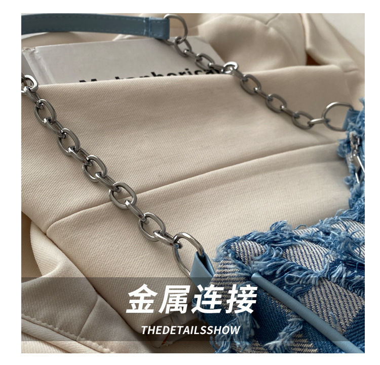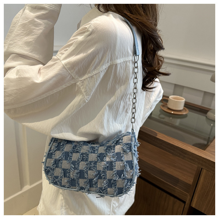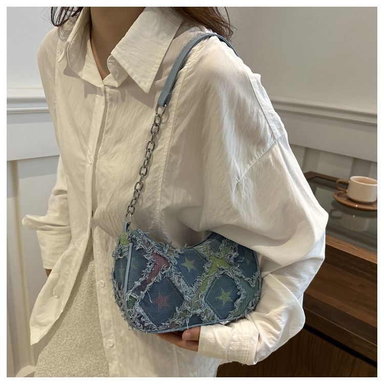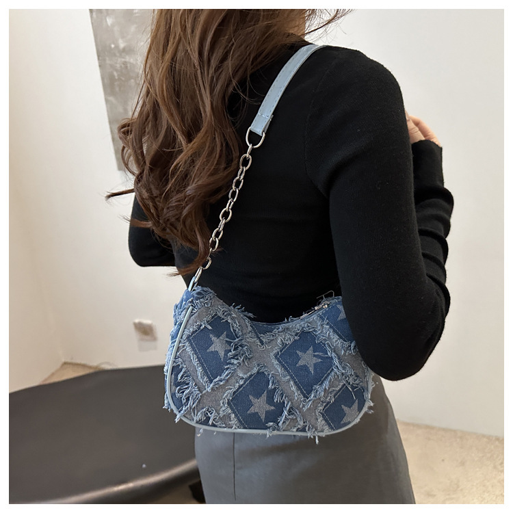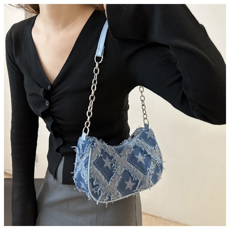 2024 세련된 패션 디자인 캐주얼 쿨 그라디언트 스타 데님 체인 크로스 바디 어깨 작은 광장 여성용 가방스토어 가기