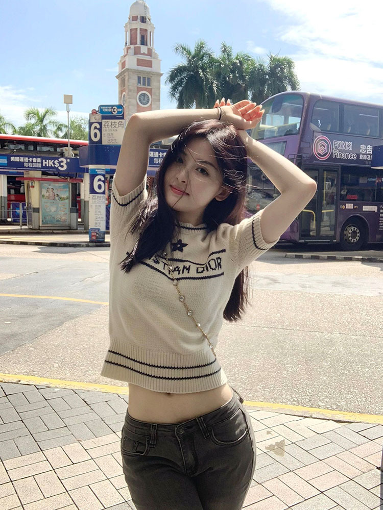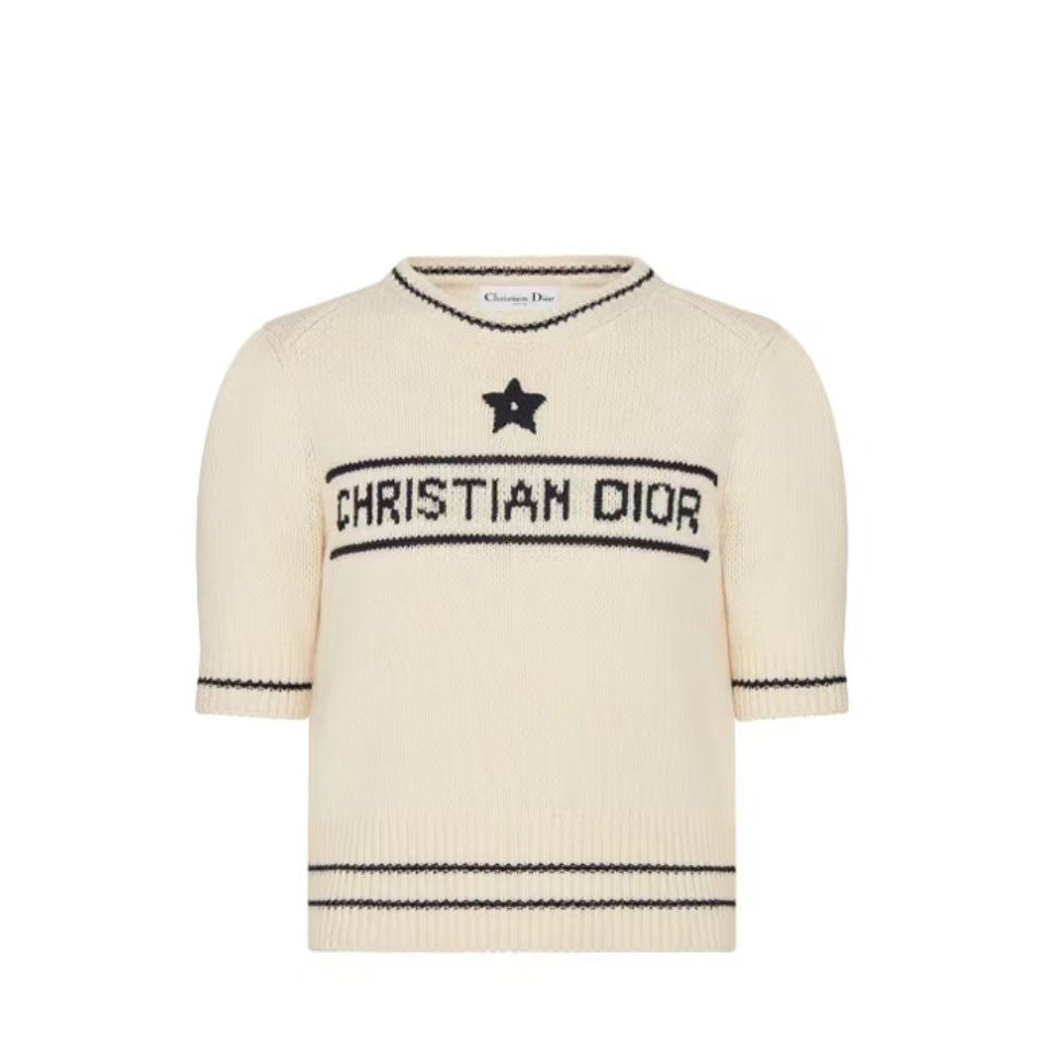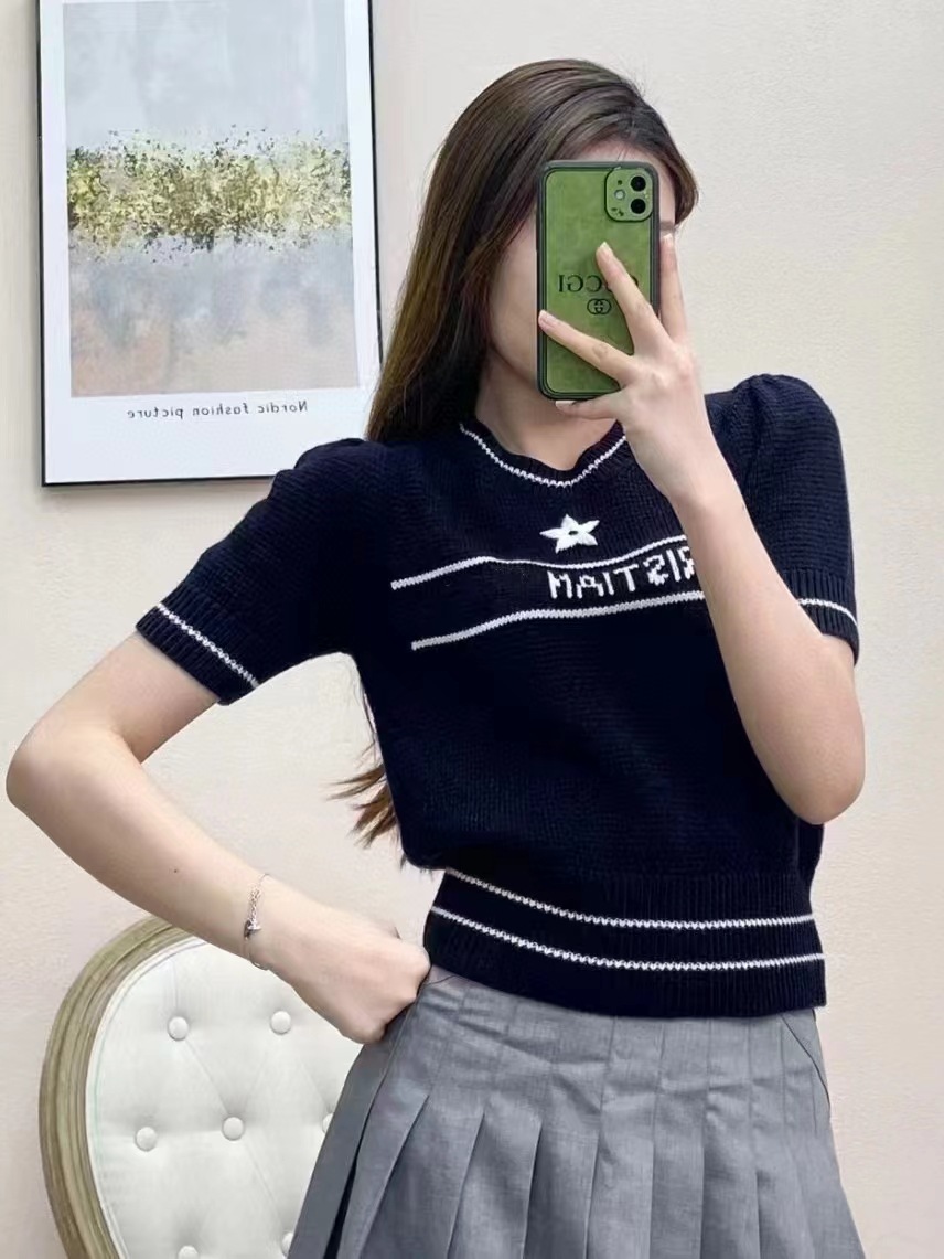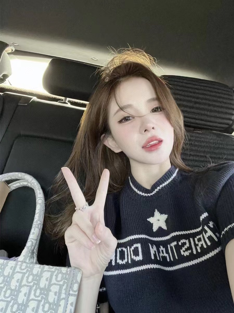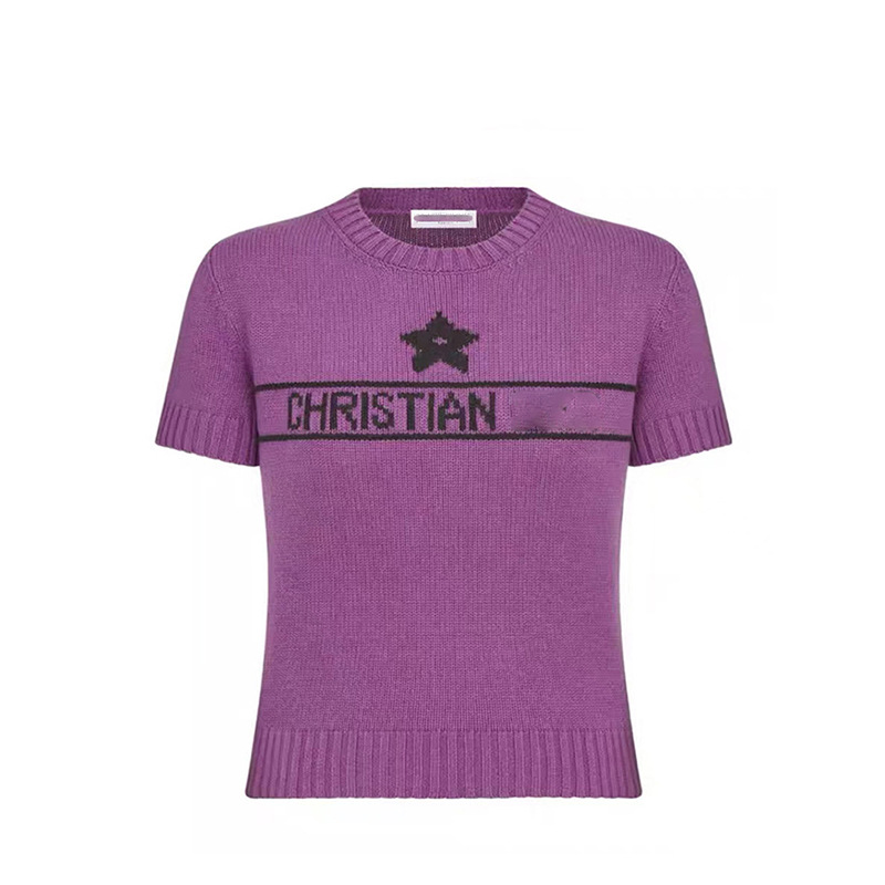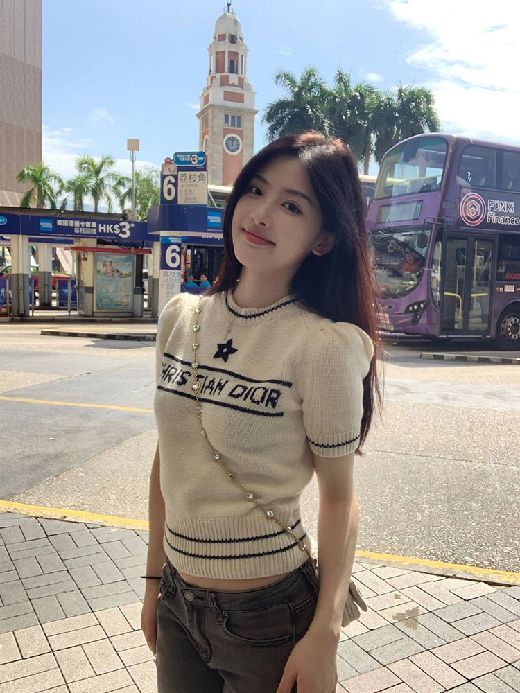여름 새로운 다섯개 별 알파벳 자카드 반팔 여성 스웨터 탑 한국식 라운드 넥 퍼프 슬리브 얇은 스웨터스토어 가기