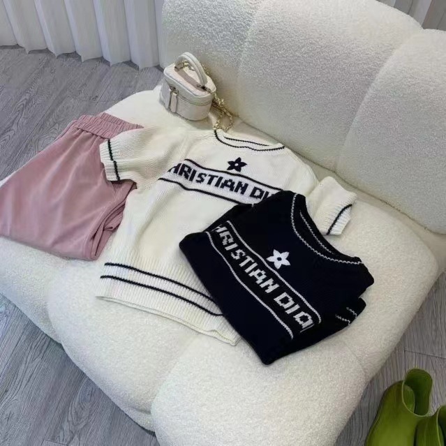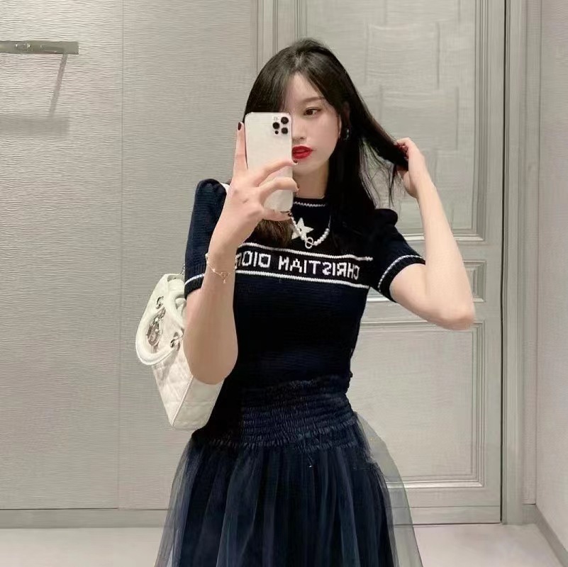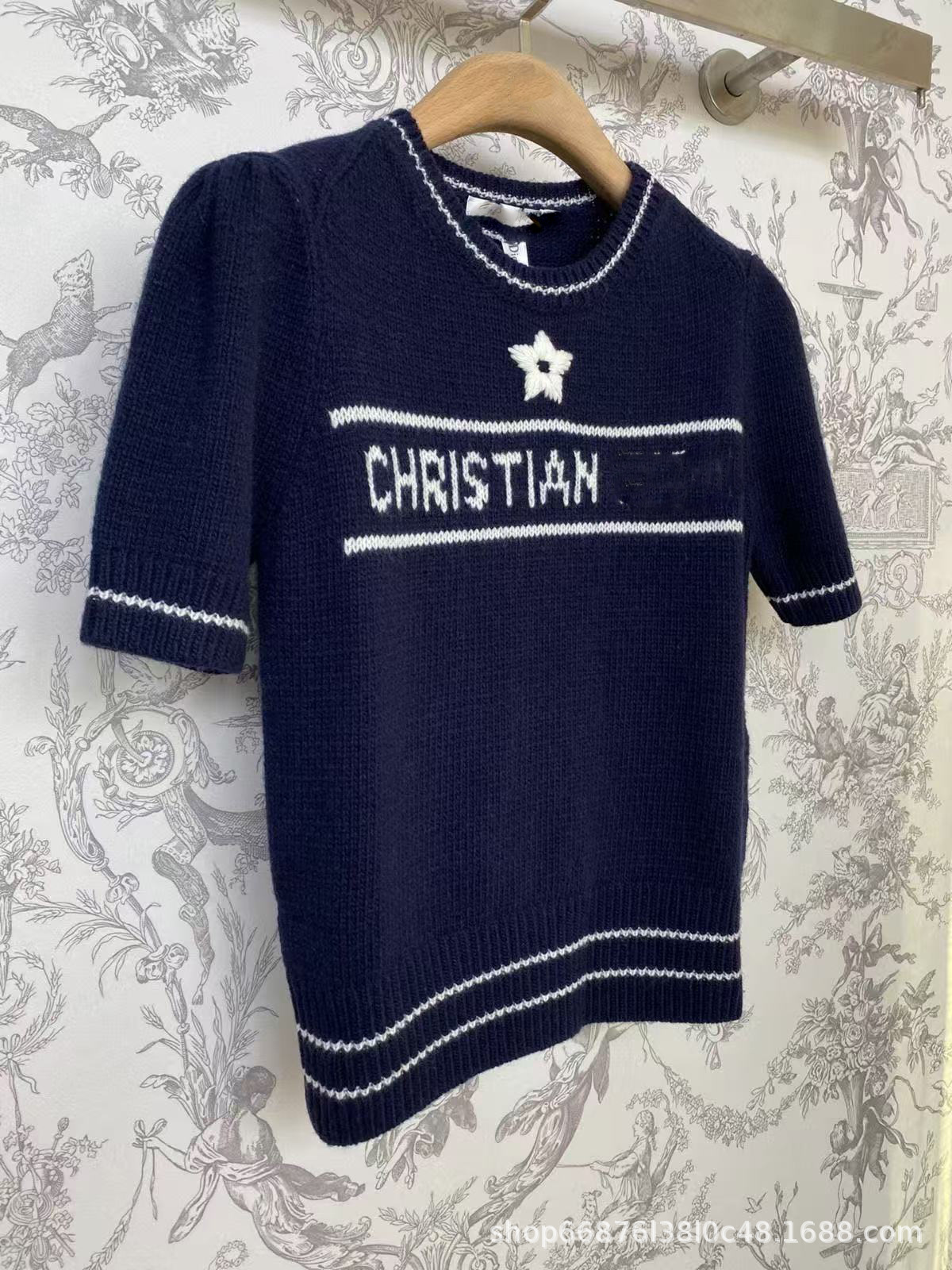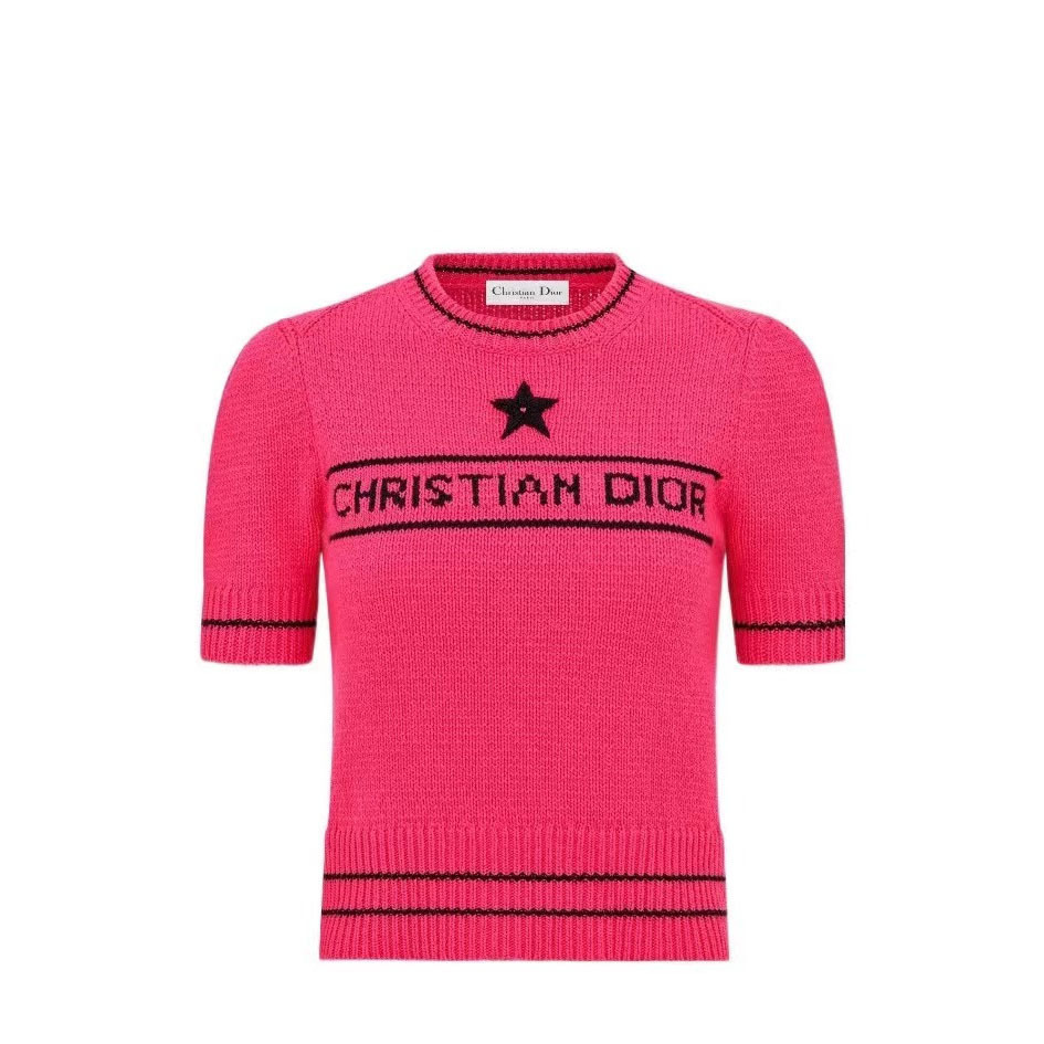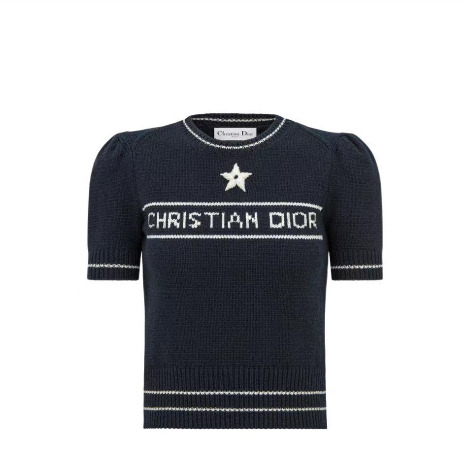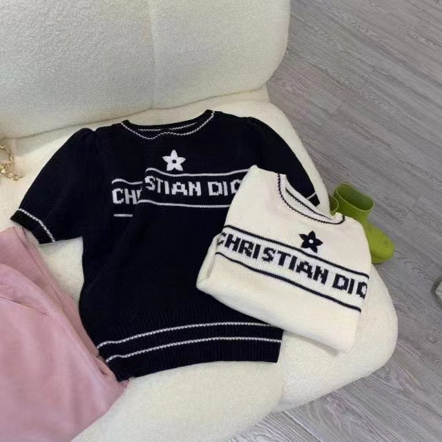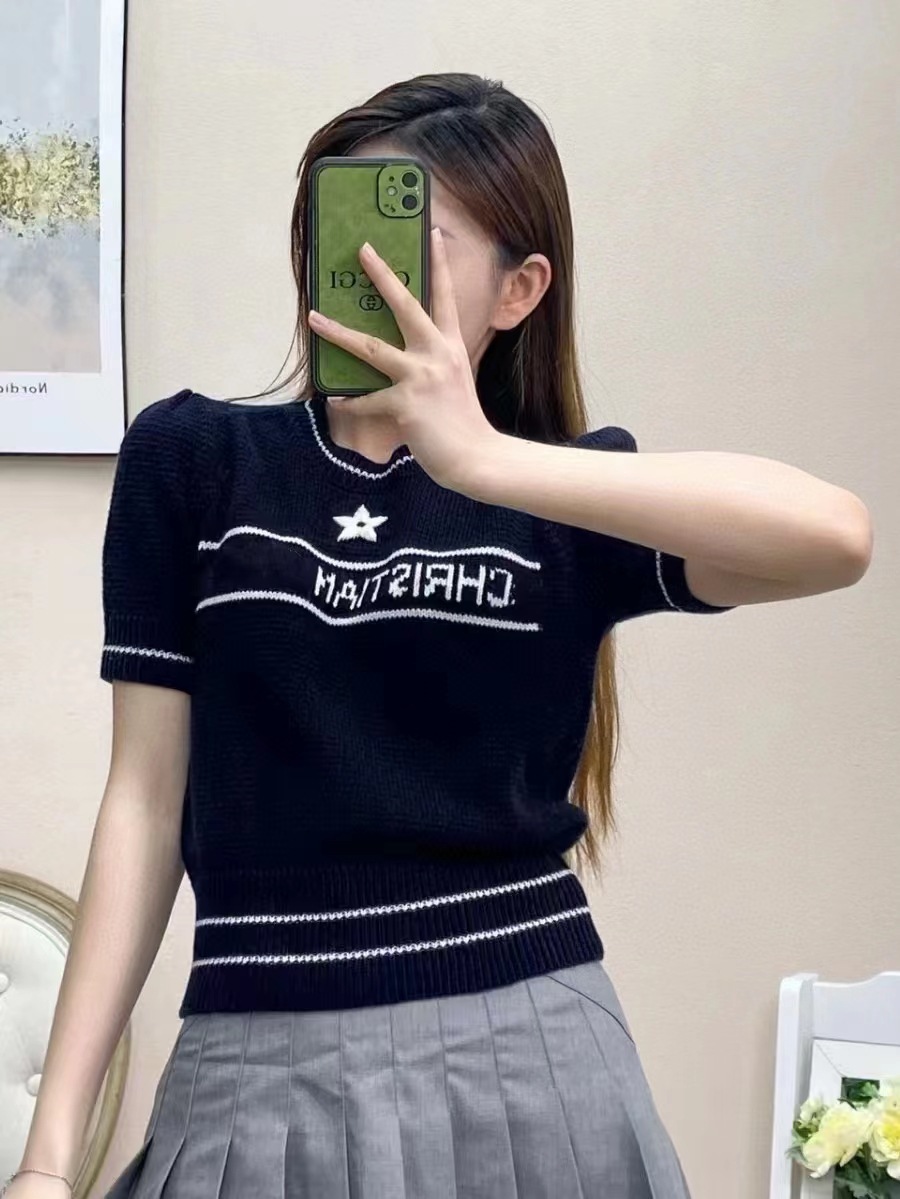 여름 새로운 다섯개 별 알파벳 자카드 반팔 여성 스웨터 탑 한국식 라운드 넥 퍼프 슬리브 얇은 스웨터스토어 가기