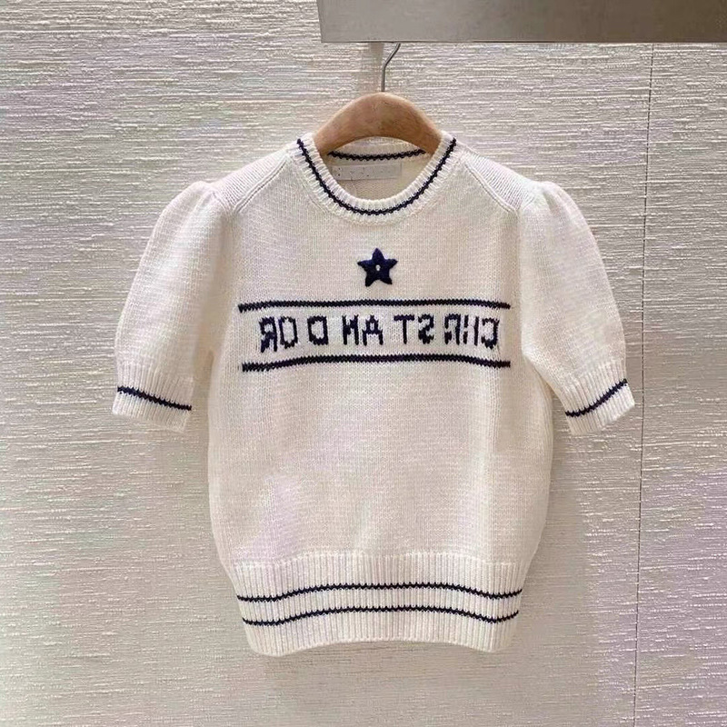 여름 새로운 다섯개 별 알파벳 자카드 반팔 여성 스웨터 탑 한국식 라운드 넥 퍼프 슬리브 얇은 스웨터