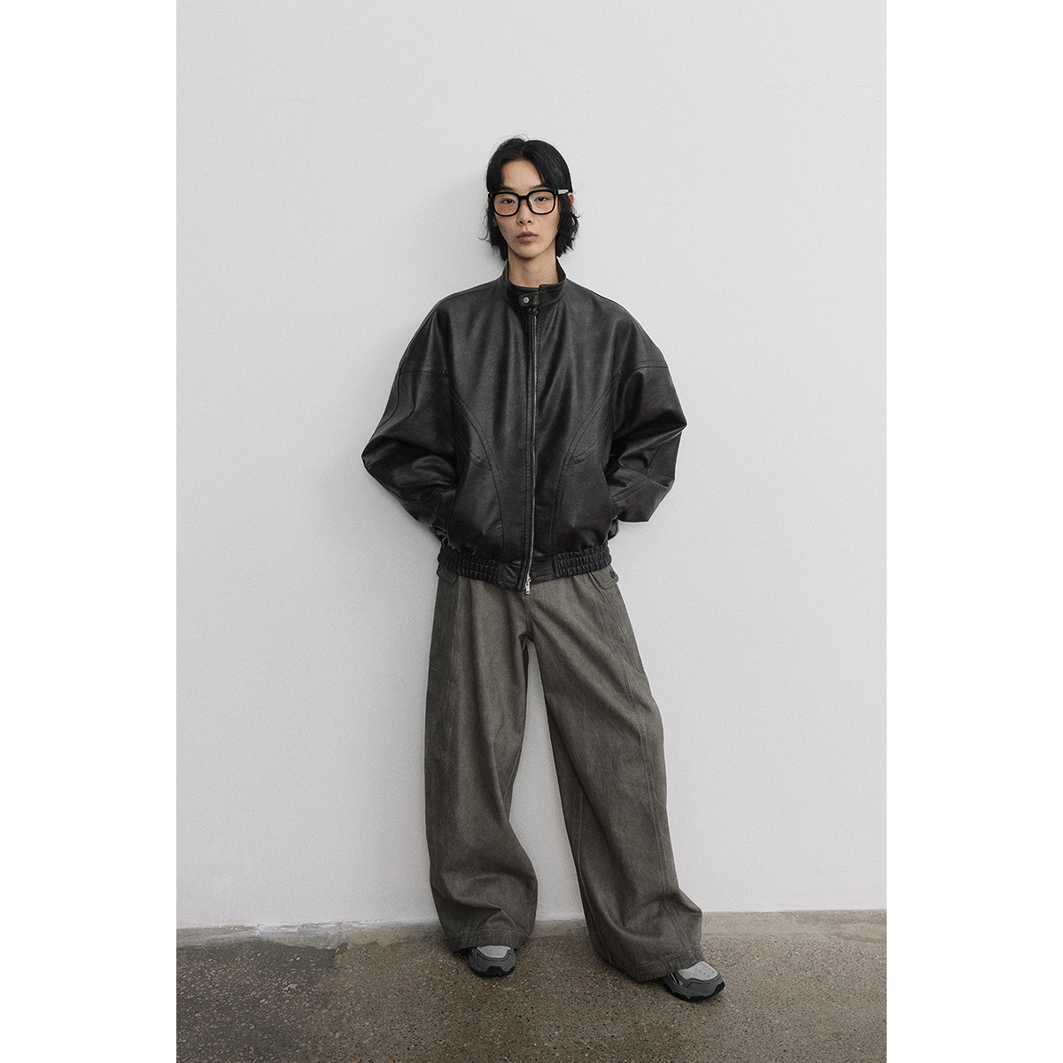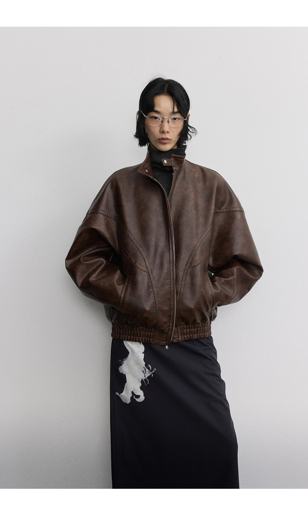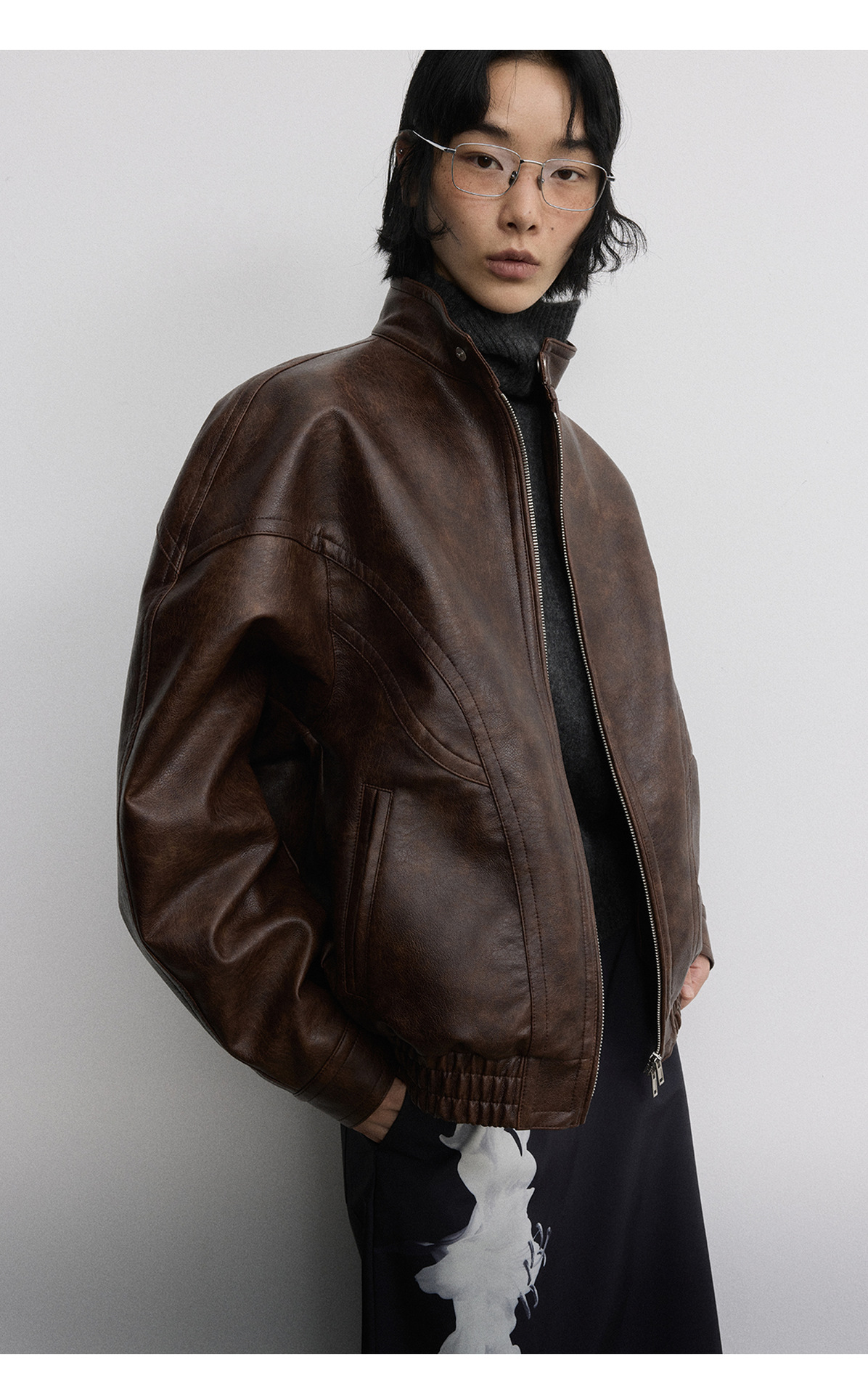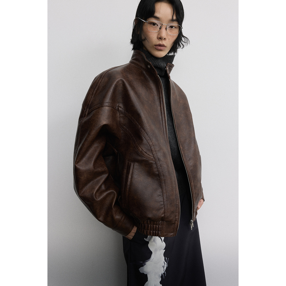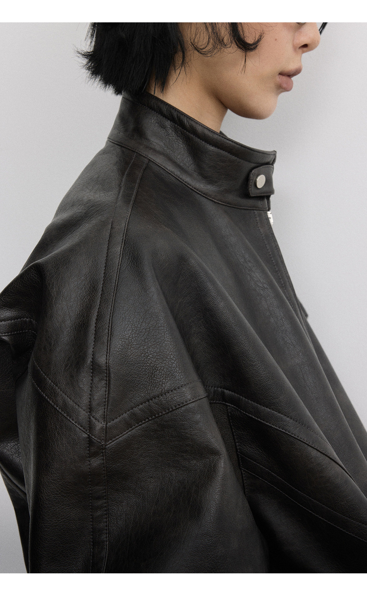 [시간 방문] 여성을위한 새로운 레트로 스탠드 칼라 스티치 다목적 pu 가죽 자켓 느슨한 긴팔 자켓 V7712