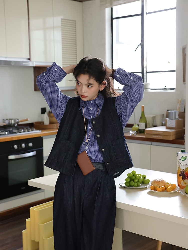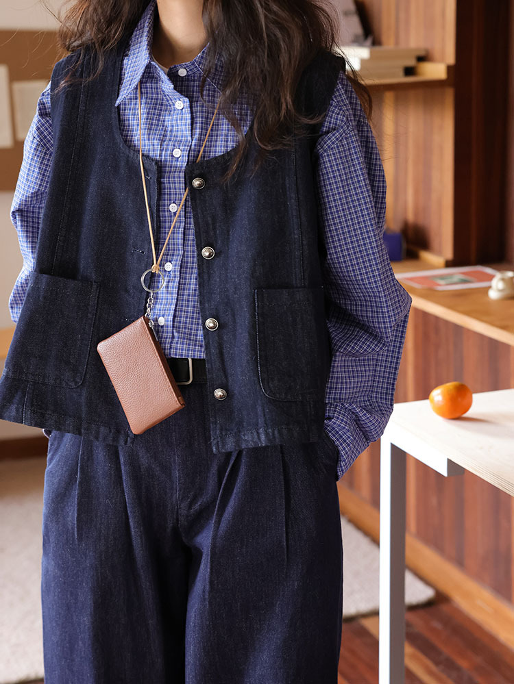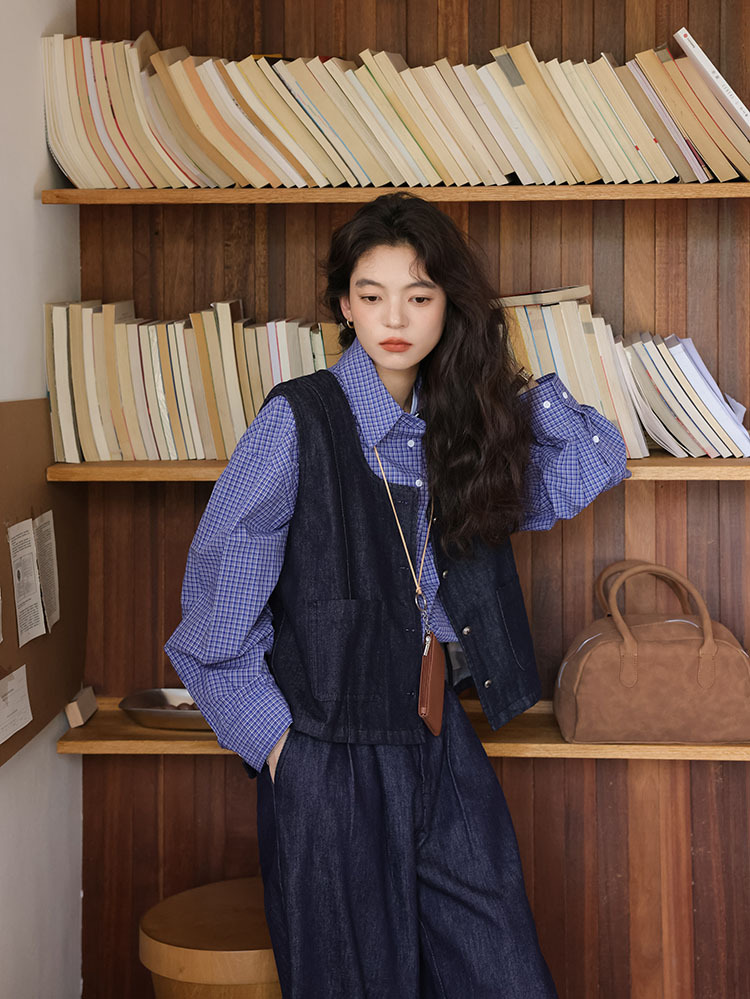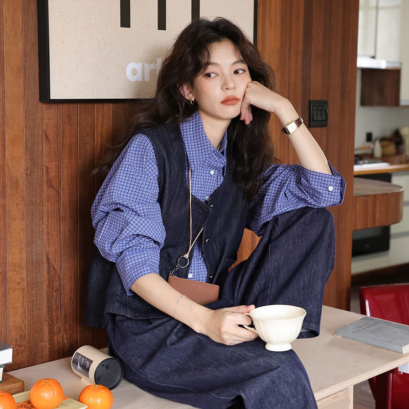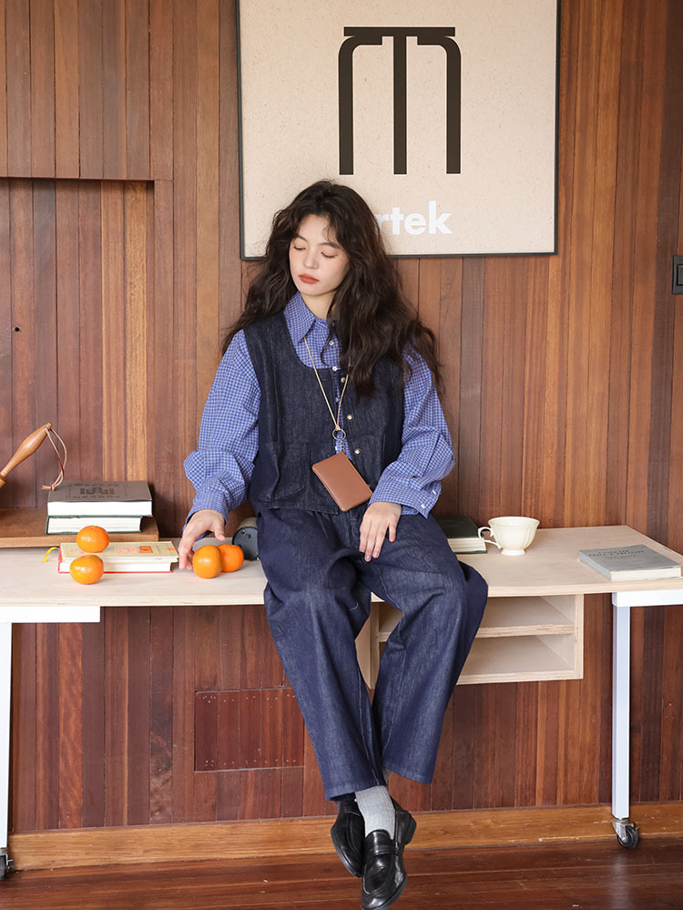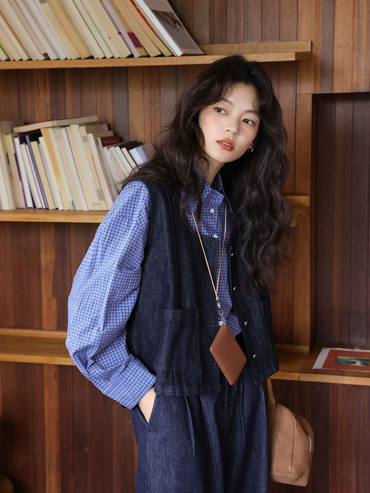 2025년 초가을 새로운 복고풍 홍콩 스타일 U 넥 딥 블루 레이어드 데님 조끼 여성 탑의 실제 샷스토어 가기