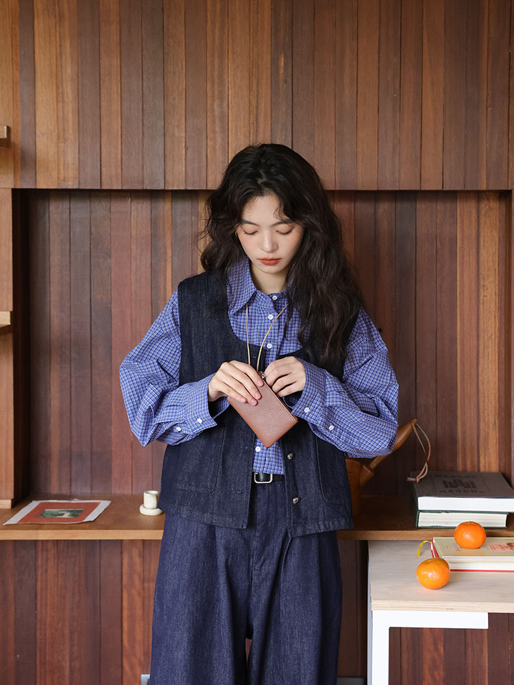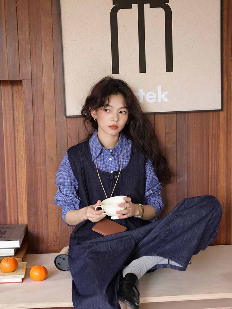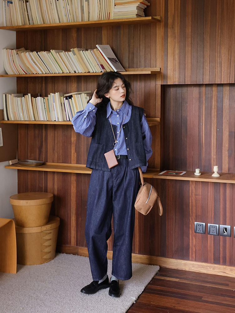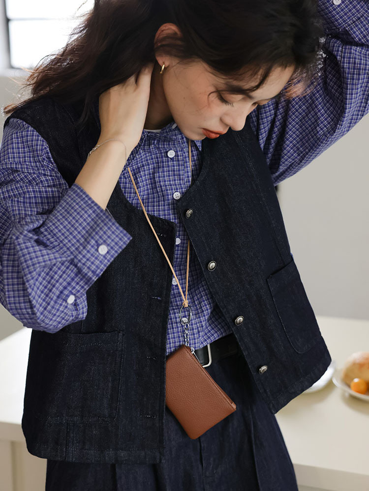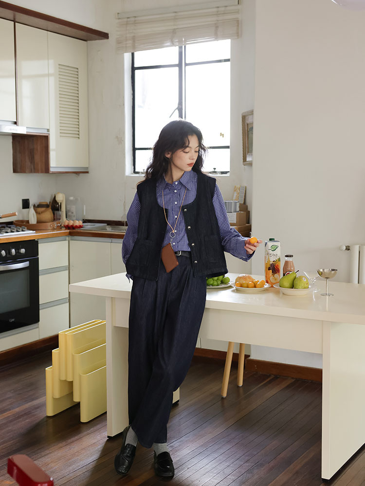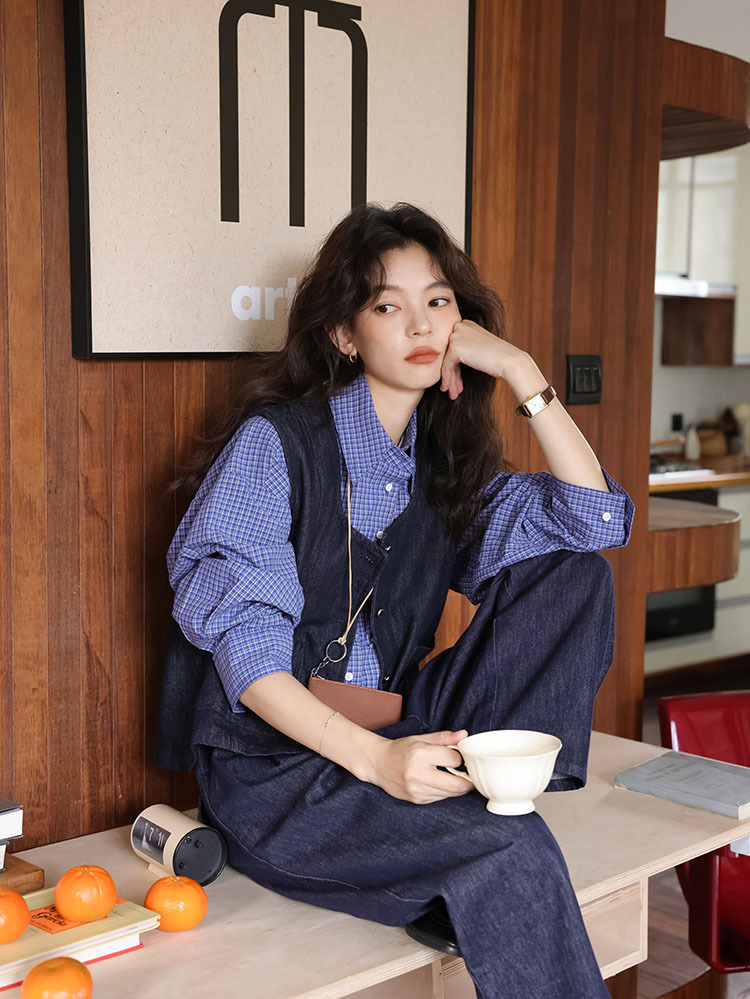 2025년 초가을 새로운 복고풍 홍콩 스타일 U 넥 딥 블루 레이어드 데님 조끼 여성 탑의 실제 샷스토어 가기