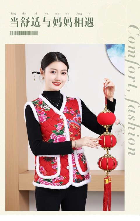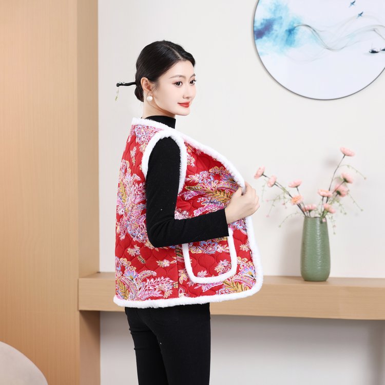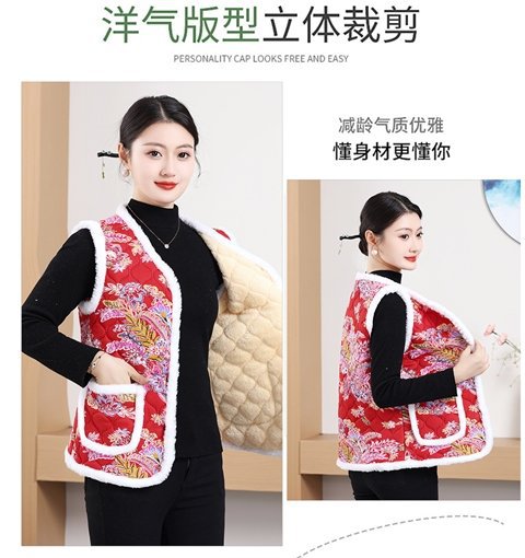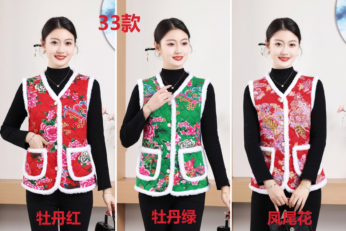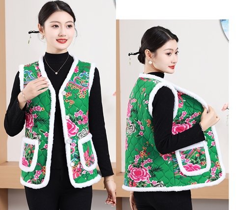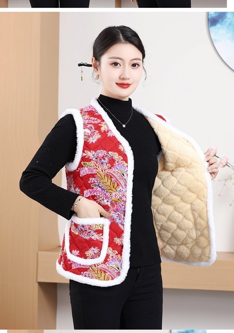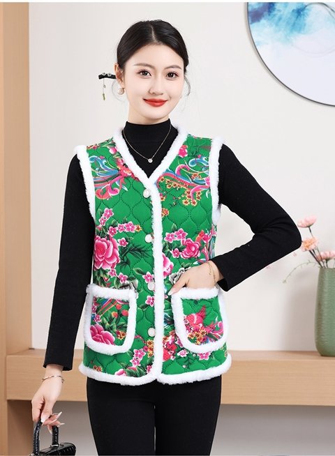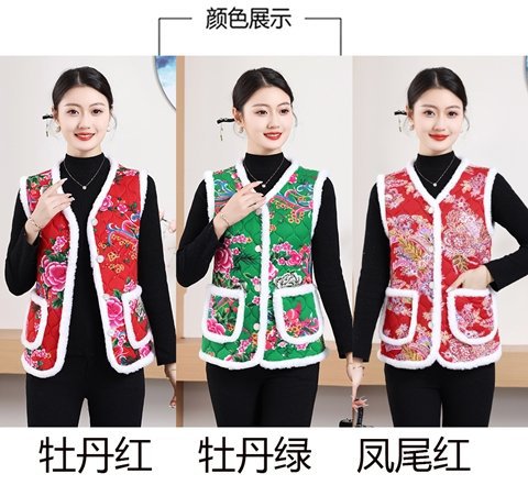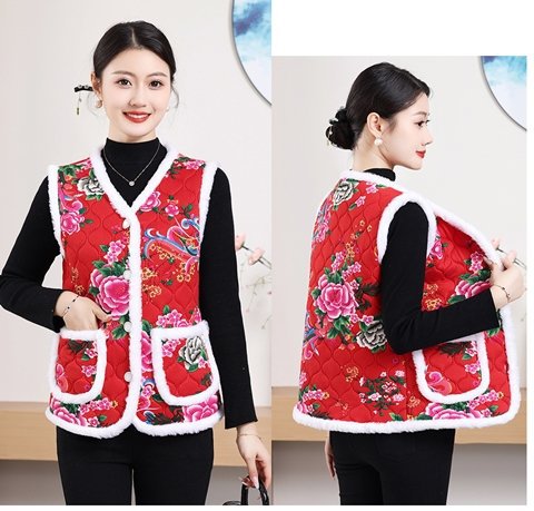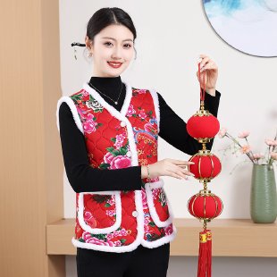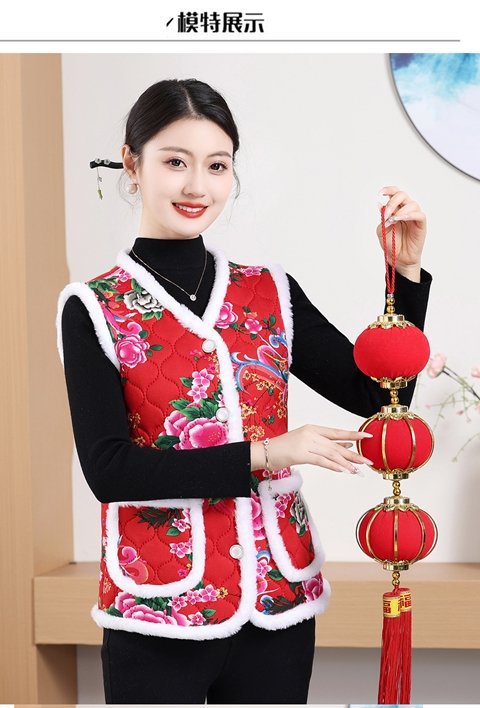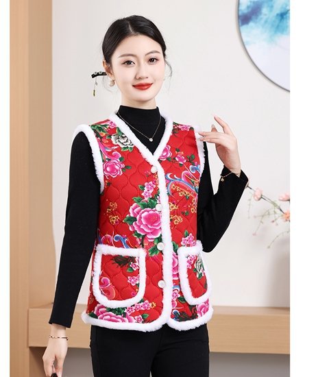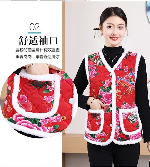 가을과 겨울 새로운 동북 큰 꽃 면화 기모 두꺼운 조끼 여성 신년 공연 의류 패션 서양식 따뜻한스토어 가기