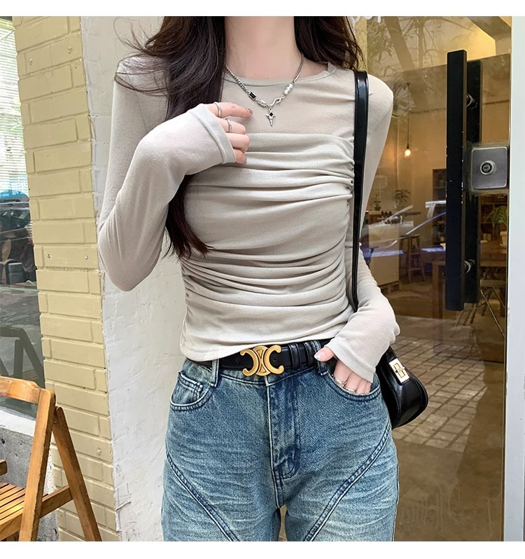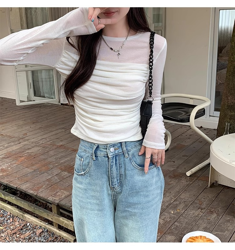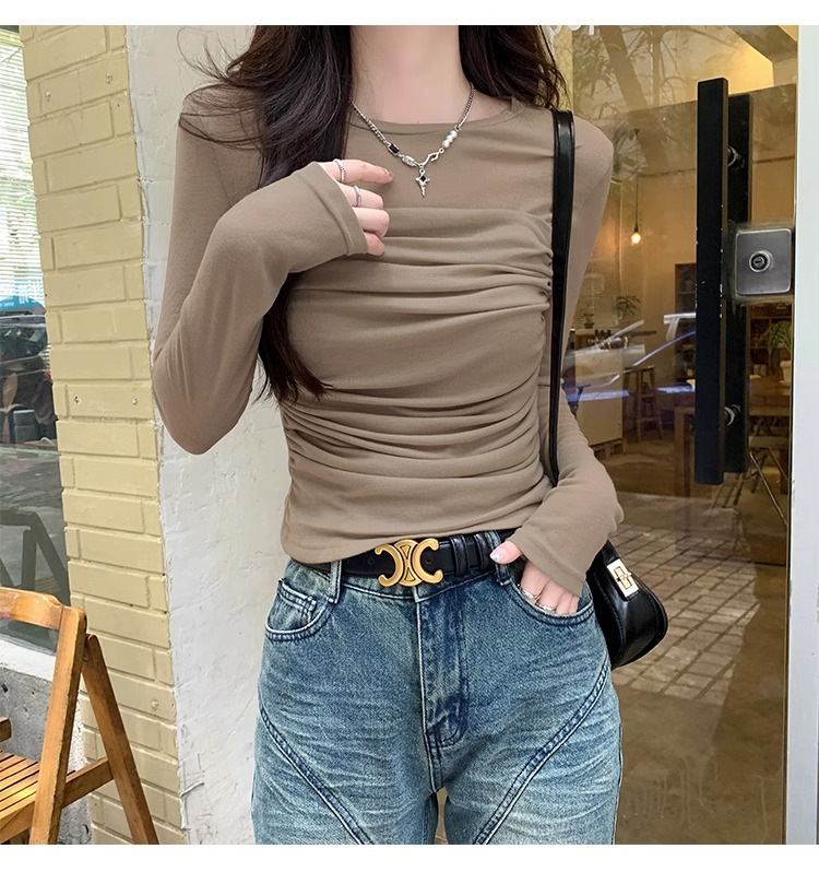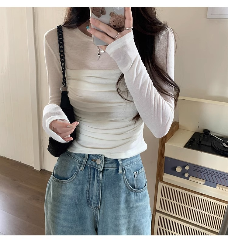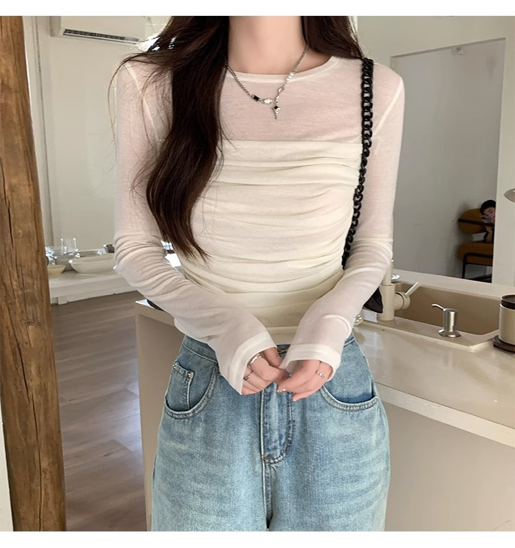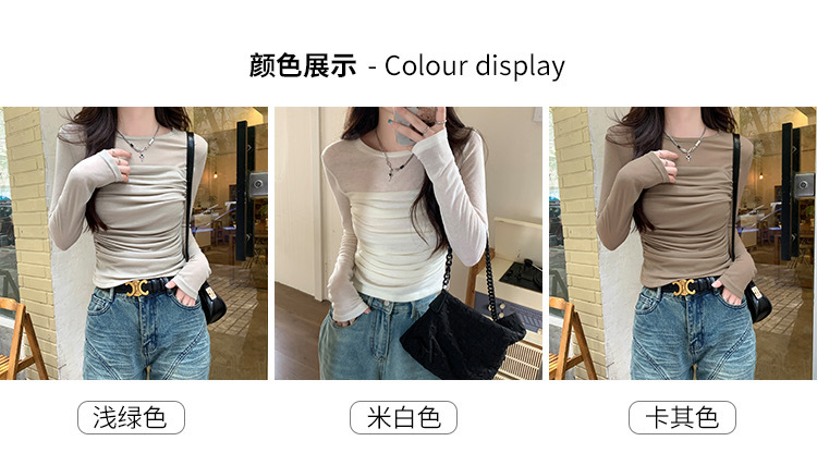 메시 솔리드 컬러 바느질 긴팔 티셔츠 2024 이른 가을 새 라운드 넥 내부 탑 여성용 슬림 핏 베이스 셔츠스토어 가기