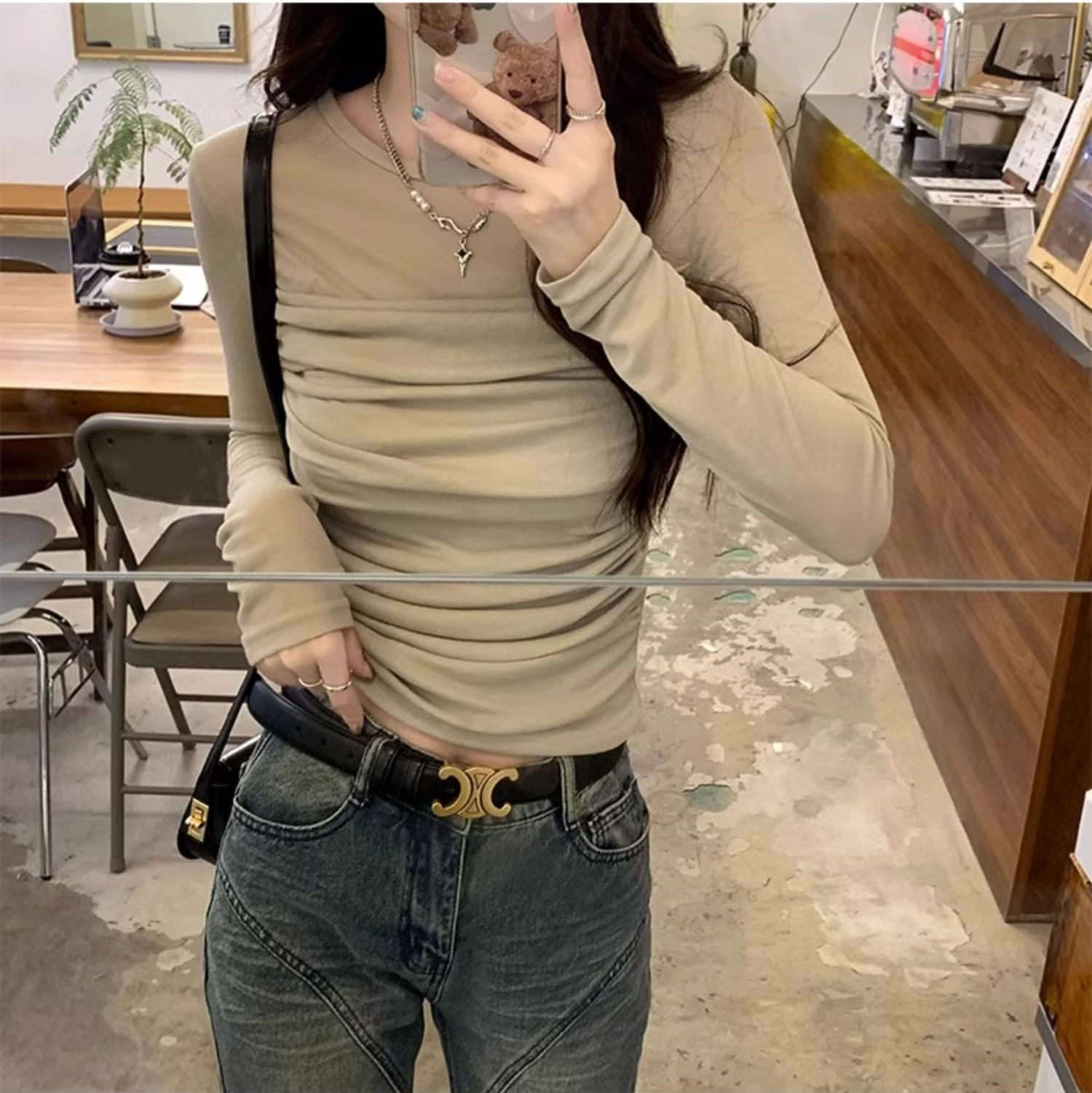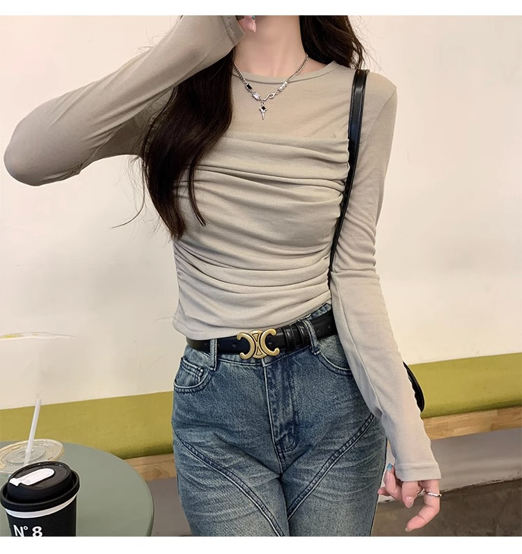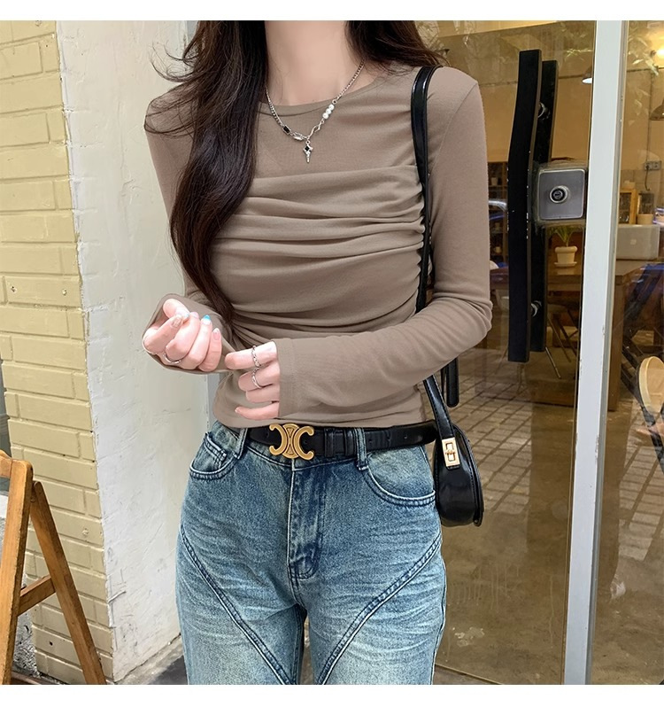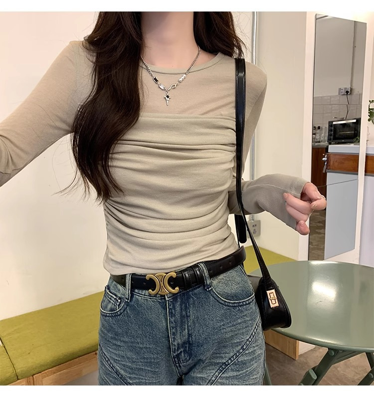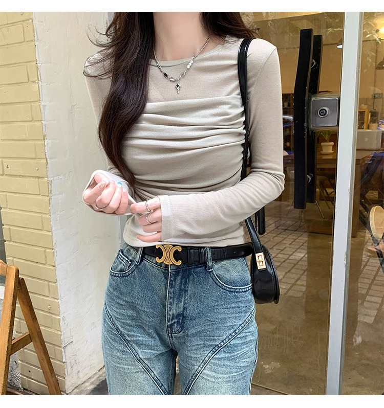 메시 솔리드 컬러 바느질 긴팔 티셔츠 2024 이른 가을 새 라운드 넥 내부 탑 여성용 슬림 핏 베이스 셔츠스토어 가기