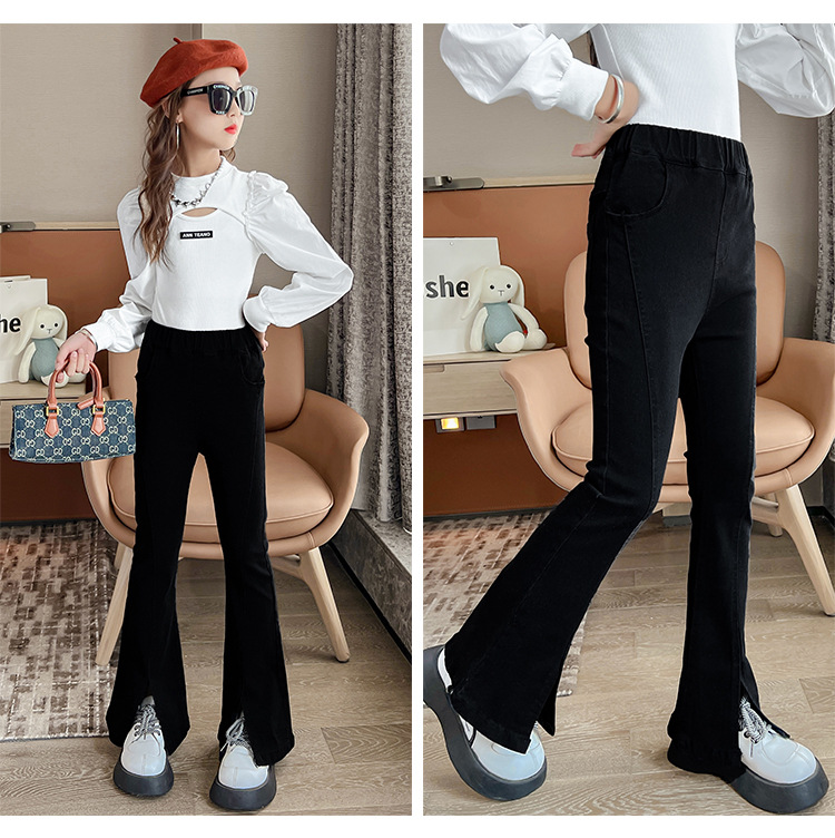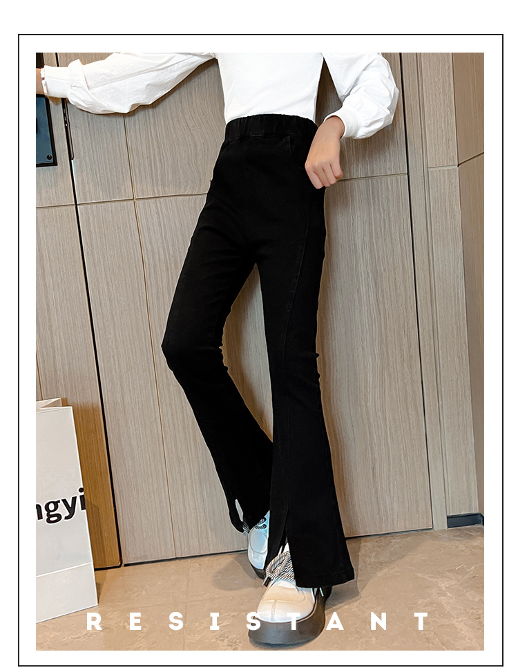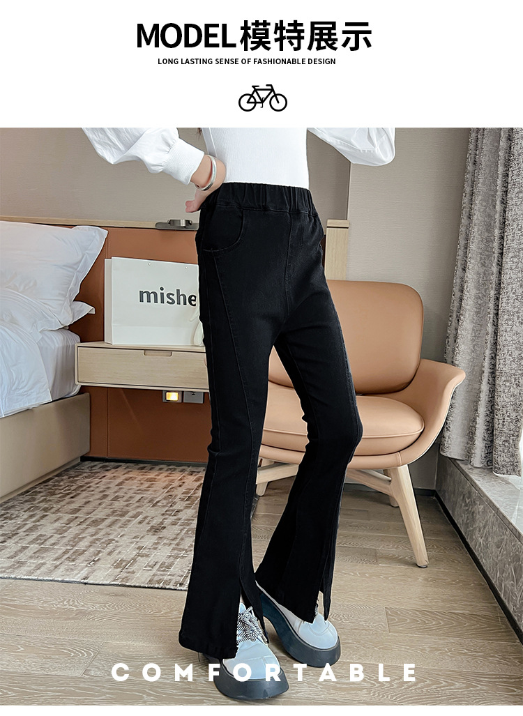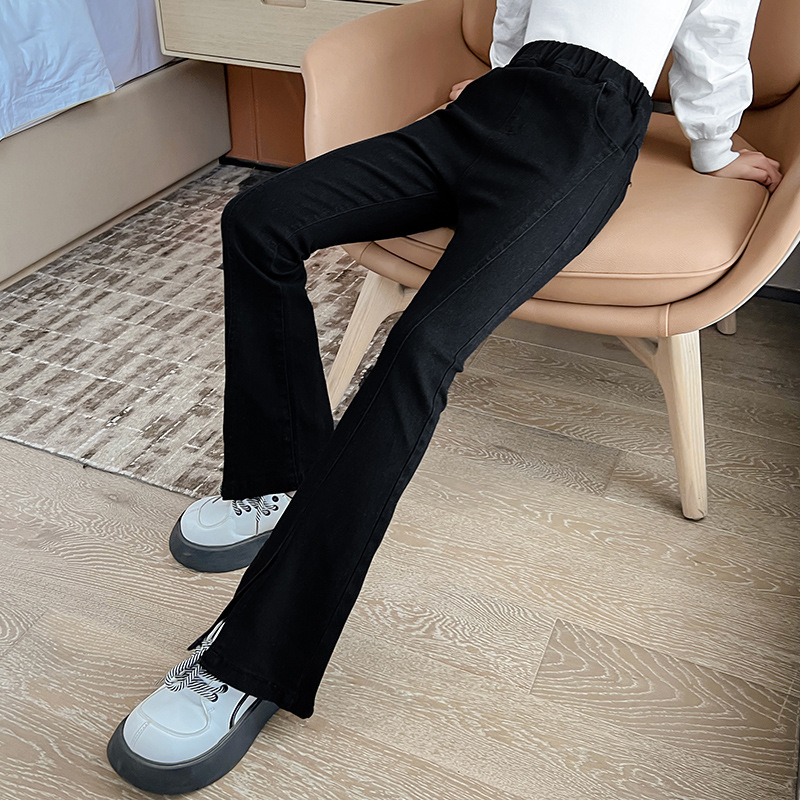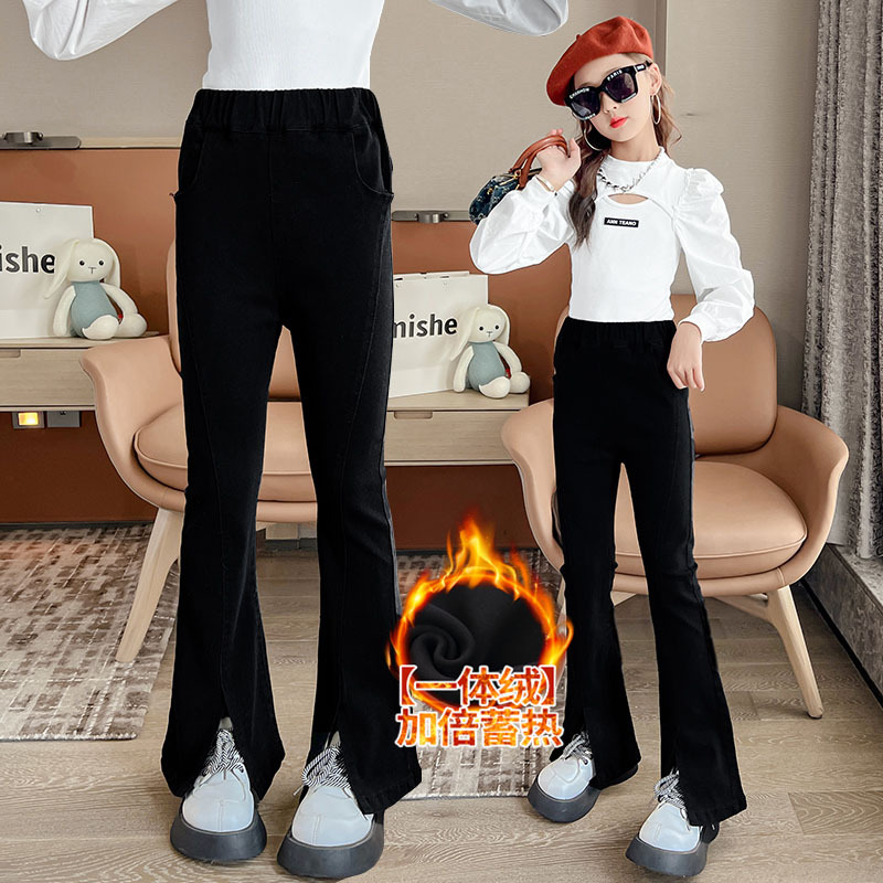 소녀의 검은색 신축성 있는 슬릿 플레어 팬츠 가을 겨울 새 청바지 어린 소녀의 벨벳 두꺼운 슬림 긴 바지스토어 가기