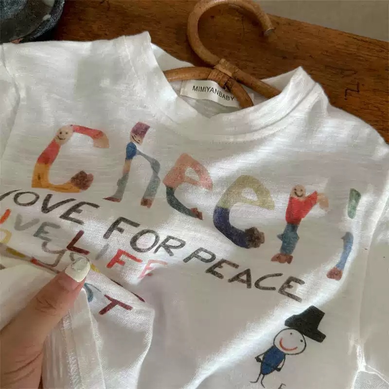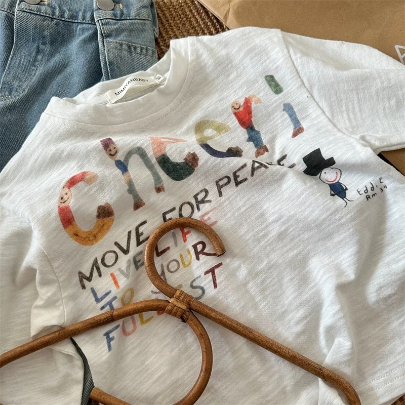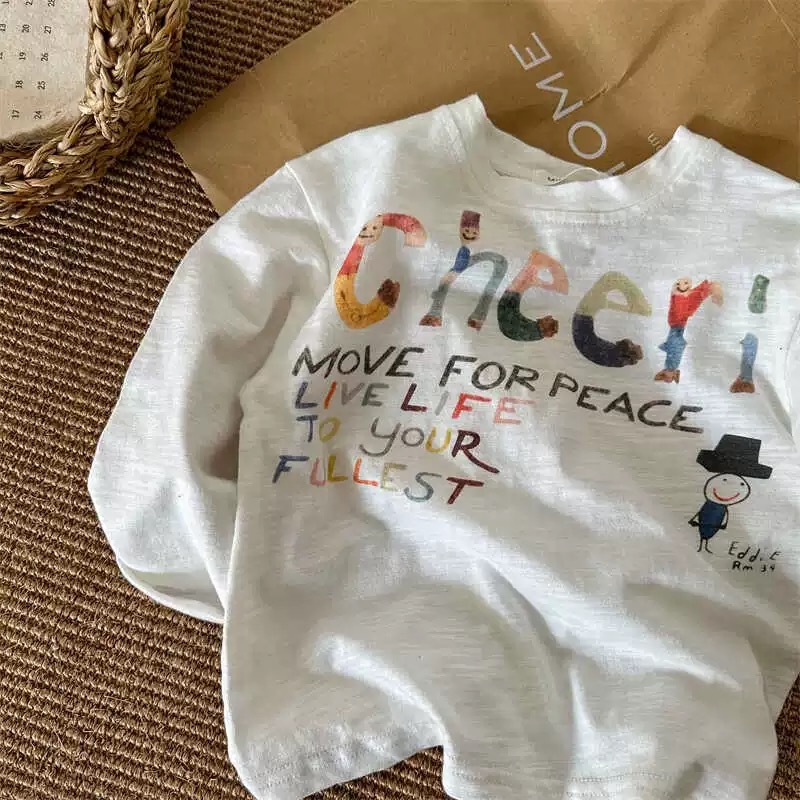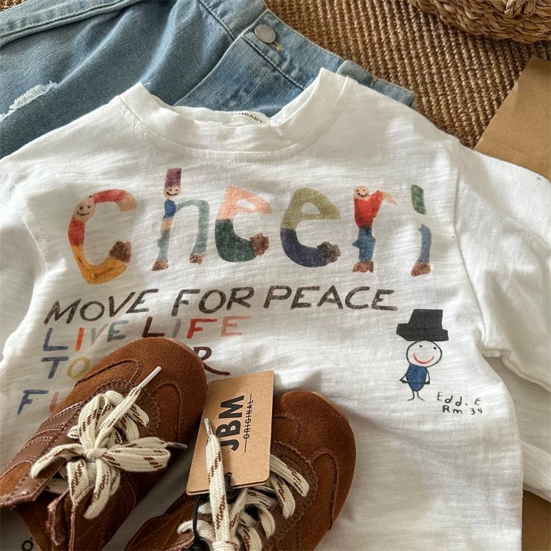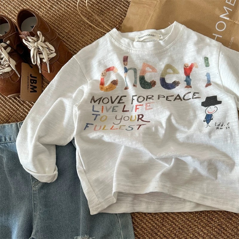 어린 이용 긴팔 슬럽 코튼 티셔츠 봄과 가을 일본 편지 인쇄 아기의 순수면 트렌디베이스 셔츠 소년 소녀 용 티셔츠