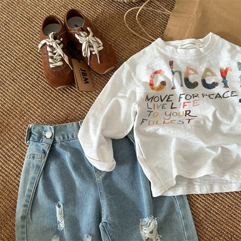 어린 이용 긴팔 슬럽 코튼 티셔츠 봄과 가을 일본 편지 인쇄 아기의 순수면 트렌디베이스 셔츠 소년 소녀 용 티셔츠스토어 가기