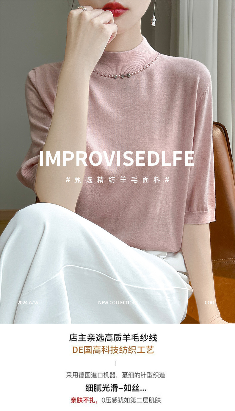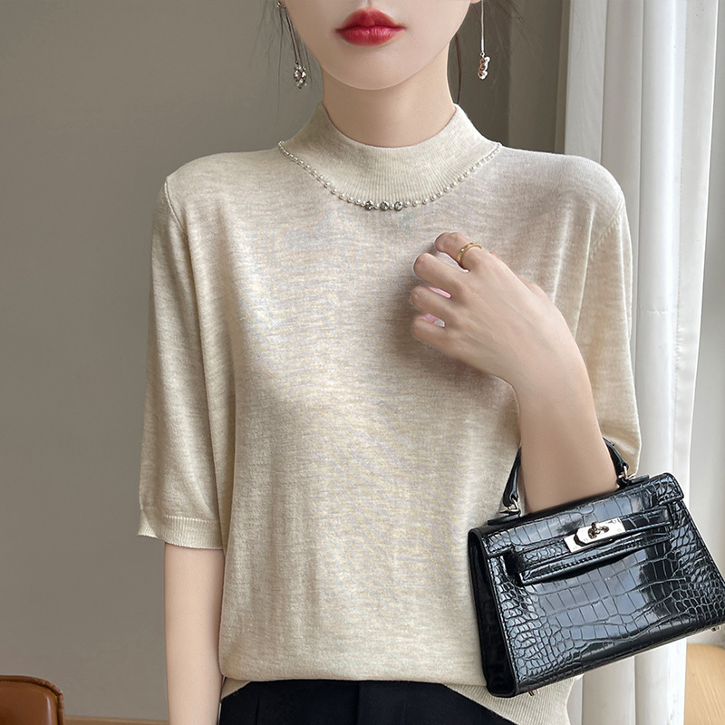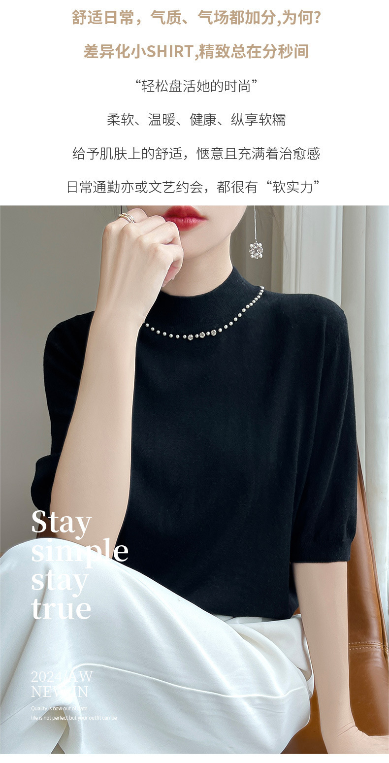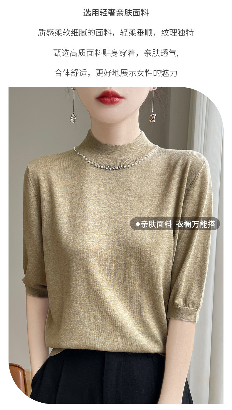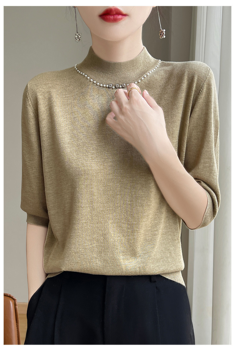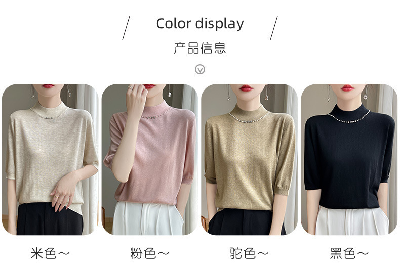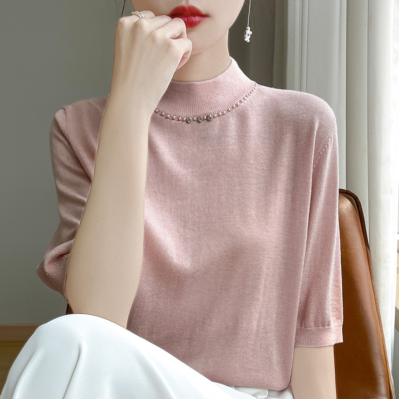 가벼운 럭셔리 니트 하프 하이 칼라 미드 슬리브 베이스 셔츠 여성의 가을 새로운 서양 스타일 내부 하프 슬리브 탑 니트 도매